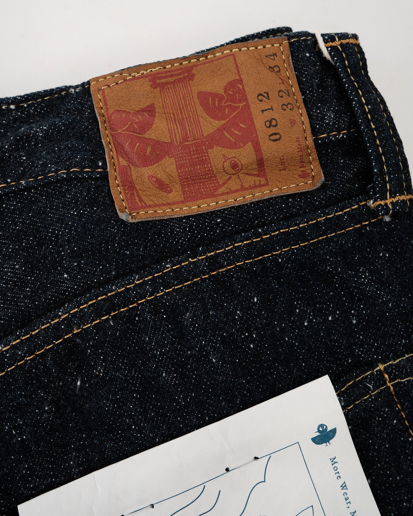 Numero di stile: 0812 Denim nep da 16oz con una finitura testurizzata ispirata al vintage I fili di ordito mescolano fibre di cotone corte per un aspetto robusto e irregolare I fili di trama sono filati usando la tecnica "gara-bo" per una sensazione rustica, come se fossero filati a mano Tinti in corda con indaco puro al 100% per sfumature profonde e ad alto contrasto nel tempo Tessuti su un telaio automatico Toyoda GL8 degli anni '50 per una struttura traspirante e testurizzata Non sanforizzati ma sciacquati per preservare la texture grezza garantendo al contempo comfort Selvedge blu-verde “MIMI” di OMOTO per un dettaglio autentico del denim Patch di pelle di pecora con marchio personalizzato per un tocco di pregio Rivetti nascosti e passanti per cintura rialzati per una maggiore durabilità Sacchetto della tasca a spina di pesce con registro di lavaggio per un'autenticità vintage