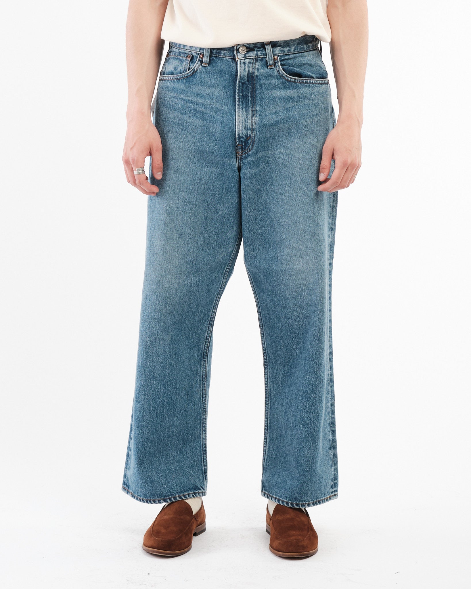 Realizzati con denim giapponese di alta qualità, questi pantaloni sono pre-lavati per ottenere una sensazione morbida e vissuta fin dal primo utilizzo. Il finish "Denim Used" fornisce un aspetto vintage e vissuto, aggiungendo carattere al capo. La classica costruzione a cinque tasche assicura praticità, mentre la chiusura con zip e l'hardware personalizzato migliorano la durabilità e la funzionalità.