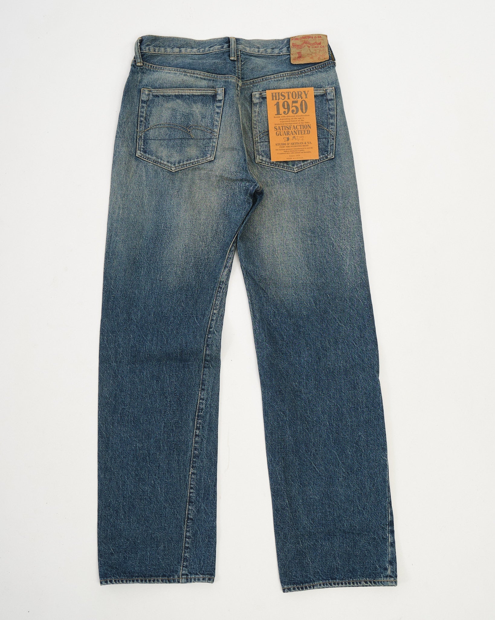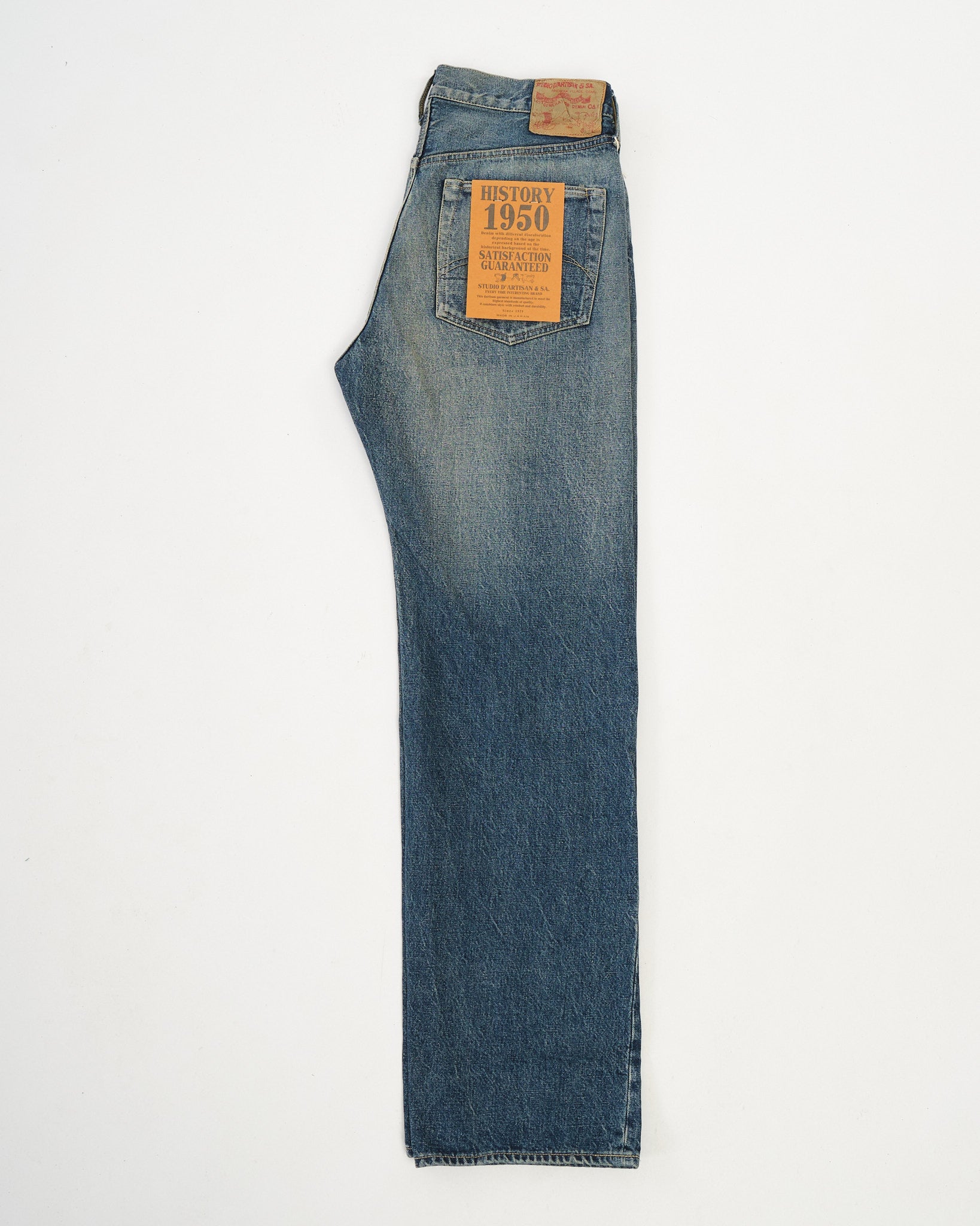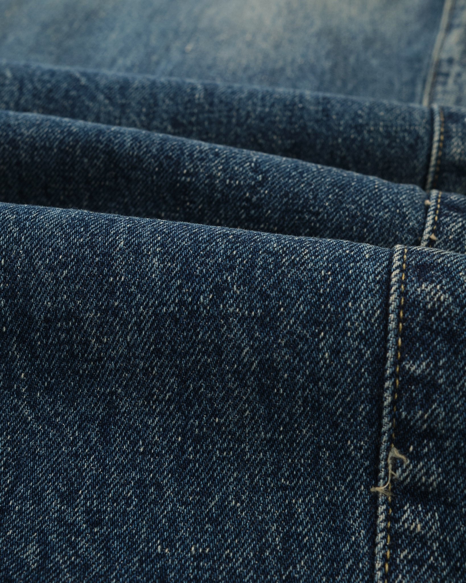 Disegnati con una silhouette dritta stretta 103, questi jeans offrono una vestibilità pulita ma strutturata, rimanendo fedeli all'estetica dell'abbigliamento da lavoro degli anni '50. Il lavaggio in indaco usato esalta la sensazione vintage, mostrando sfumature e pieghe sottili che evidenziano il carattere unico del tessuto.