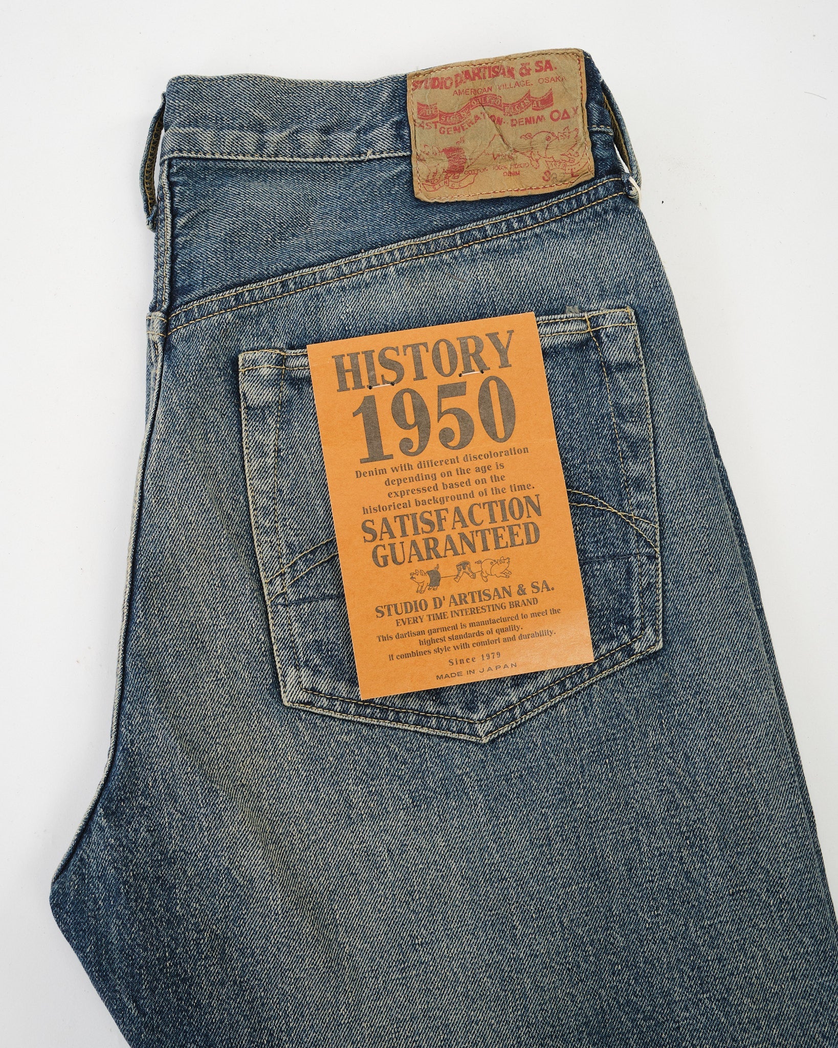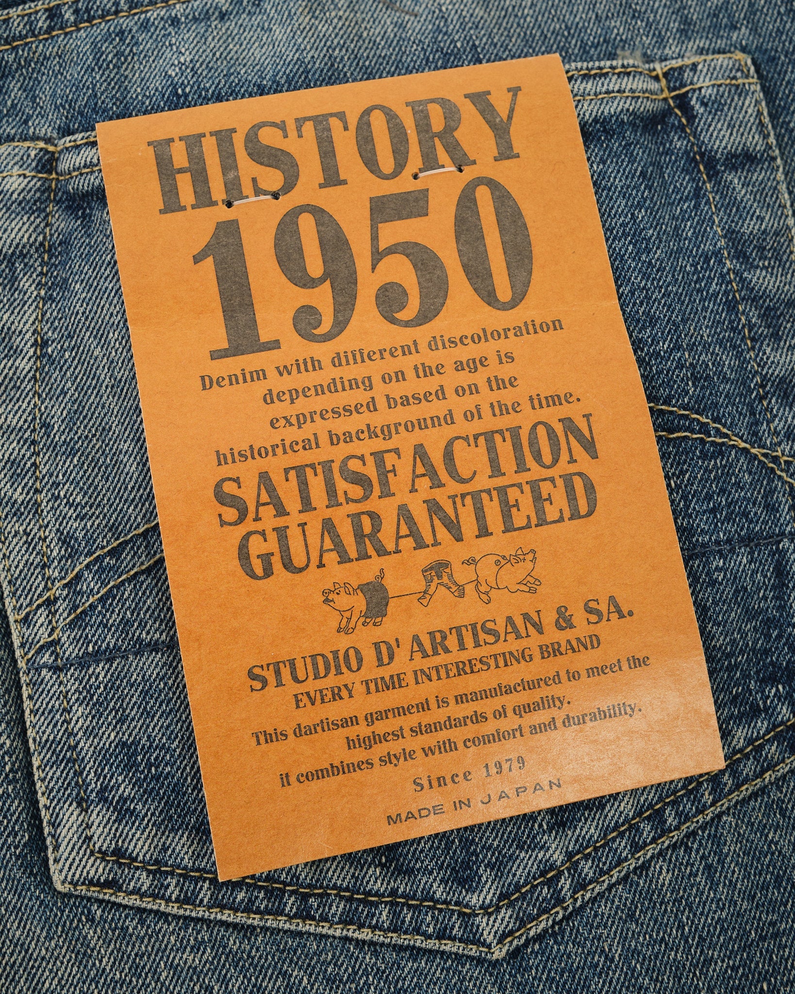 I Jeans STUDIO D'ARTISAN 1950 (D1844U) sono un tributo all'abbigliamento da lavoro robusto di metà secolo, realizzati meticolosamente usando denim selvedge da 12.5oz tessuto sul storico telaio G3—il primo telaio a potenza del Giappone. Il leggendario telaio G3 opera usando la tecnica di tessitura darashi, dove la tensione verticale è intenzionalmente allentata. Questo metodo permette agli artigiani esperti di aggiustare manualmente il processo di tessitura, risultando in una texture irregolare e ruvida che le macchine moderne semplicemente non possono replicare.