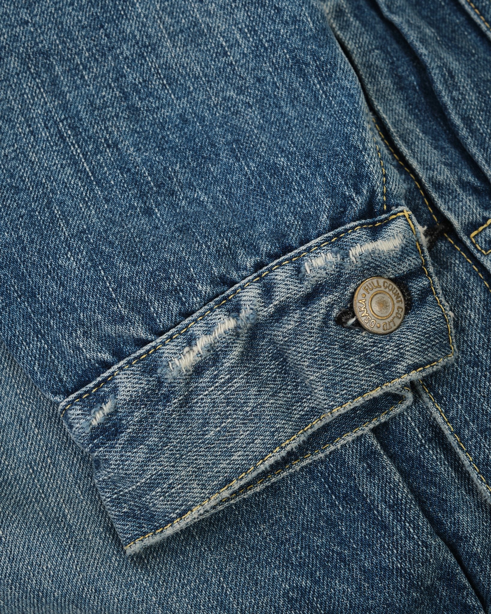 • Tessuto indaco profondo che sviluppa una patina unica nel tempo