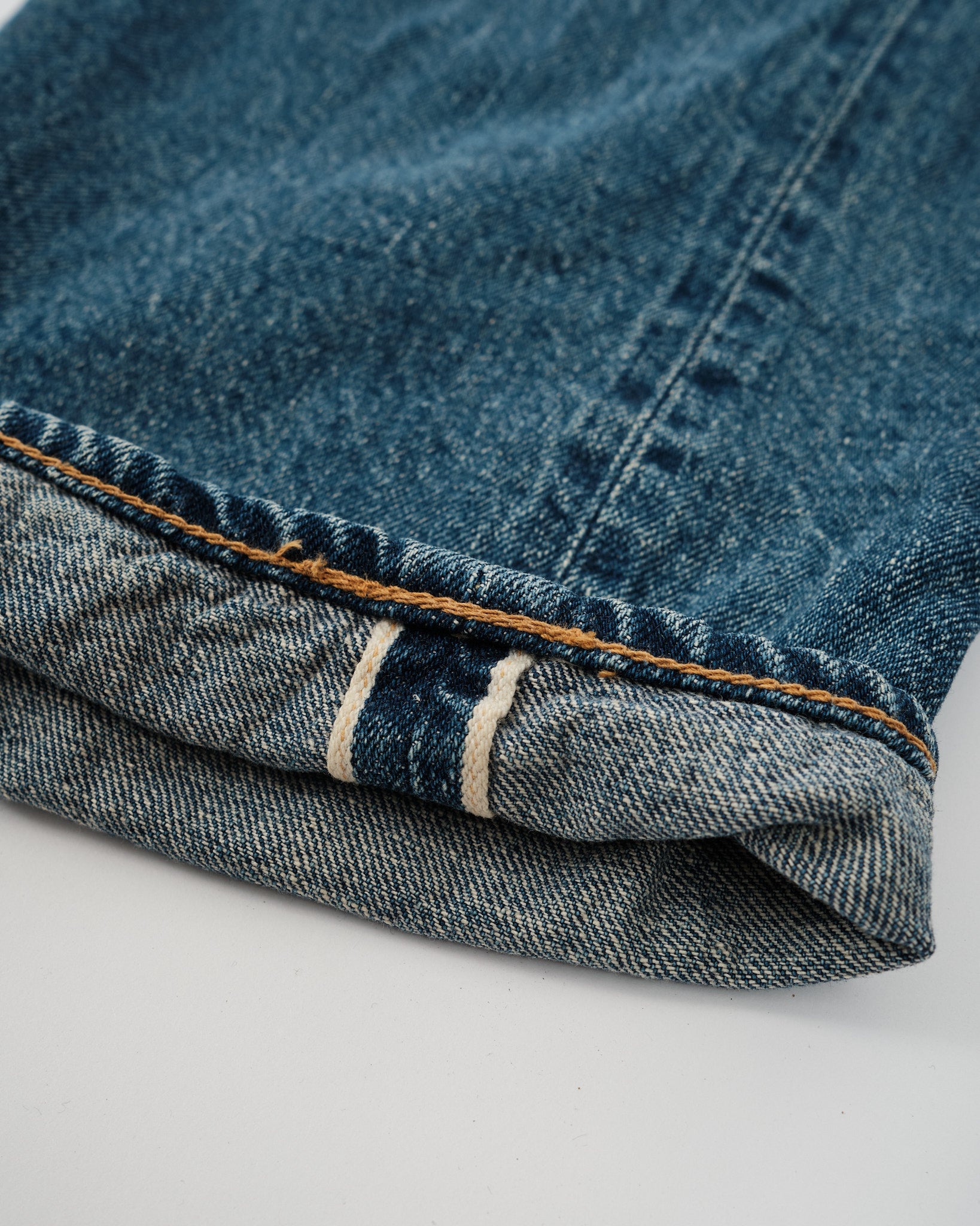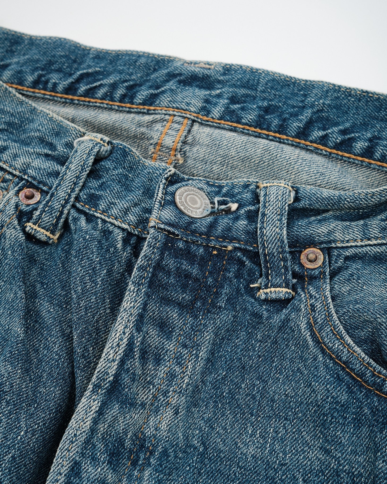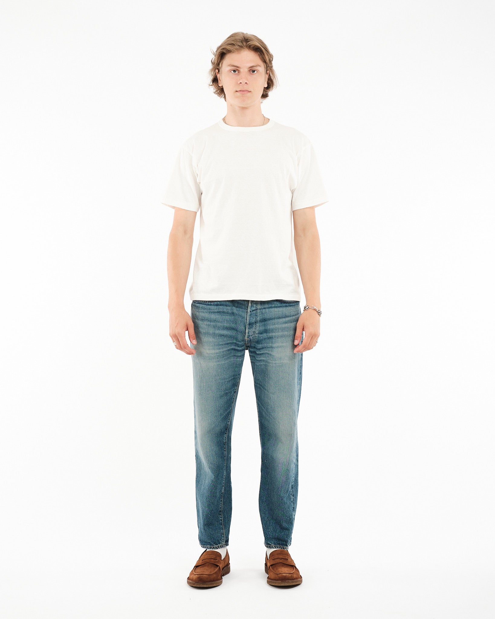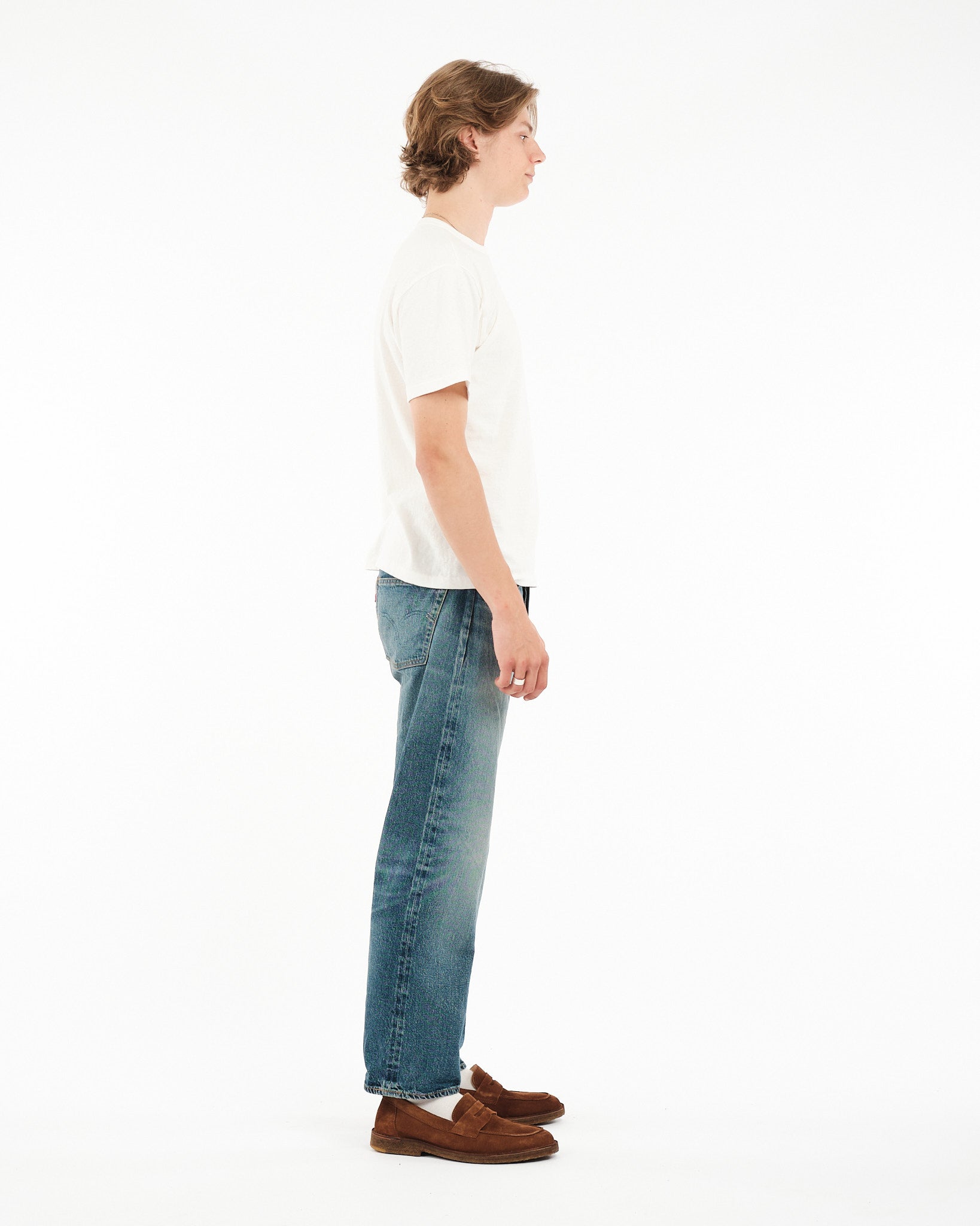 Ispirati al denim degli anni '60, il design presenta un cavallo leggermente più profondo e una vestibilità dritta con un leggero restringimento verso l'orlo, offrendo una silhouette classica che si adatta a vari tipi di corpo. I dettagli chiave includono una patta con bottoni tradizionale, tasche posteriori rinforzate con leggero distress per imitare l'usura autentica, e orli cuciti a catenella che migliorano sia la durabilità che l'estetica vintage. I jeans sono adornati con una toppa di carta sulla cintura, che svilupperà il proprio carattere nel tempo, e le tasche posteriori presentano cuciture e linguette che replicano autenticamente l'aspetto del denim vintage ben indossato.