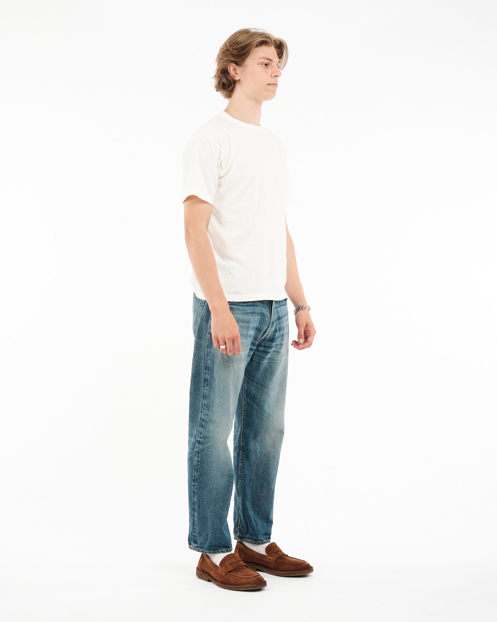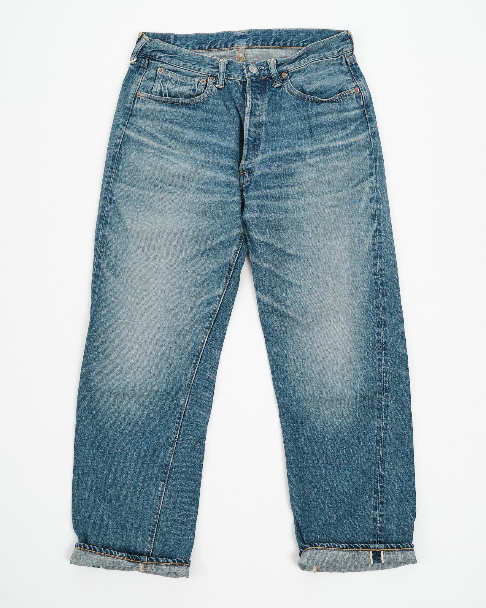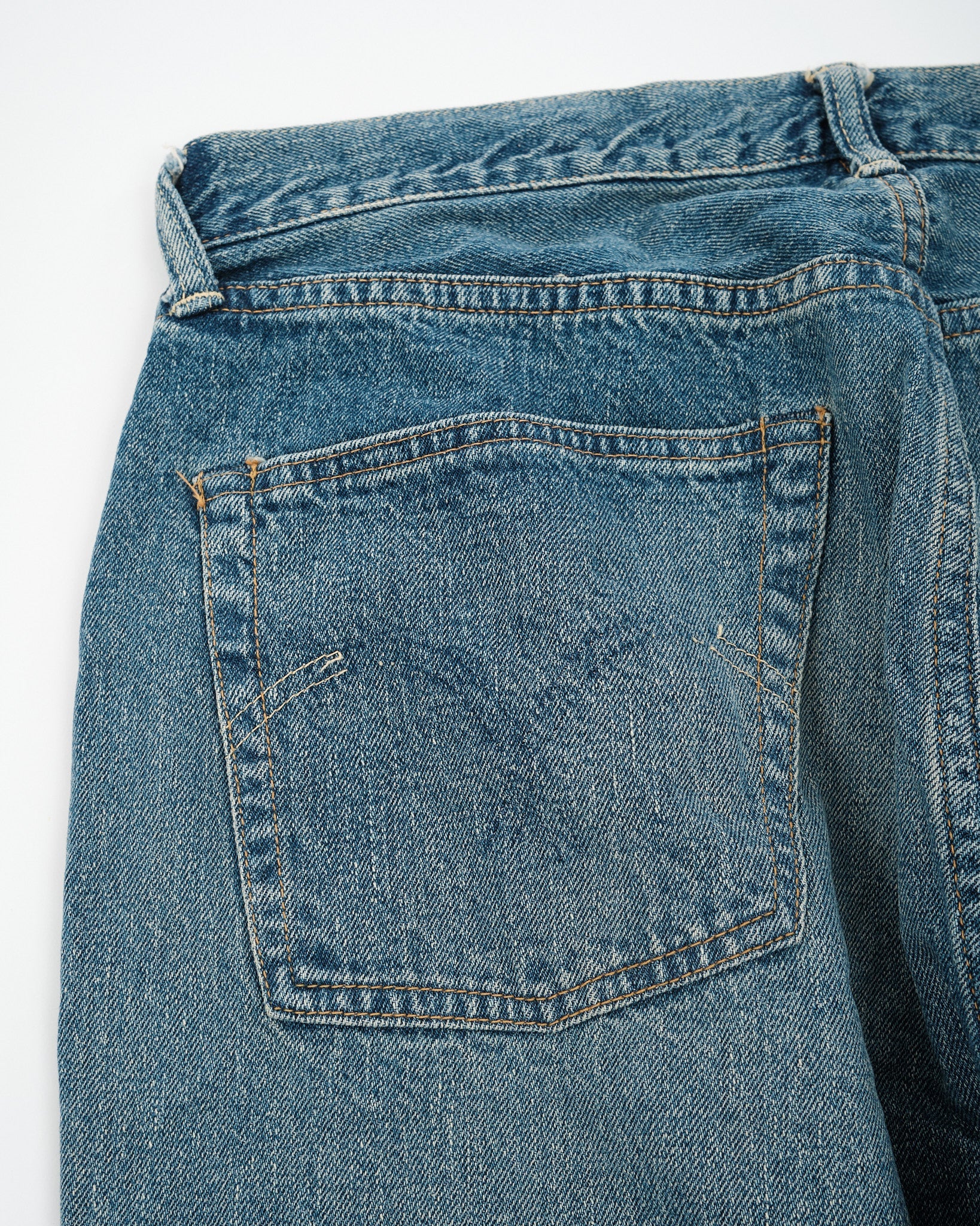 Ispirati al denim degli anni '60, il design presenta un cavallo leggermente più profondo e una vestibilità dritta con un leggero restringimento verso l'orlo, offrendo una silhouette classica che si adatta a vari tipi di corpo. I dettagli chiave includono una patta con bottoni tradizionale, tasche posteriori rinforzate con leggero distress per imitare l'usura autentica, e orli cuciti a catenella che migliorano sia la durabilità che l'estetica vintage. I jeans sono adornati con una toppa di carta sulla cintura, che svilupperà il proprio carattere nel tempo, e le tasche posteriori presentano cuciture e linguette che replicano autenticamente l'aspetto del denim vintage ben indossato.