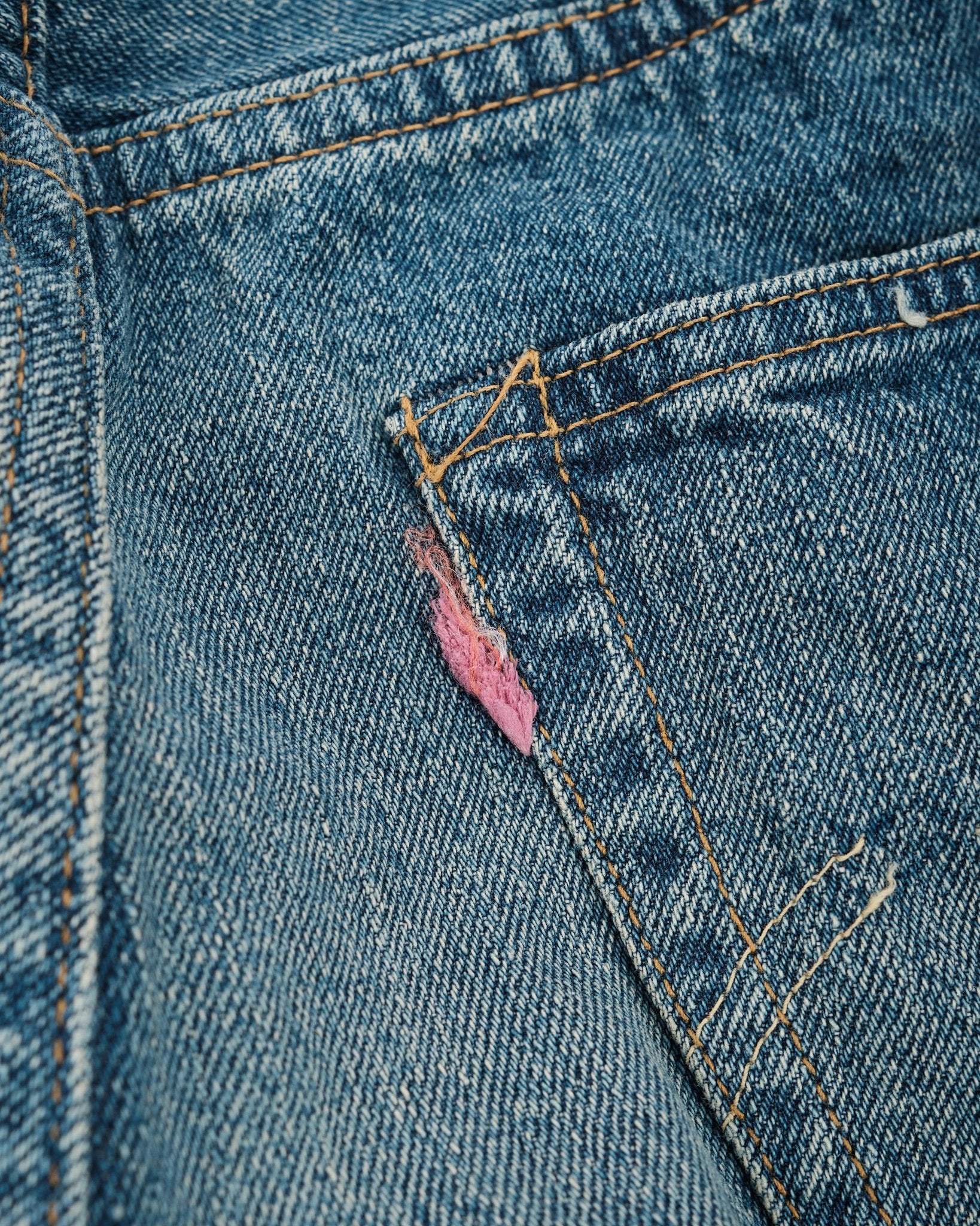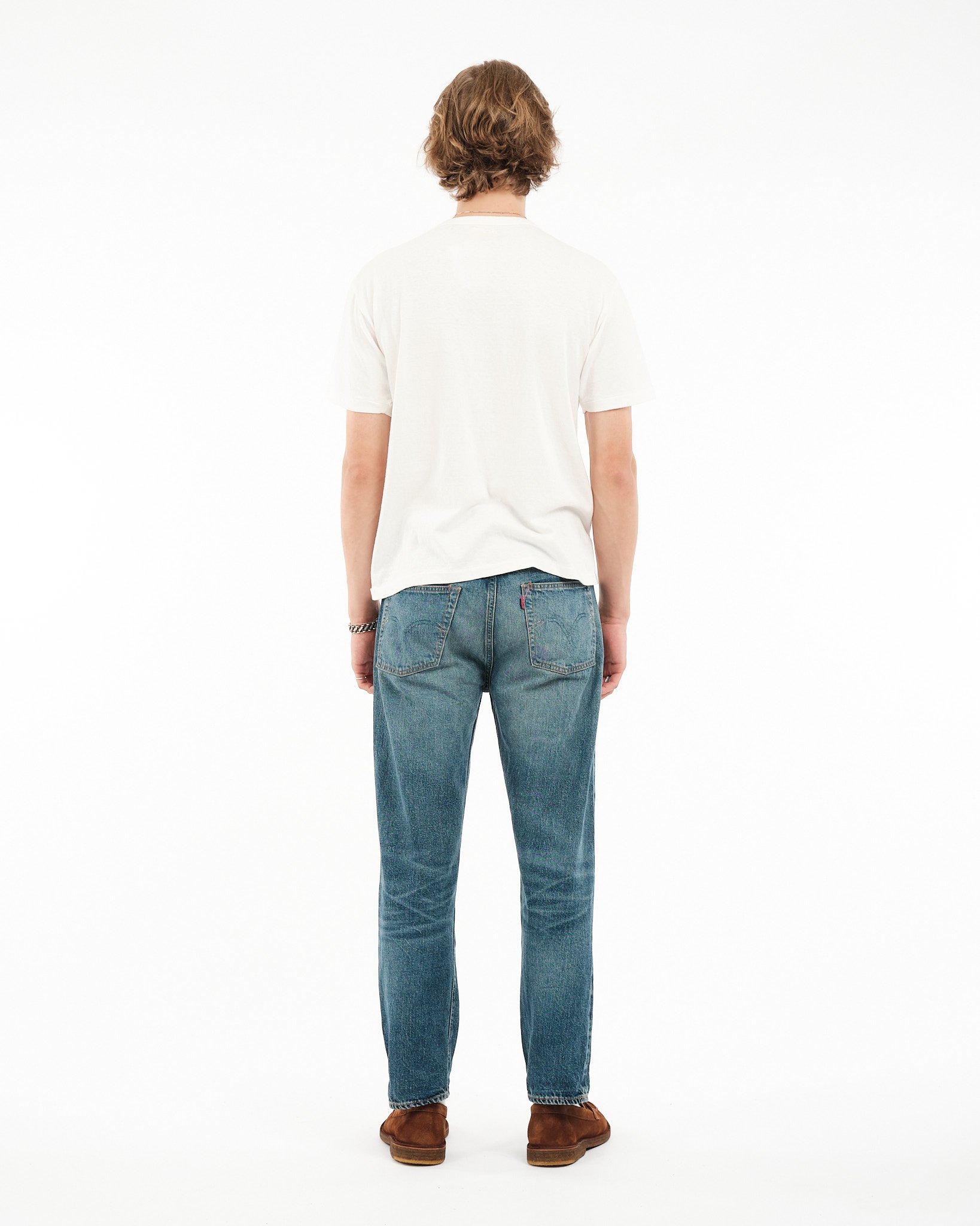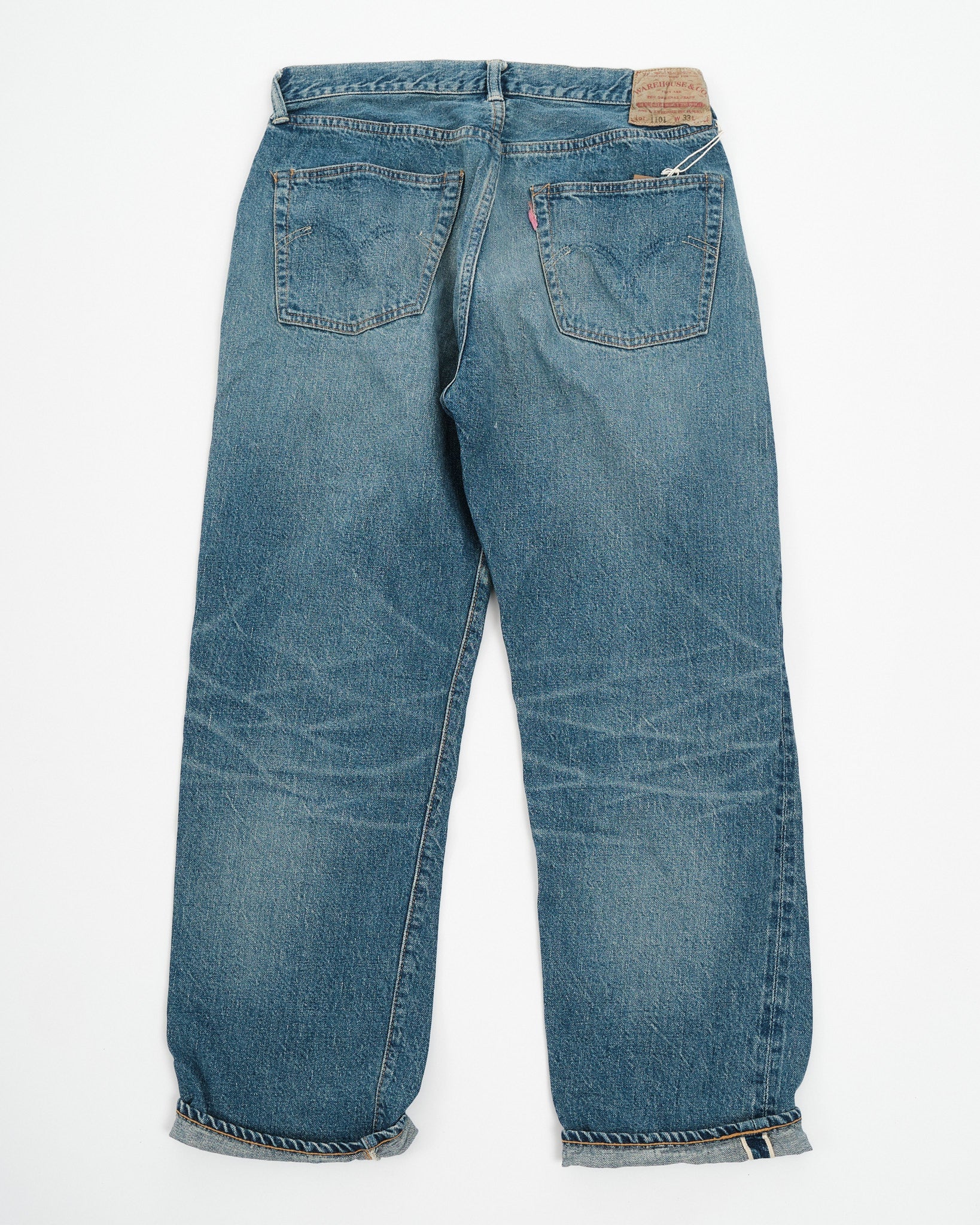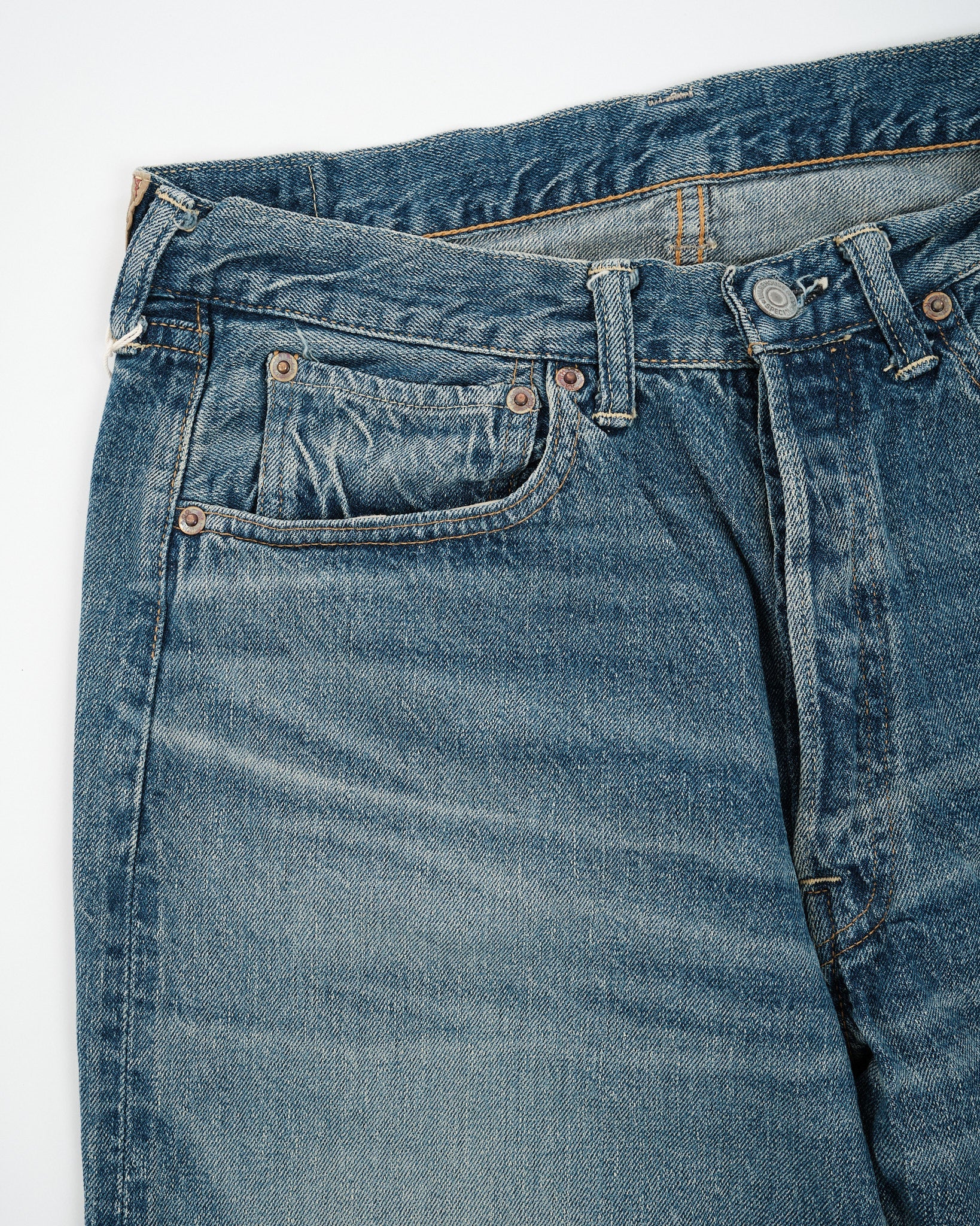 Ispirati al denim degli anni '60, il design presenta un cavallo leggermente più profondo e una vestibilità dritta con un leggero restringimento verso l'orlo, offrendo una silhouette classica che si adatta a vari tipi di corpo. I dettagli chiave includono una patta con bottoni tradizionale, tasche posteriori rinforzate con leggero distress per imitare l'usura autentica, e orli cuciti a catenella che migliorano sia la durabilità che l'estetica vintage. I jeans sono adornati con una toppa di carta sulla cintura, che svilupperà il proprio carattere nel tempo, e le tasche posteriori presentano cuciture e linguette che replicano autenticamente l'aspetto del denim vintage ben indossato.