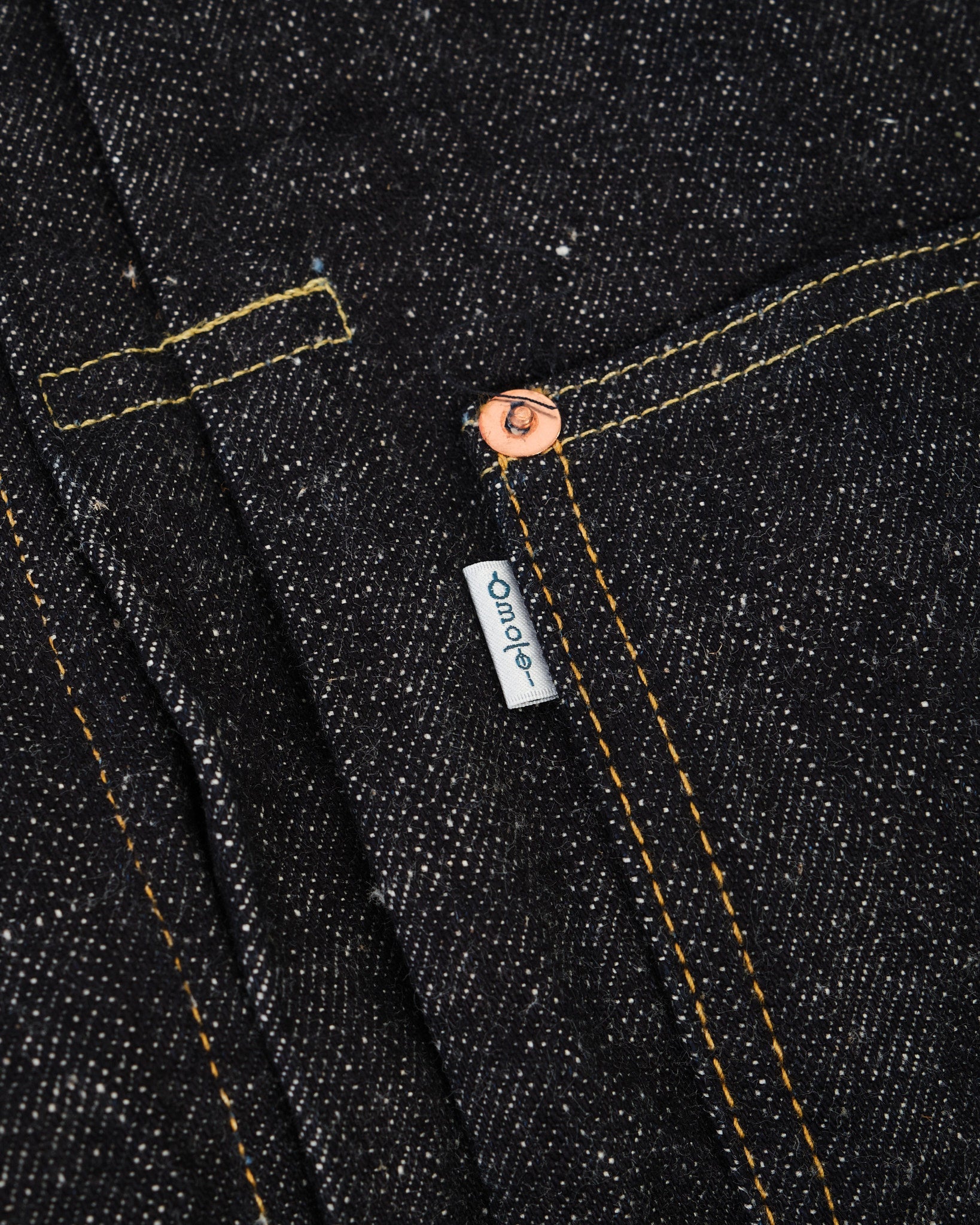 Made from a rugged 15.5oz slub-nep denim, the warp is spun from long-slub yarns while the weft incorporates nep yarns crafted from recycled cotton. This fabric, woven under extremely low tension on vintage Toyoda shuttle looms, produces rich vertical fading and a tactile roughness that evolves with wear. Rope-dyed with 100% pure indigo, the yarns fade from an extra-dark indigo surface into a striking white core, delivering dramatic contrast fades over time. Finished with a one-wash treatment, the jacket maintains the raw character of cotton while being ready to wear from day one.