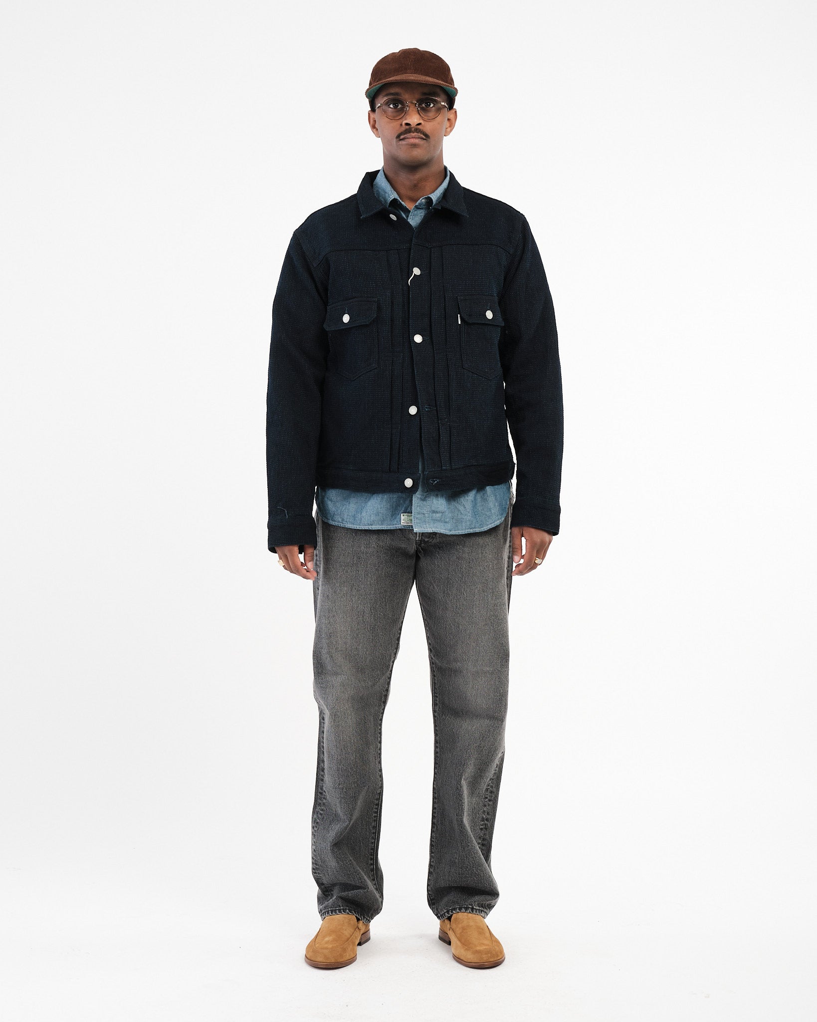 Numero di modello: 3220 Denim Sashiko a cubo da 12oz con una sensazione ricca e strutturata Ispirato alla tradizionale cucitura sashiko per durabilità e artigianato ereditario Tessuto con filati di denim per reinterpretare un tessuto storico per l'uso moderno Tinto in indaco per sbiadimenti profondi ad alto contrasto nel tempo Silhouette classica del 2° Tipo per una vestibilità strutturata ma confortevole Selvedge blu-verde “MIMI” di OMOTO per un dettaglio autentico in denim Toppe in pelle di pecora con marchio personalizzato per un tocco di pregio Cuciture rinforzate e bottoni metallici originali per una durabilità di lunga durata Tasche sul petto funzionali e dettagli di texture sashiko per uno stile senza tempo