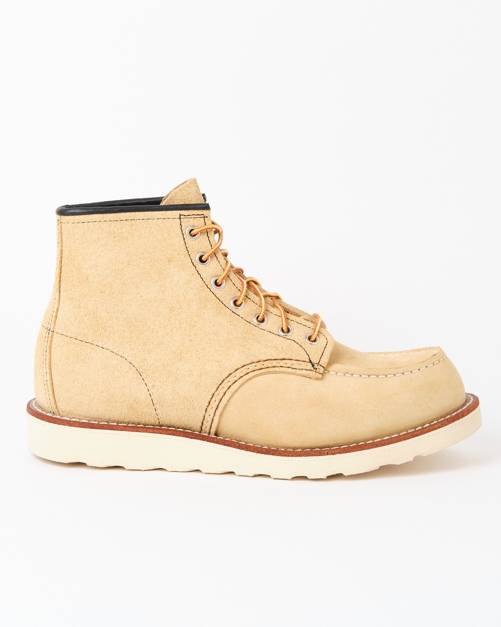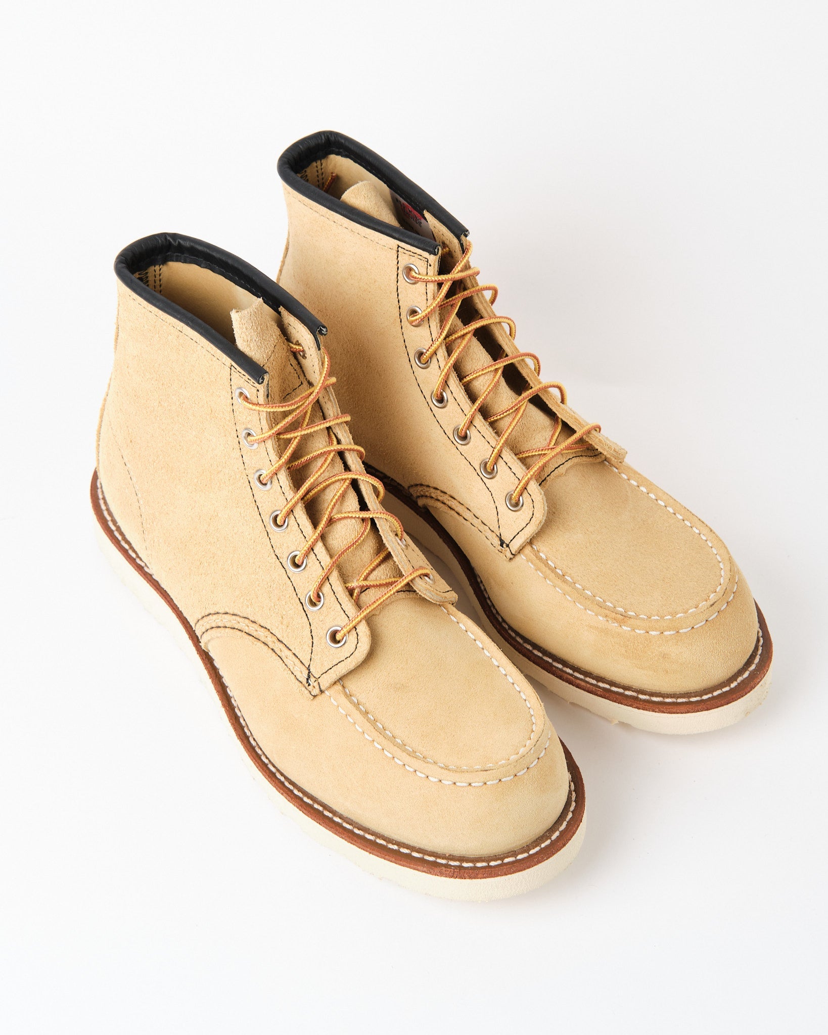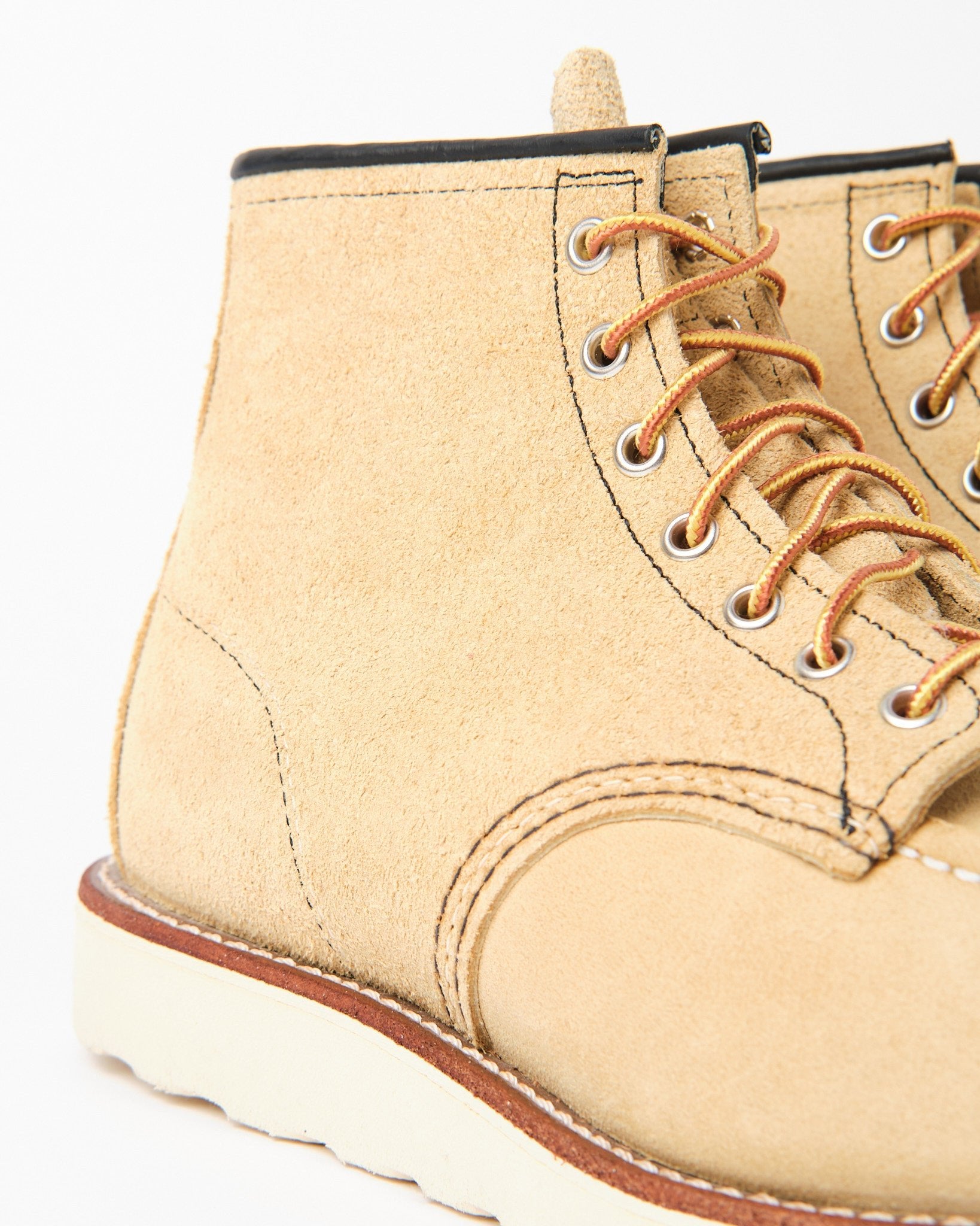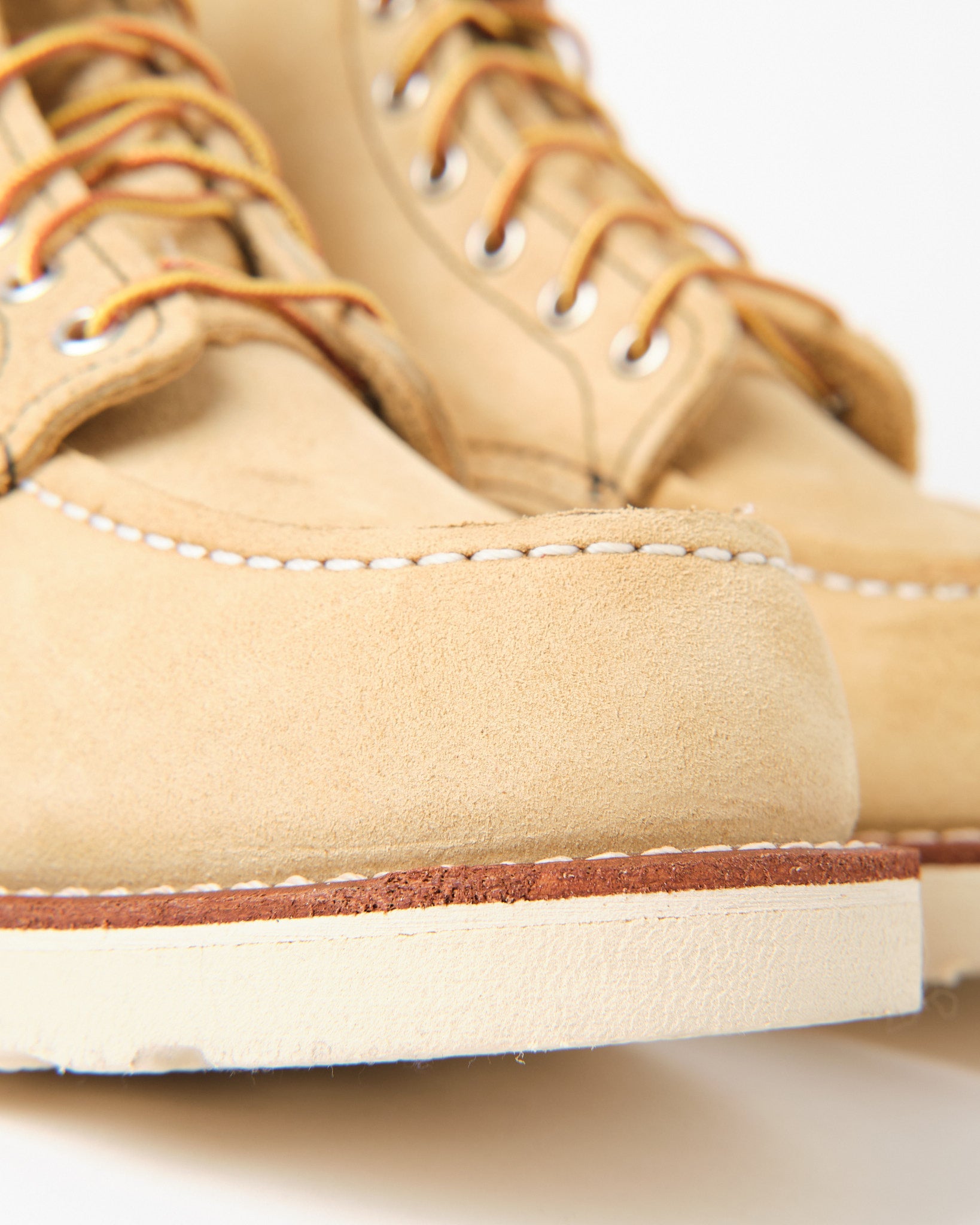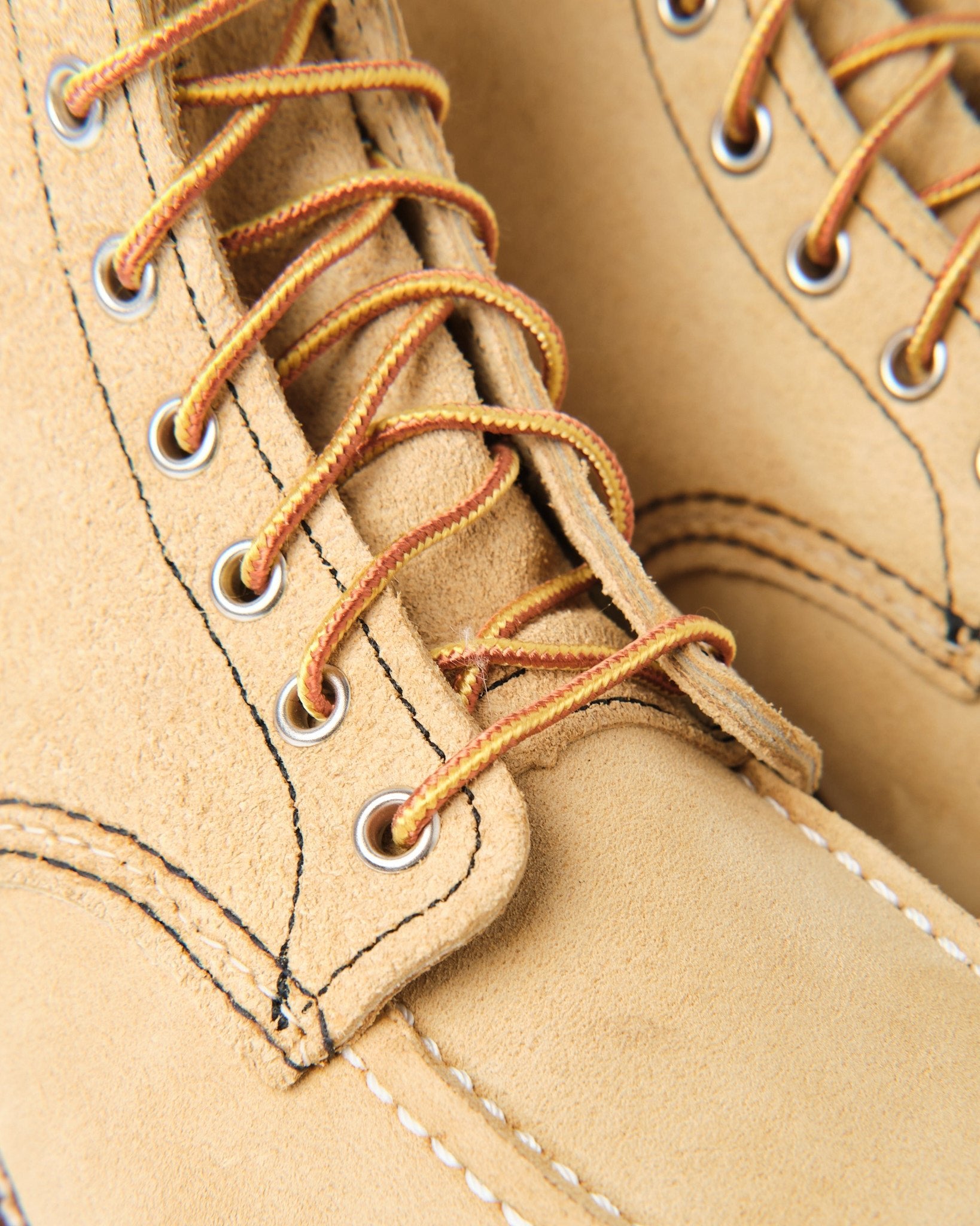Le Red Wing Shoes 8173 Irish Setter Moc Toe Sand Abilene si basano sul classico 875. Il 8173 Moc Toe è realizzato in pelle 'Abilene', che viene prodotta nella conceria Red Wing in Minnesota. È spesso definita come 'rough out', poiché è il lato ruvido della pelle. 'Abilene' è una delle pelli iconiche utilizzate da Red Wing per le loro scarpe. Usare la pelle al contrario offre molti vantaggi poiché è idrorepellente, è nota per la sua traspirabilità e non richiede manutenzione.