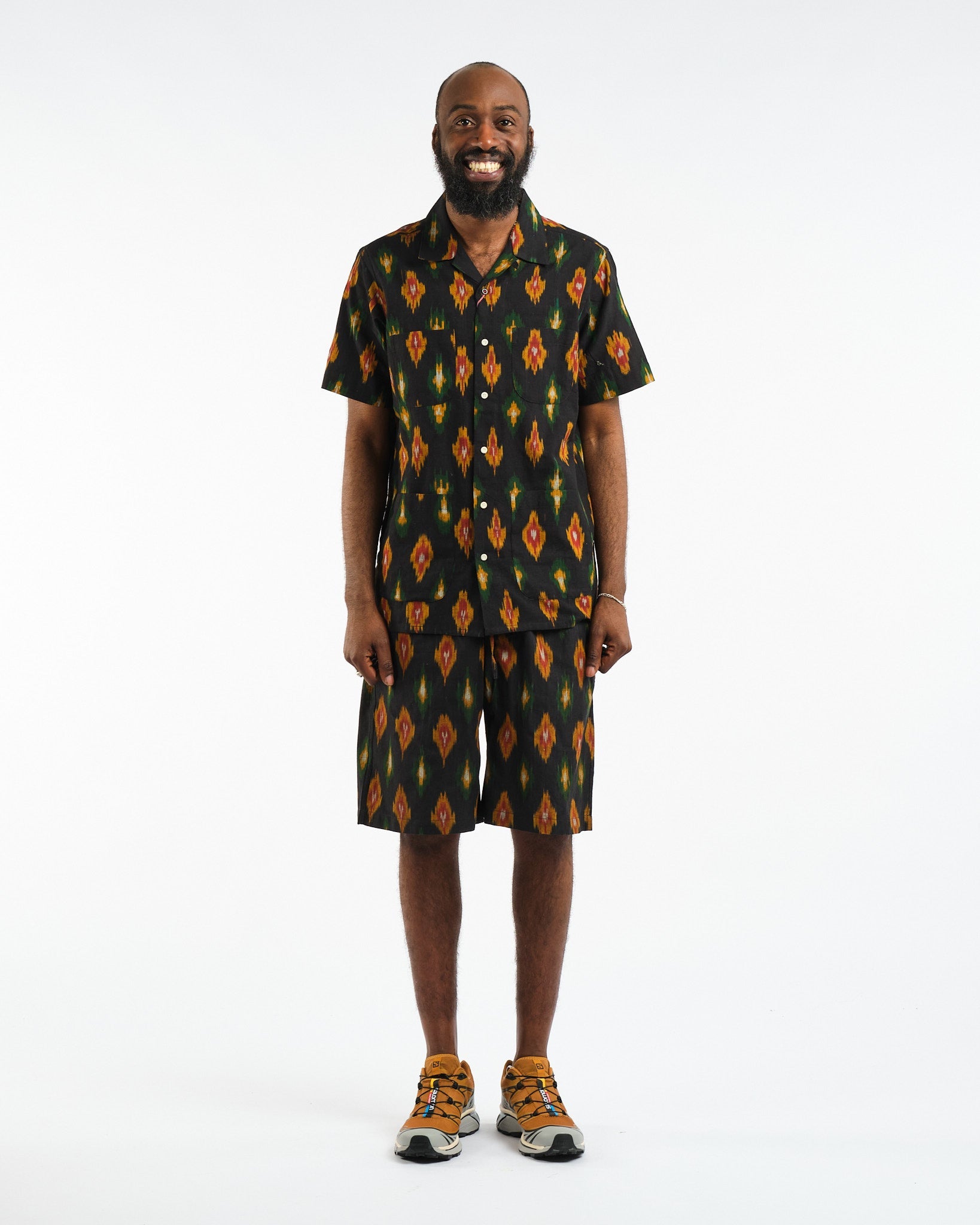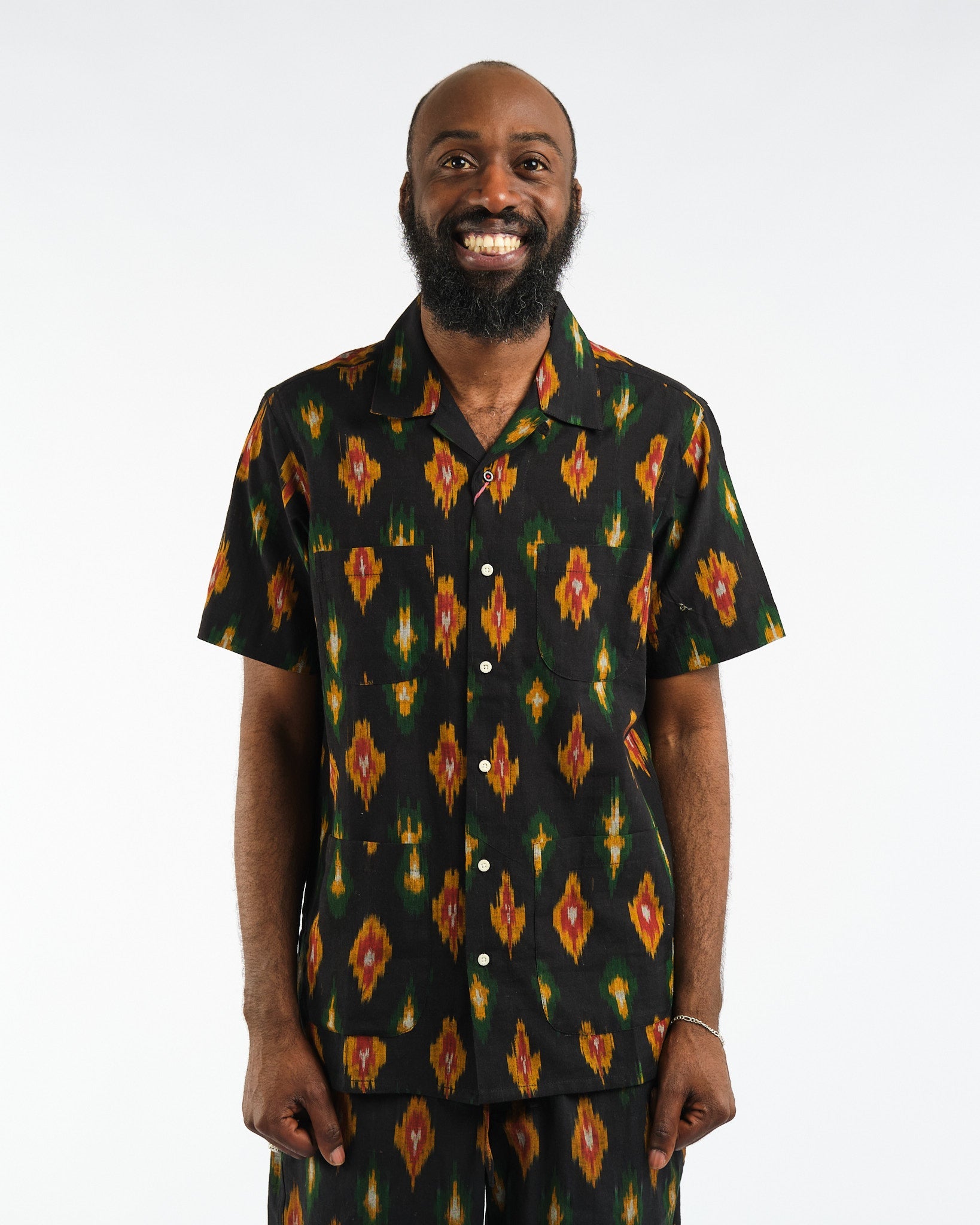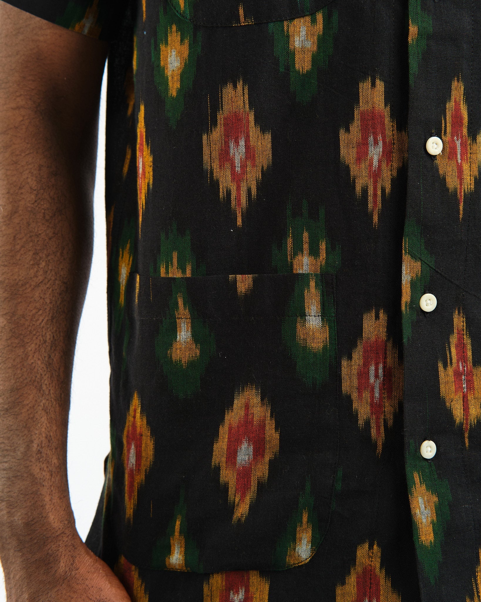 Presentiamo la camicia Alfred Ikat Black di Kardo, una perfetta combinazione di stili tradizionali e contemporanei. Questa camicia con colletto alla cubana di vestibilità regolare presenta un tessuto Ikat tessuto a mano realizzato utilizzando un'antica tecnica di riserva e tintura a legatura dei fili in ordito e talvolta in trama per creare motivi geometrici nel tessuto dopo il processo di tessitura. Il nostro tessuto Ikat è tessuto a mano in Andhra Pradesh e Odisha da artigiani che tessono Ikat da generazioni. Realizzata in 100% Cotone Handloom, questa camicia ha quattro tasche applicate frontali, un colletto alla cubana e bottoni in corozo. La camicia è realizzata da un solo sarto dall'inizio alla fine, garantendo che ogni dettaglio sia perfetto. È anche rifinita a mano per una maggiore attenzione ai dettagli.