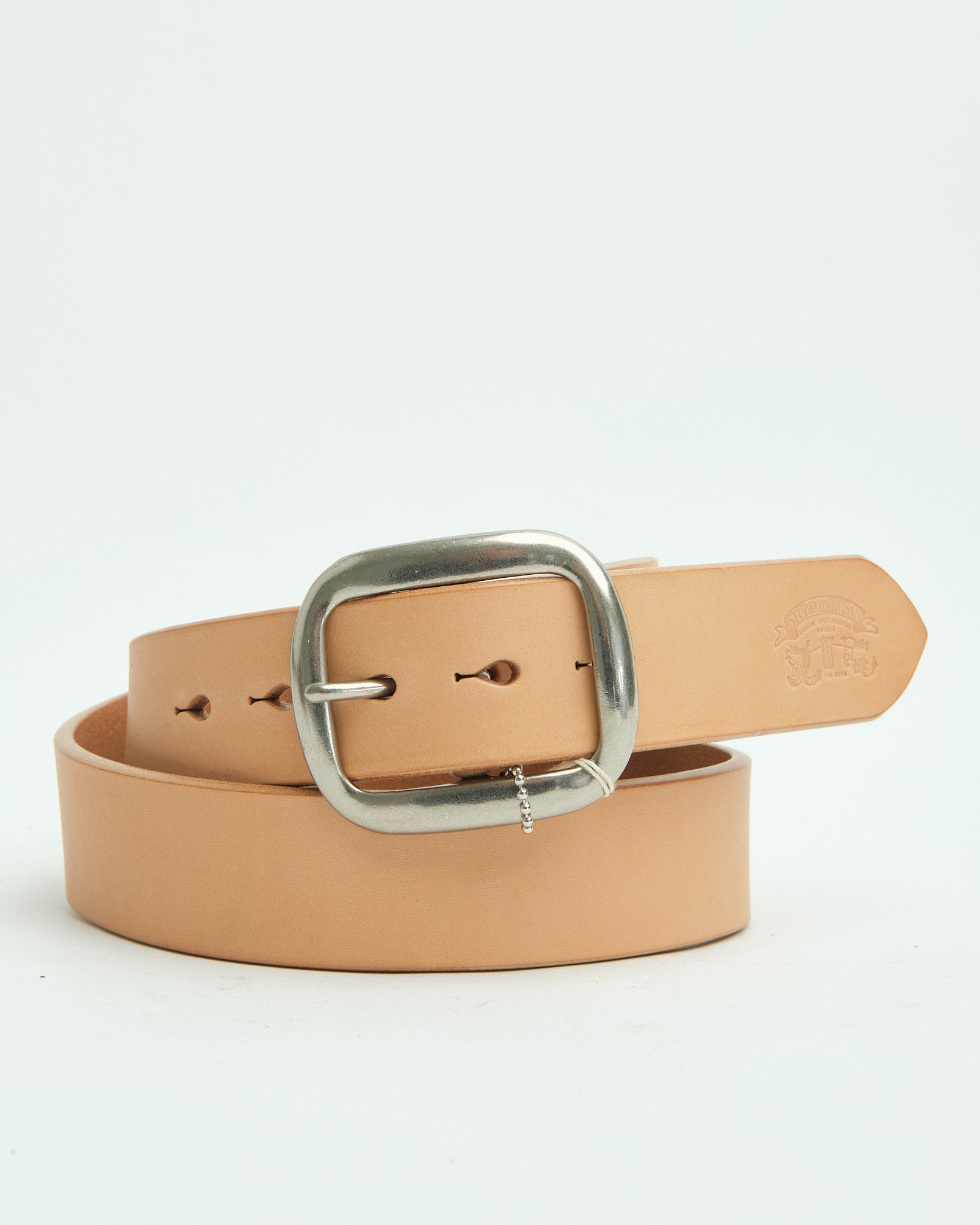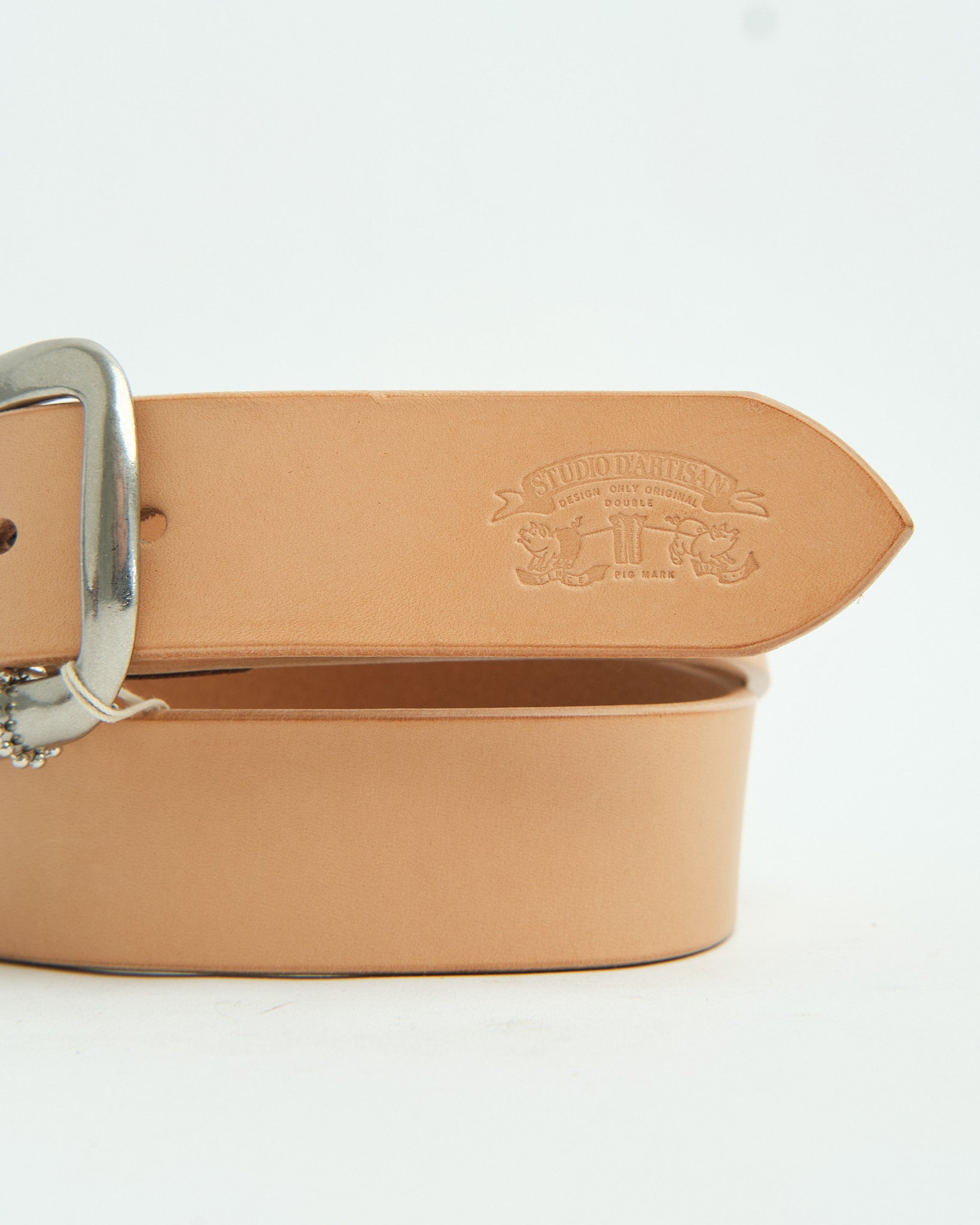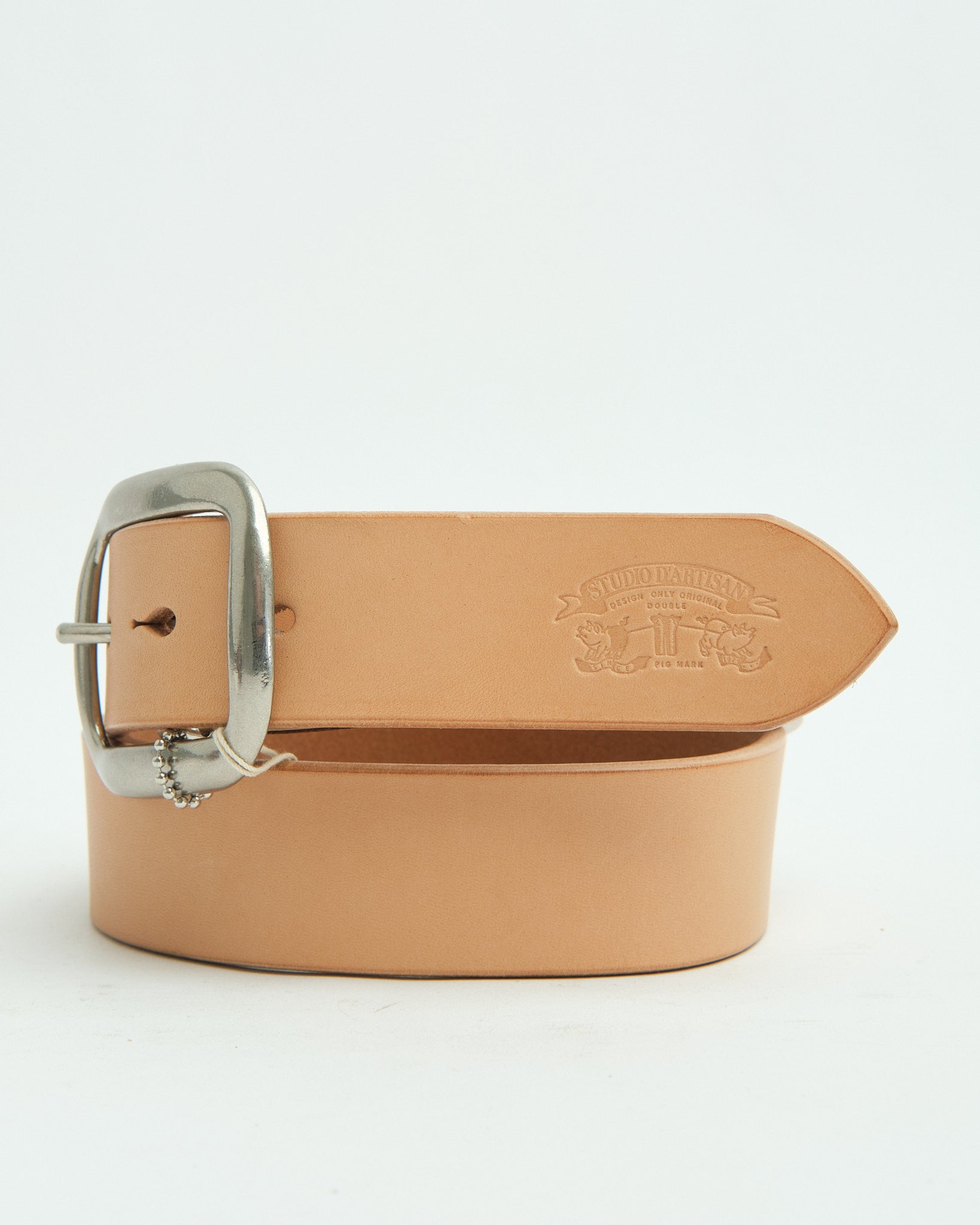 Un'ispirazione vintage realizzata: la Cintura in Pelle Studio D’Artisan B‑81 è realizzata in cuoio bovino conciato al vegetale di circa 4,5 mm di spessore, progettata per resistere alla prova del tempo. La cinghia si estende per circa 1,5 pollici (≈ 38 mm) in larghezza—abbastanza larga da essere audace con il denim, abbastanza stretta da scivolare sotto passanti per cintura più robusti. I suoi cinque fori a forma di goccia fanno eco all'eredità del workwear, mentre una fibbia ovale nichelata (spesso rimovibile) aggiunge sia funzionalità che carattere. Bordi lucidati e smussati levigano il suo profilo, e un sottile logo Studio D’Artisan impresso vicino alla coda conferisce quel credito ereditario. Costruita in Giappone, questa cintura è tanto robusta quanto raffinata—indossala per decenni, lascia che invecchi con te.