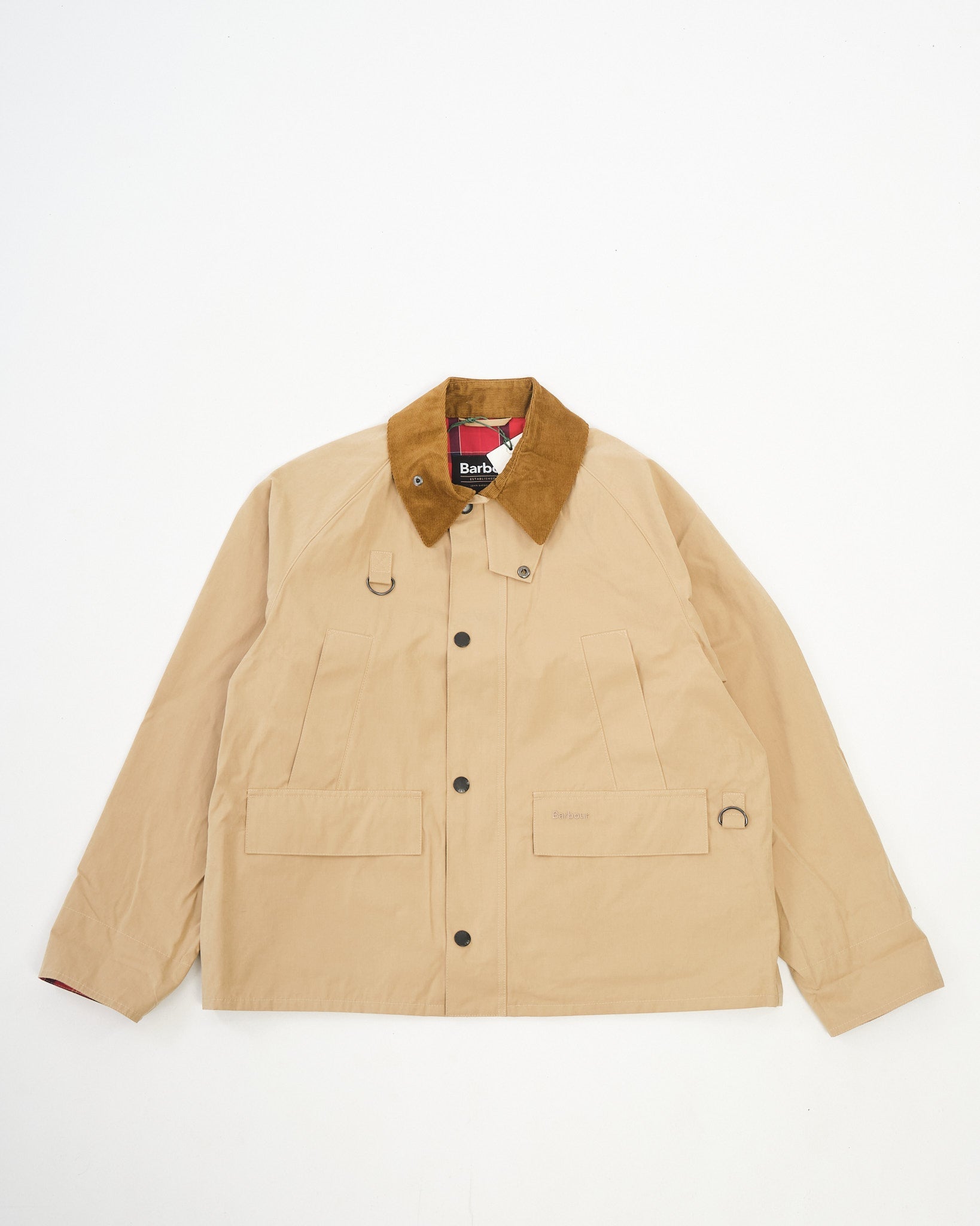 La giacca casual Barbour Solar Spey in pietra è una reinterpretazione in edizione limitata della classica silhouette Spey, rilasciata in occasione del Capodanno Lunare. Realizzata nel tessuto di cotone cerato distintivo di Barbour, offre un strato esterno leggero e resistente alle intemperie con una finitura nitida. L'interno presenta una versione rossa audace del rivestimento tartan iconico di Barbour, simbolo di buona fortuna nella cultura cinese. I dettagli di design includono un colletto in velluto a coste con cinturino per la gola, due grandi tasche frontali con patta, una chiusura frontale con zip con patta antitempesta a pressione, e una chiusura superiore rossa a bottone accompagnata da una spilla Barbour del Capodanno Lunare. Questa giacca mescola design ereditario con dettagli festivi, rendendola un pezzo di spicco per la stagione.