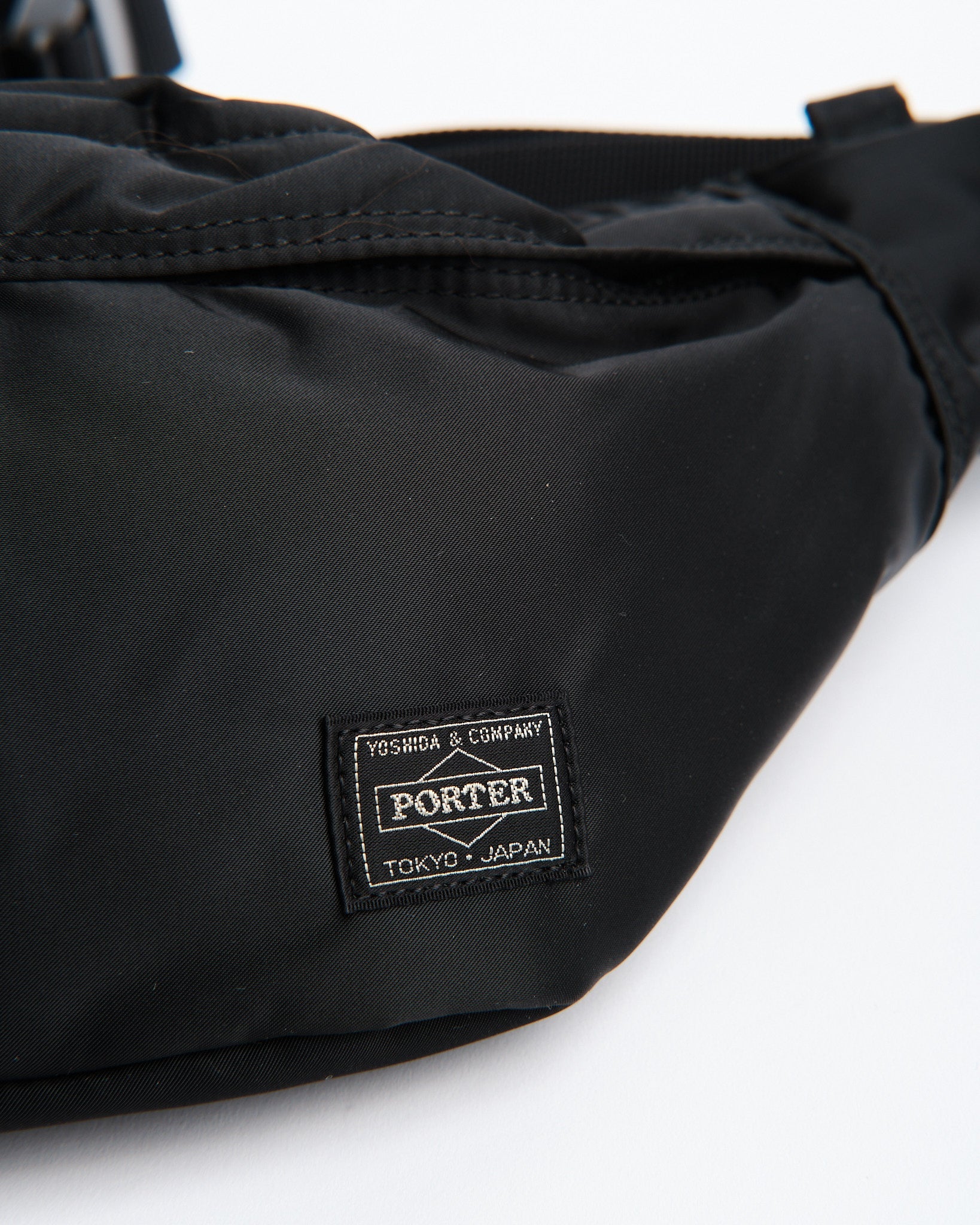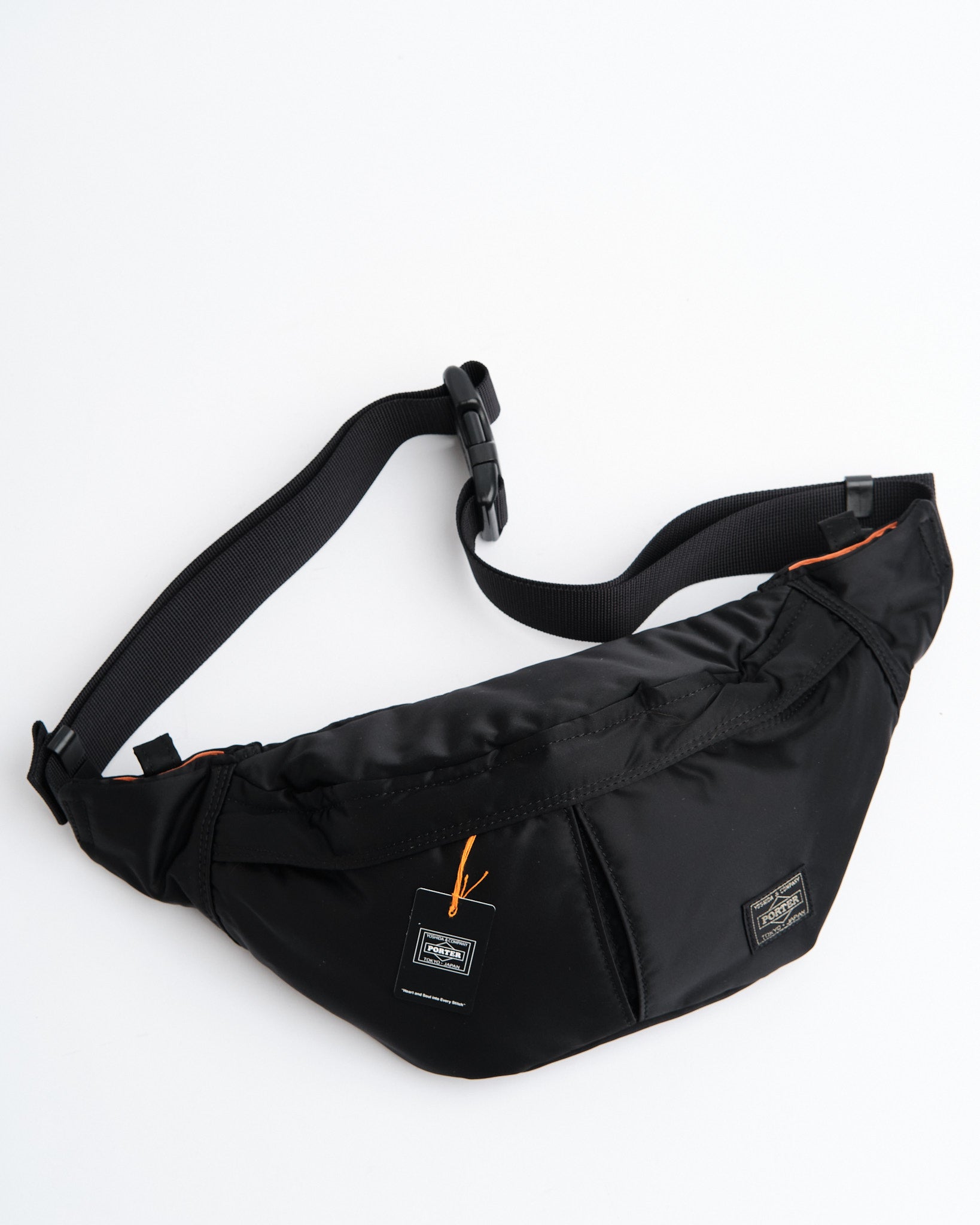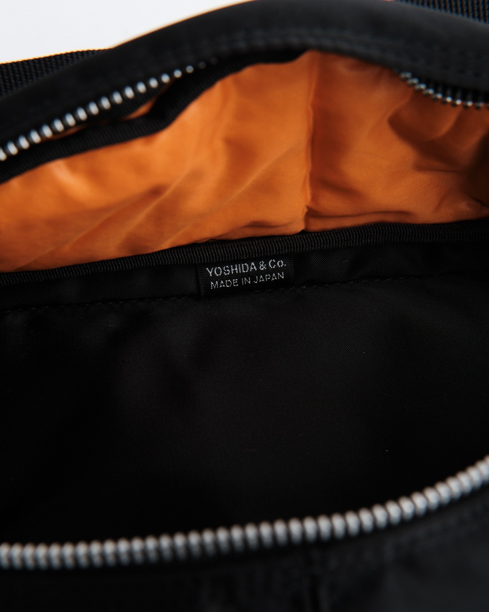 Presentazione della PORTER YOSHIDA 622 76629 10 TANKER WAIST BAG (S) in NERO. Parte della Serie Tanker che ha fatto il suo debutto nel 1983, questa borsa da cintura è realizzata utilizzando un tessuto unico originariamente progettato per la giacca da volo MA 1 dell'US Air Force, completa di una vivace fodera arancione di salvataggio. Nonostante le sue dimensioni, si adatta comodamente al corpo e può essere indossata sia intorno alla vita che a tracolla. Ideale per tenere al sicuro oggetti come telefoni e portafogli, dispone di tre tasche esterne, due scomparti interni, una tasca sulla cintura e una tasca con zip sul retro. La miscela di tessuti stratificati in twill di nylon, cotone poliestere e taffetà di nylon è sia leggera che robusta, mostrando la meticolosa attenzione ai dettagli di Yoshida&Co.