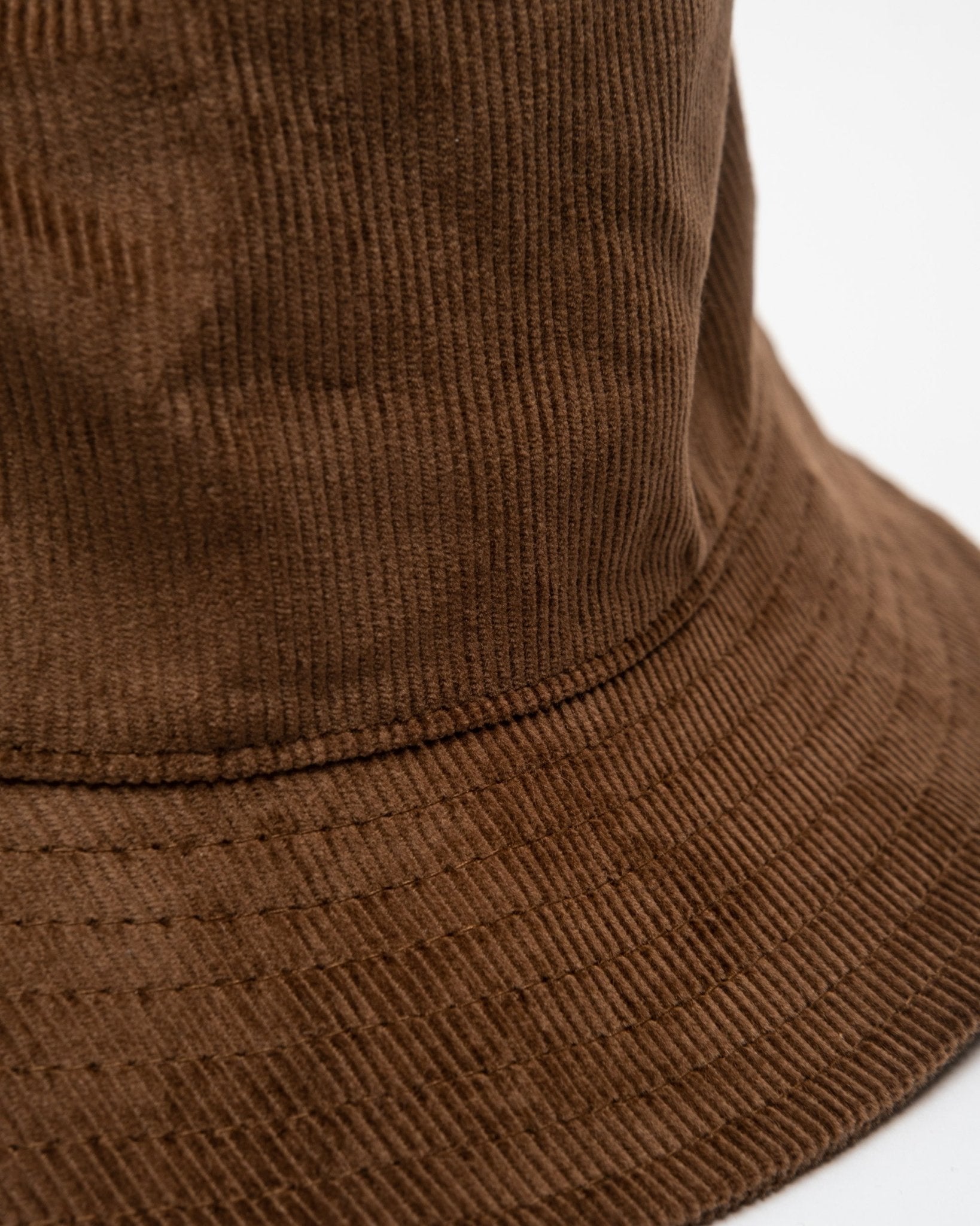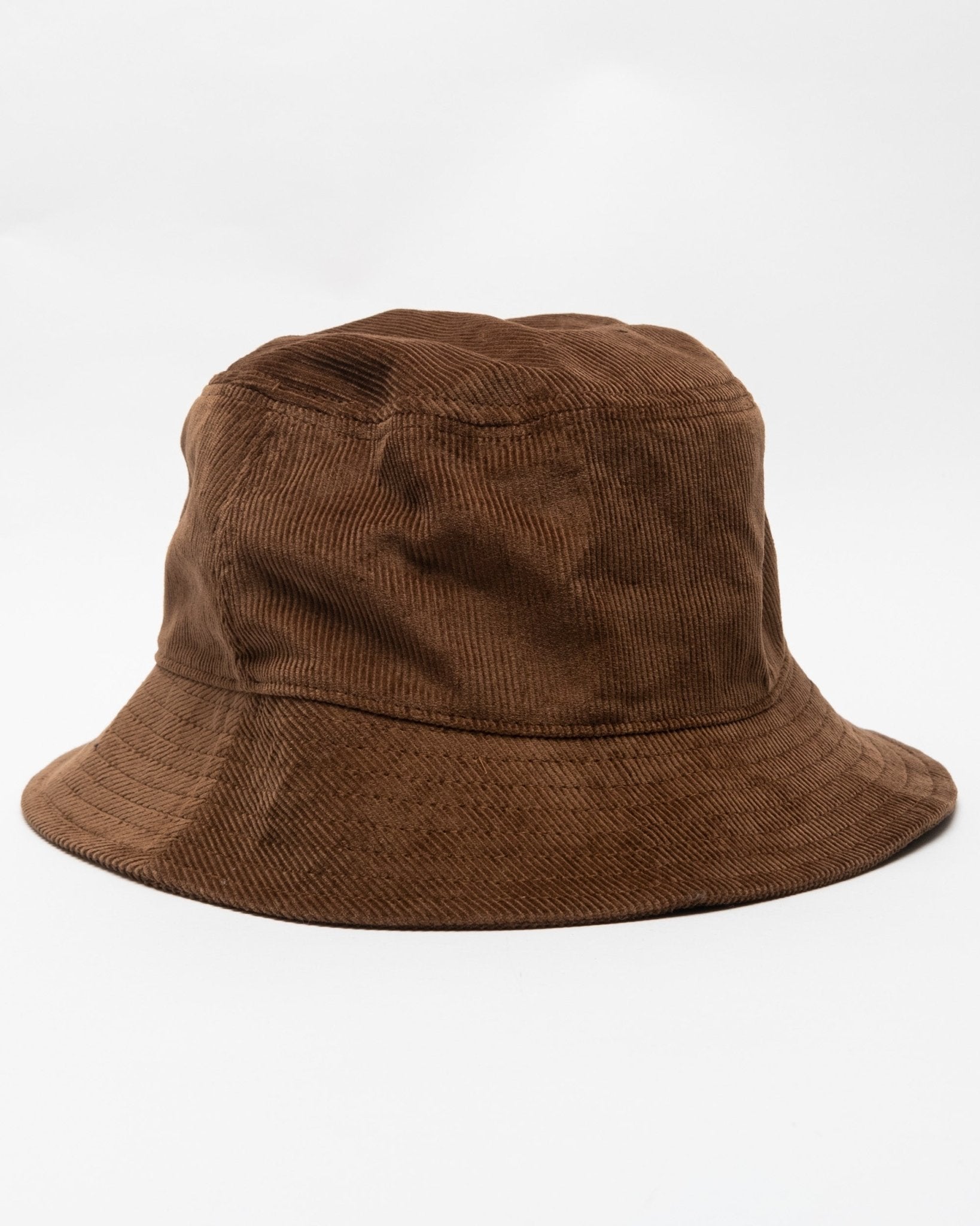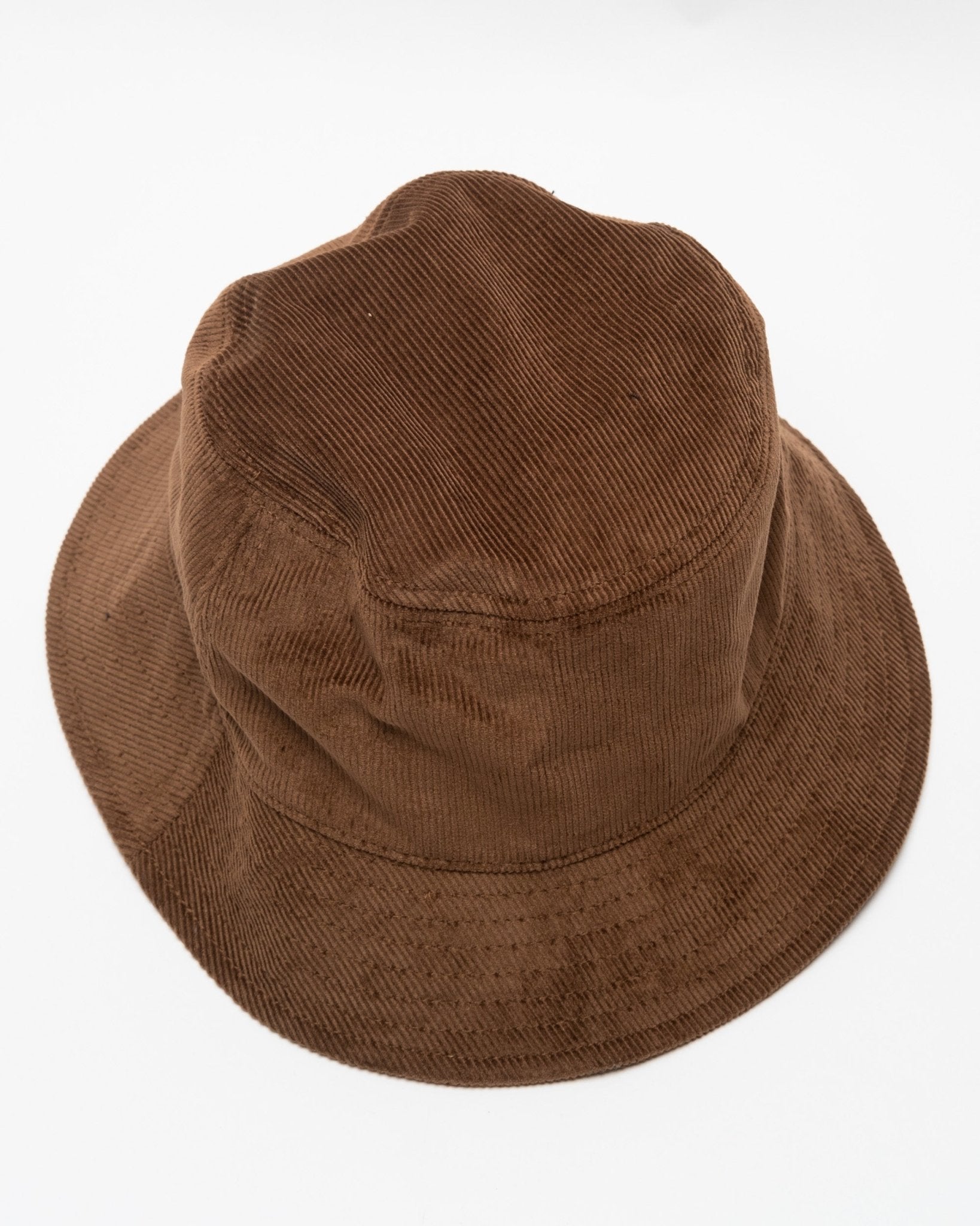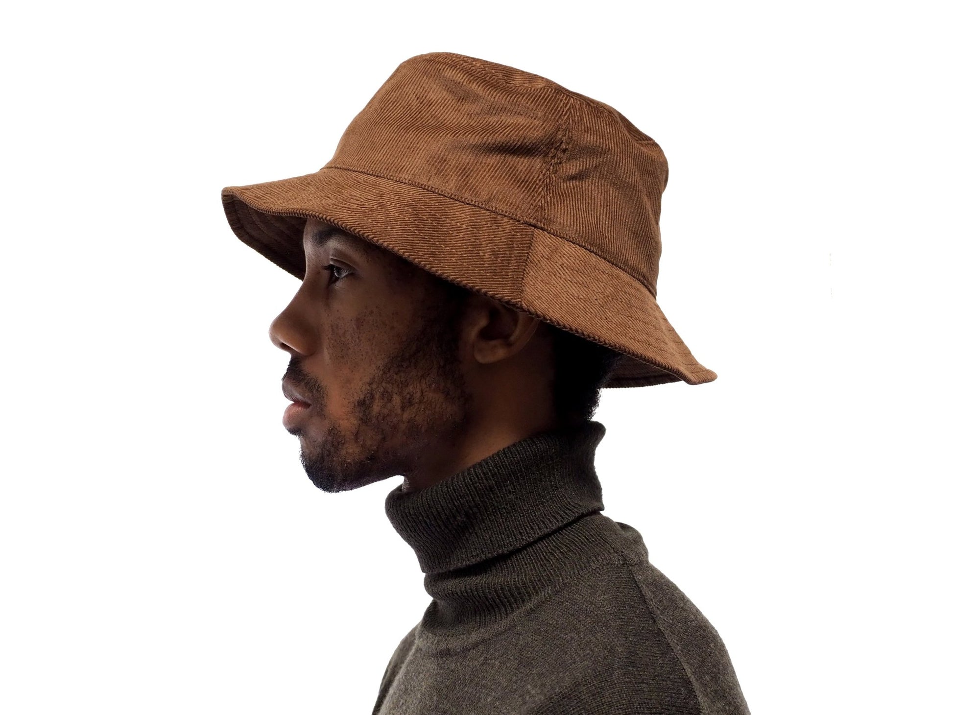 Bucket Hat Brown di Found Feather. Un cappello a secchiello leggero, regolabile, in velluto a coste. Questo cappello presenta una corona più profonda e una tesa più lunga, ispirata agli anni '80. Per regolare la taglia del cappello, sollevare la fascia interna per vedere la cinghia in velcro, regolare tutto a sinistra per la taglia più grande (61cm) o regolare tutto a destra per la taglia più piccola (57cm). Velluto a coste giapponese. Prodotto in Giappone.