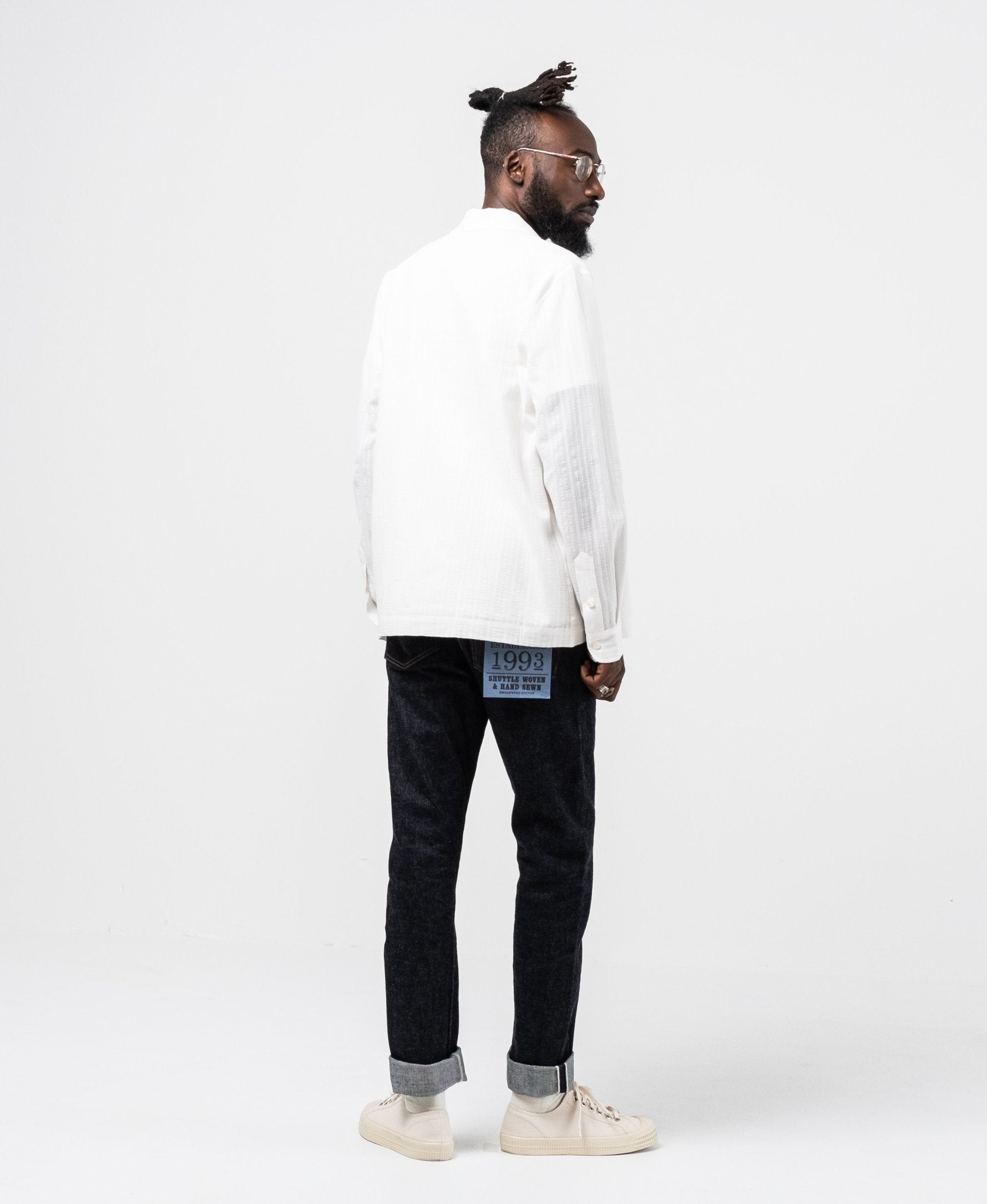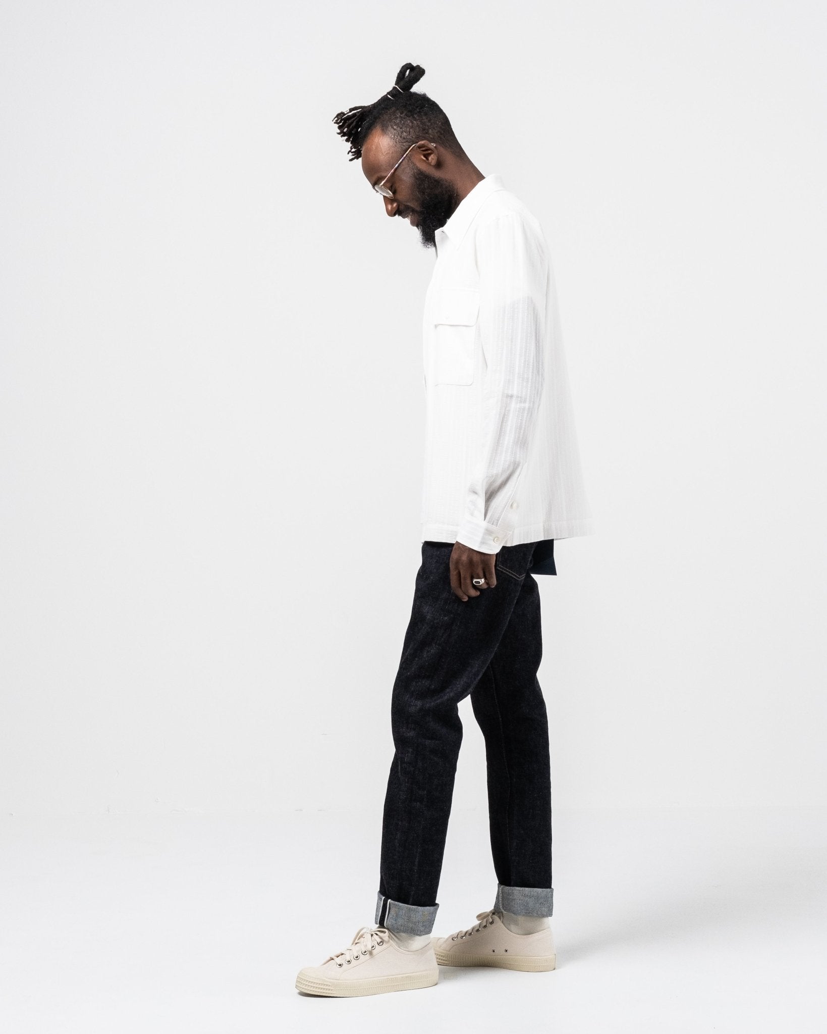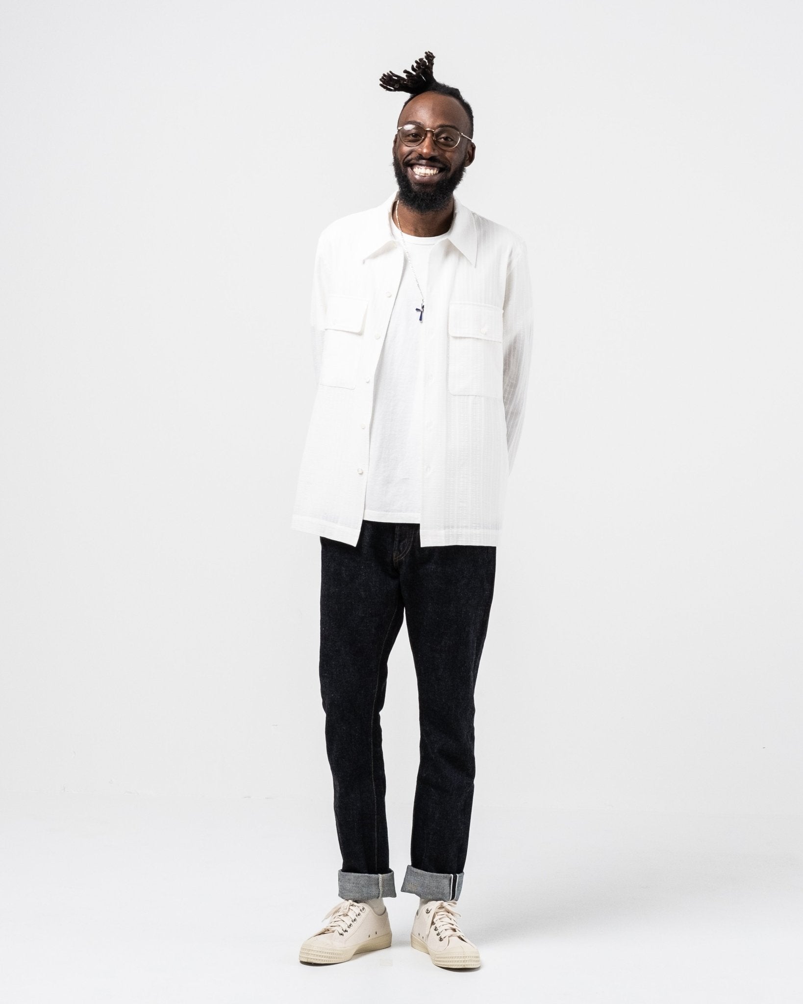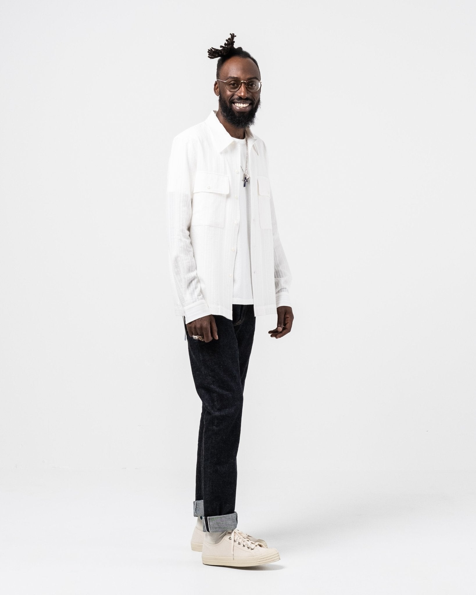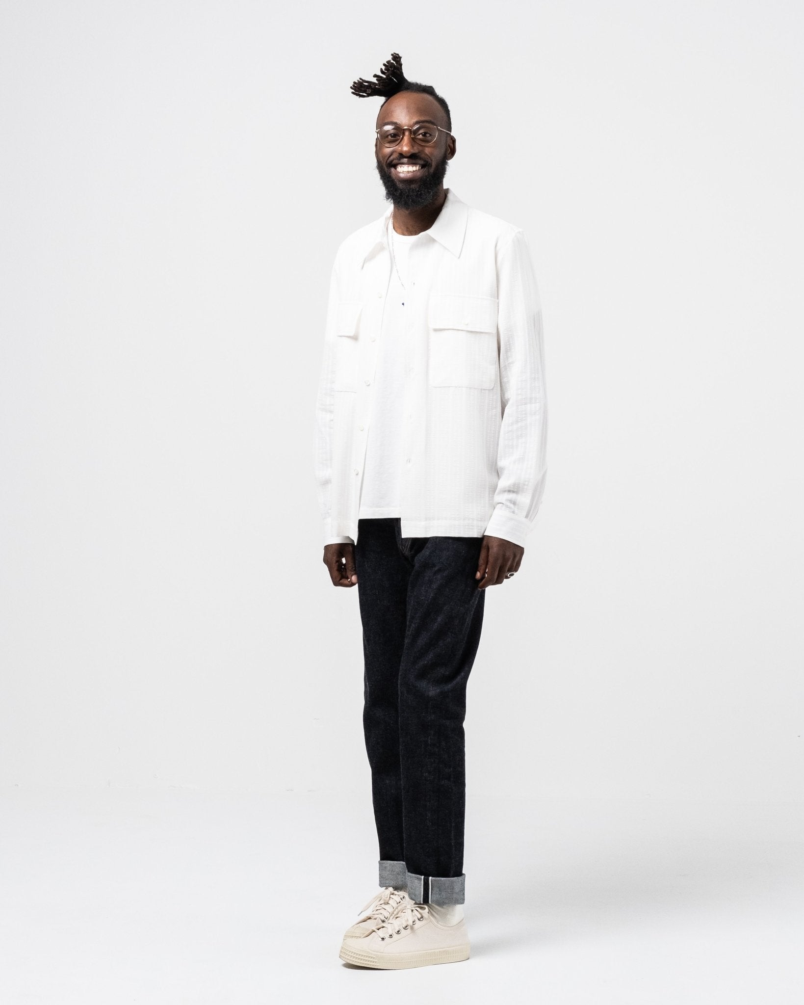 Camicia Formale Bianca Lukey di Séfr. Camicia ispirata al militare con due tasche sul petto, colletto ampio e bottoni in madreperla. Tessuto leggero e confortevole in 69% cotone, 25% lino e 6% poliammide. Prodotto in Lettonia.