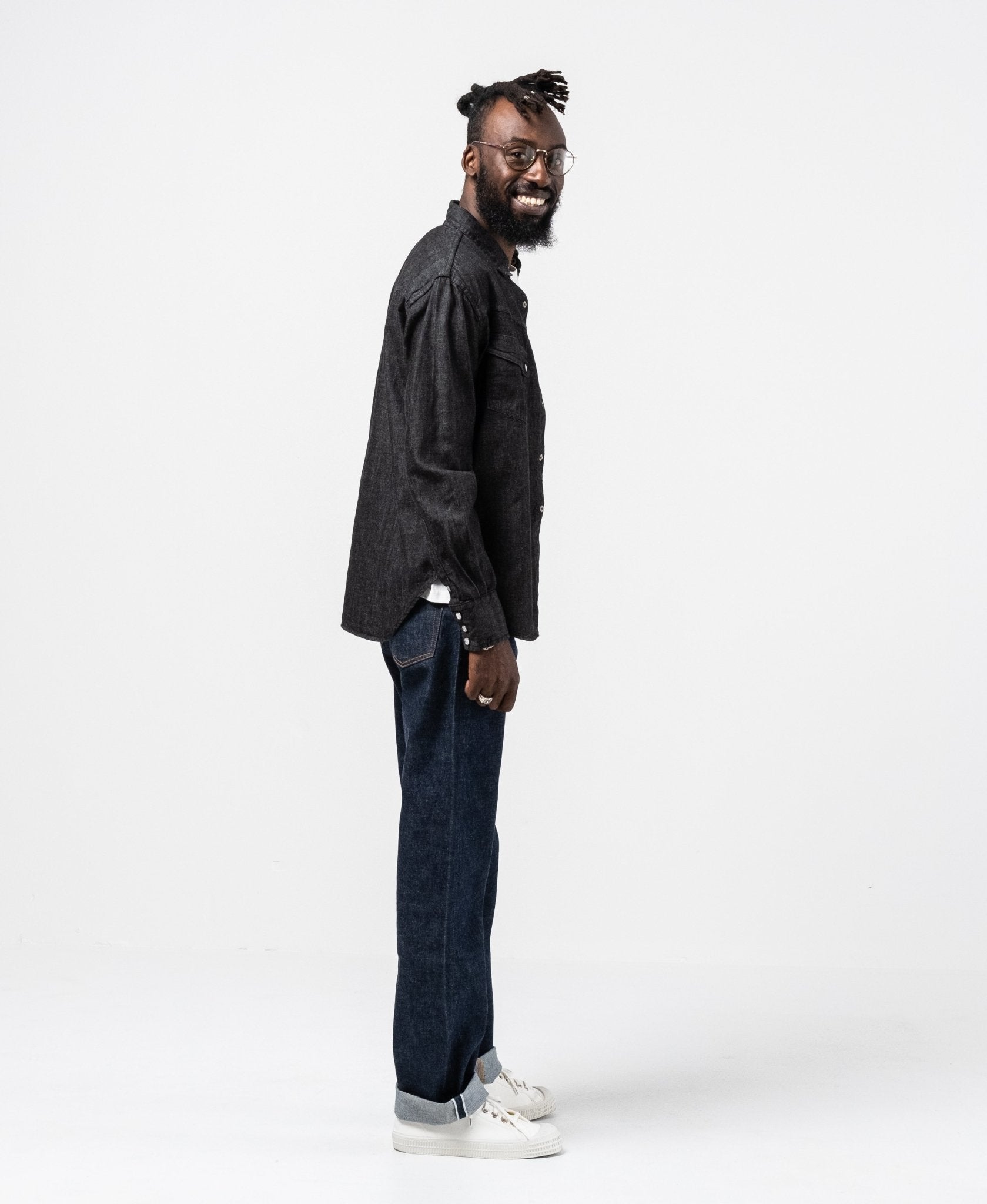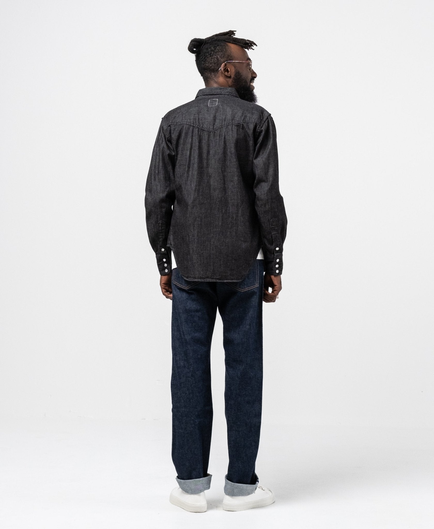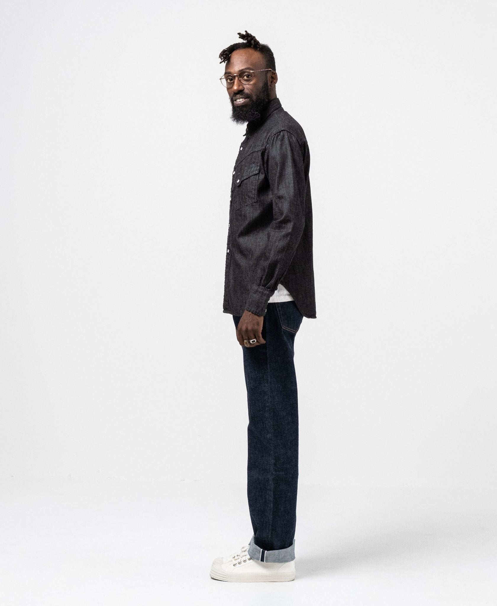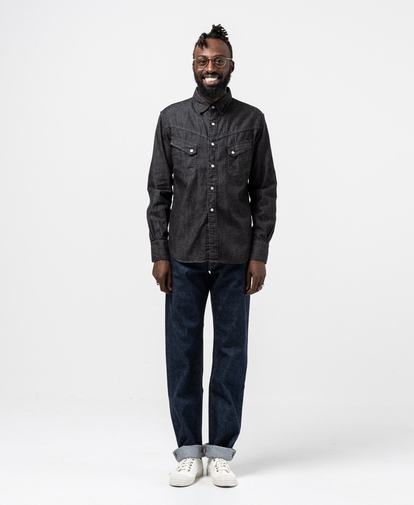 Camicia Ranchman in Denim Nero di TCB. Questa camicia trae ispirazione dalle camicie western degli anni '40. I dettagli sono molto vicini all'originale, il che rende la silhouette leggermente più pulita rispetto alla versione vintage, quindi facile da abbinare con qualsiasi stile. Il denim è realizzato in cotone californiano da 8,5 oz che viene tessuto lentamente su un vecchio telaio. È un denim leggermente più leggero che presenta alcune irregolarità nel tessuto. Prodotto in Giappone.
