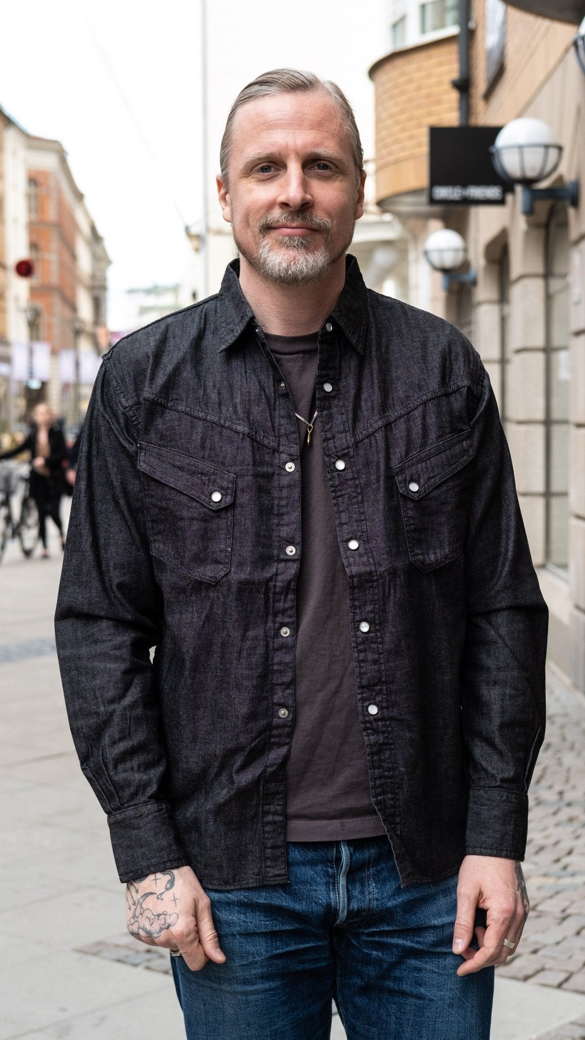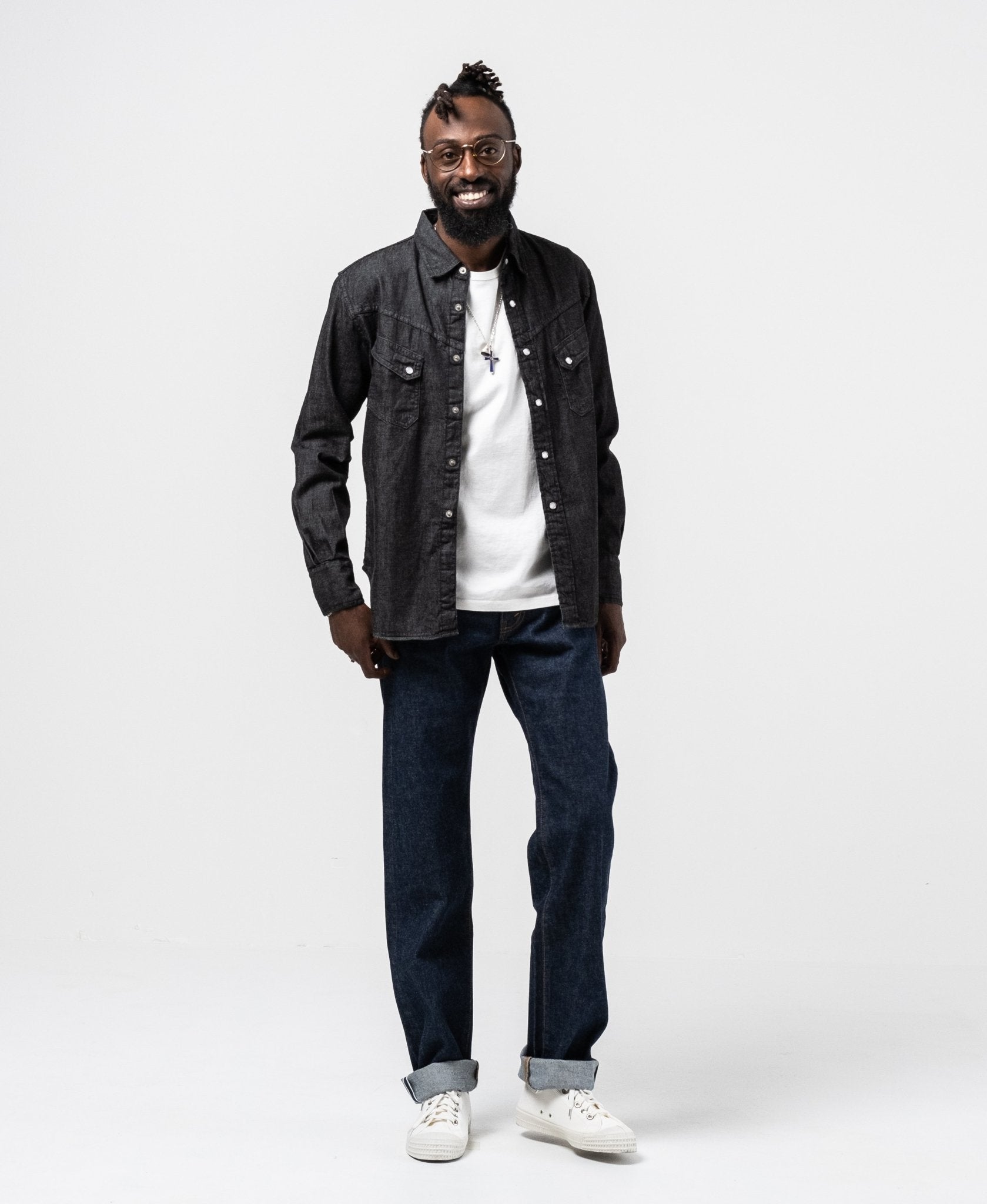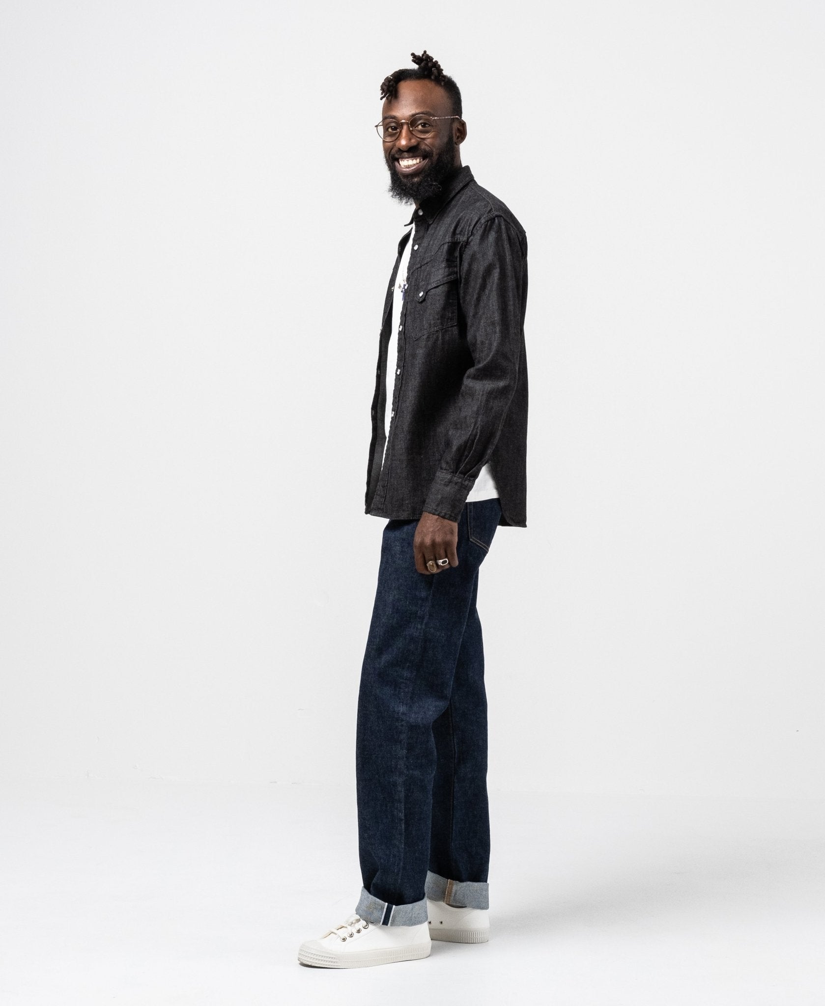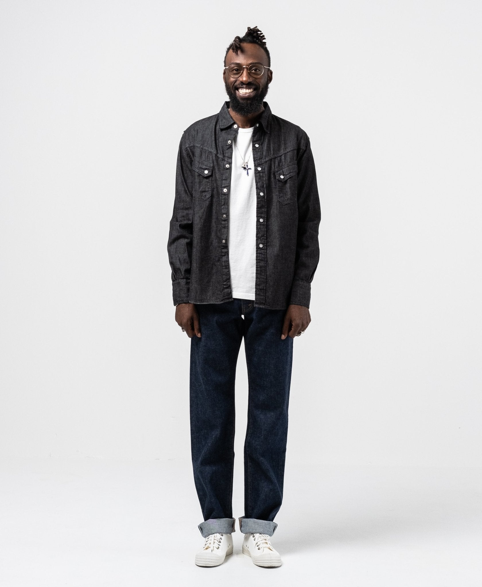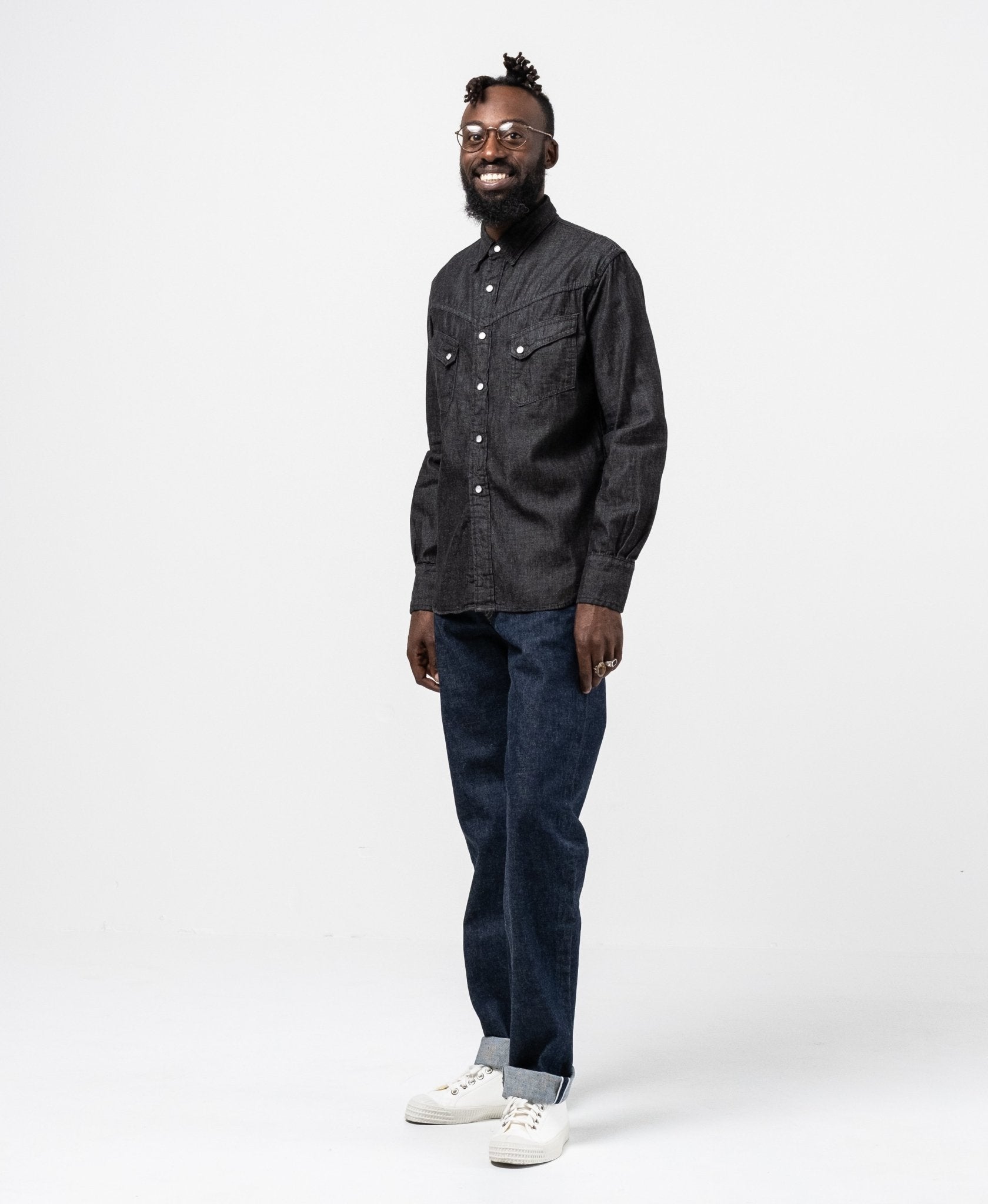 Camicia Ranchman in Denim Nero di TCB. Questa camicia trae ispirazione dalle camicie western degli anni '40. I dettagli sono molto vicini all'originale, il che rende la silhouette leggermente più pulita rispetto alla versione vintage, quindi facile da abbinare con qualsiasi stile. Il denim è realizzato in cotone californiano da 8,5 oz che viene tessuto lentamente su un vecchio telaio. È un denim leggermente più leggero che presenta alcune irregolarità nel tessuto. Prodotto in Giappone.