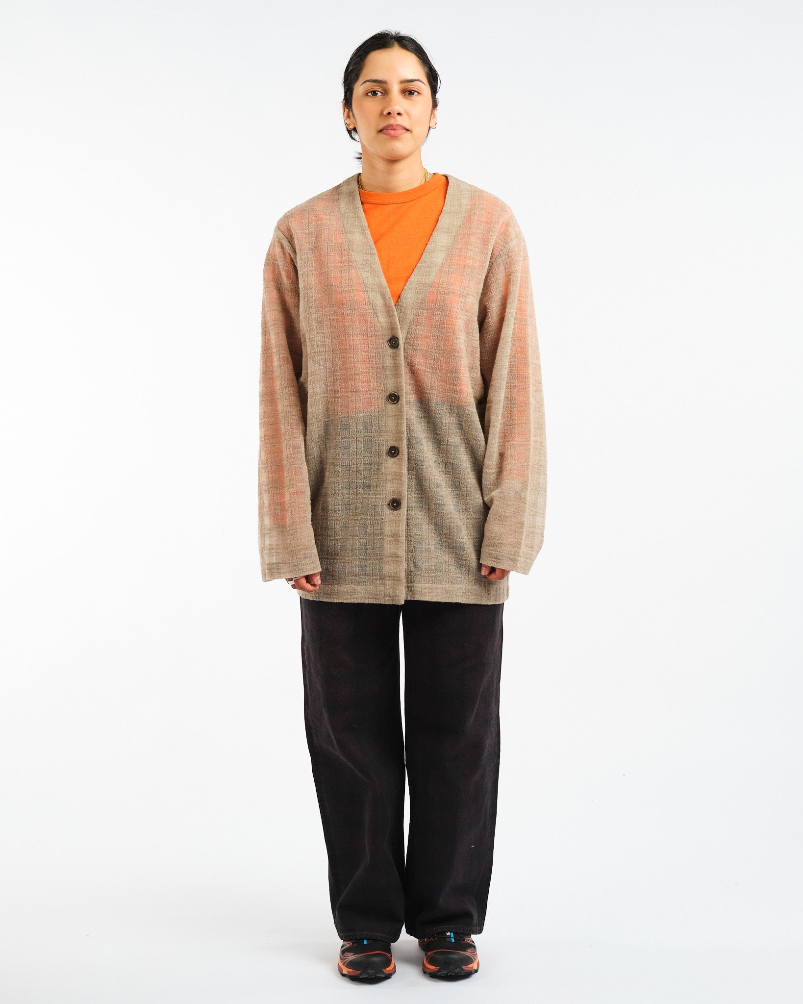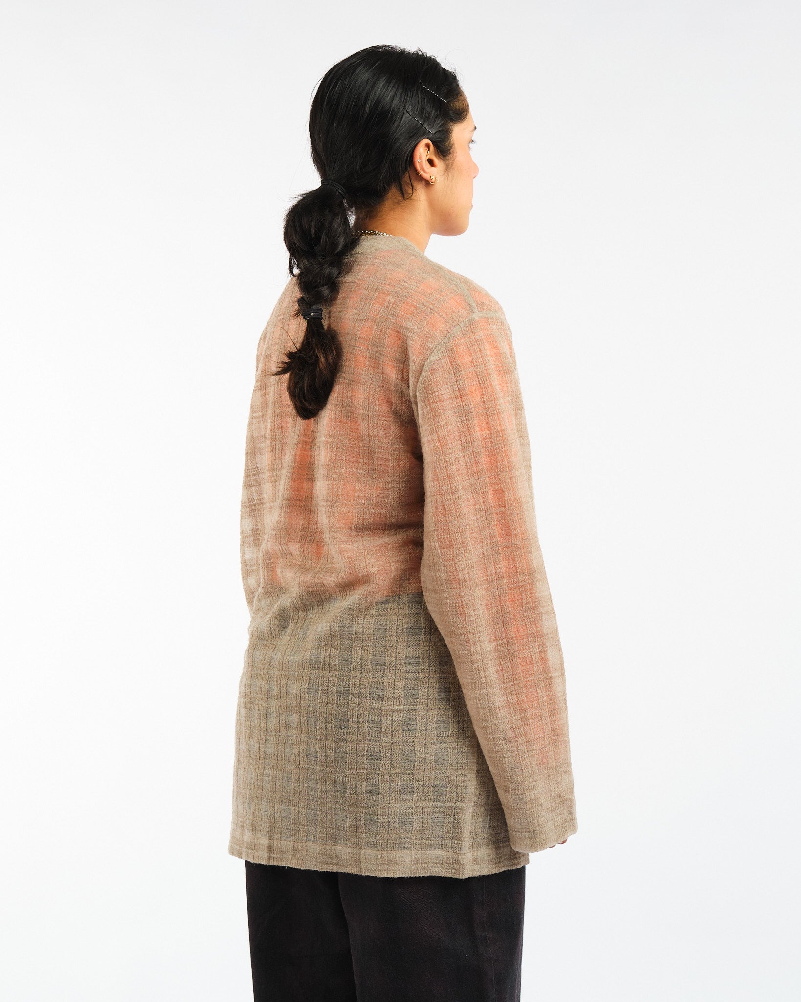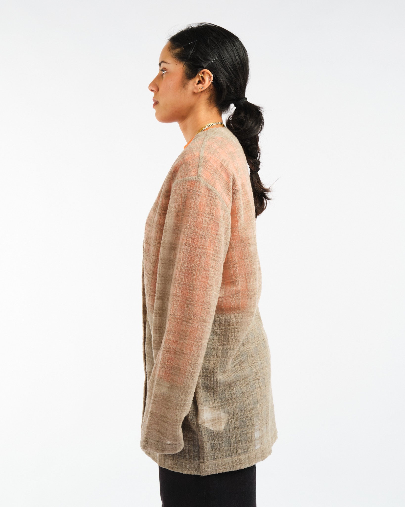 Questo capo è creato con un materiale speciale che possiede qualità uniche ed è selezionato con cura. Man mano che il portatore indossa il cardigan, questo assumerà la loro forma e si logorerà naturalmente nel tempo, completando il processo di design.