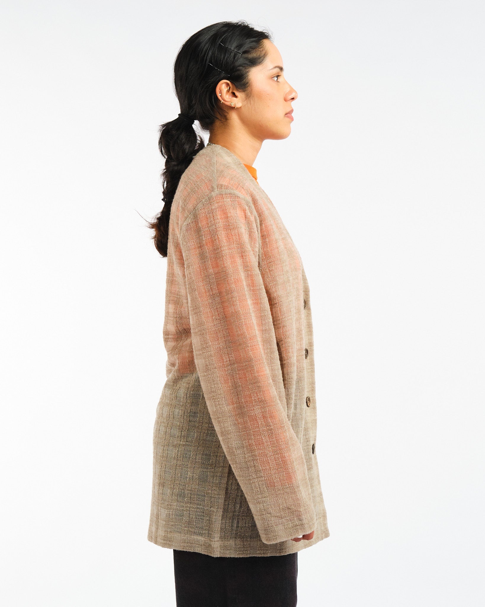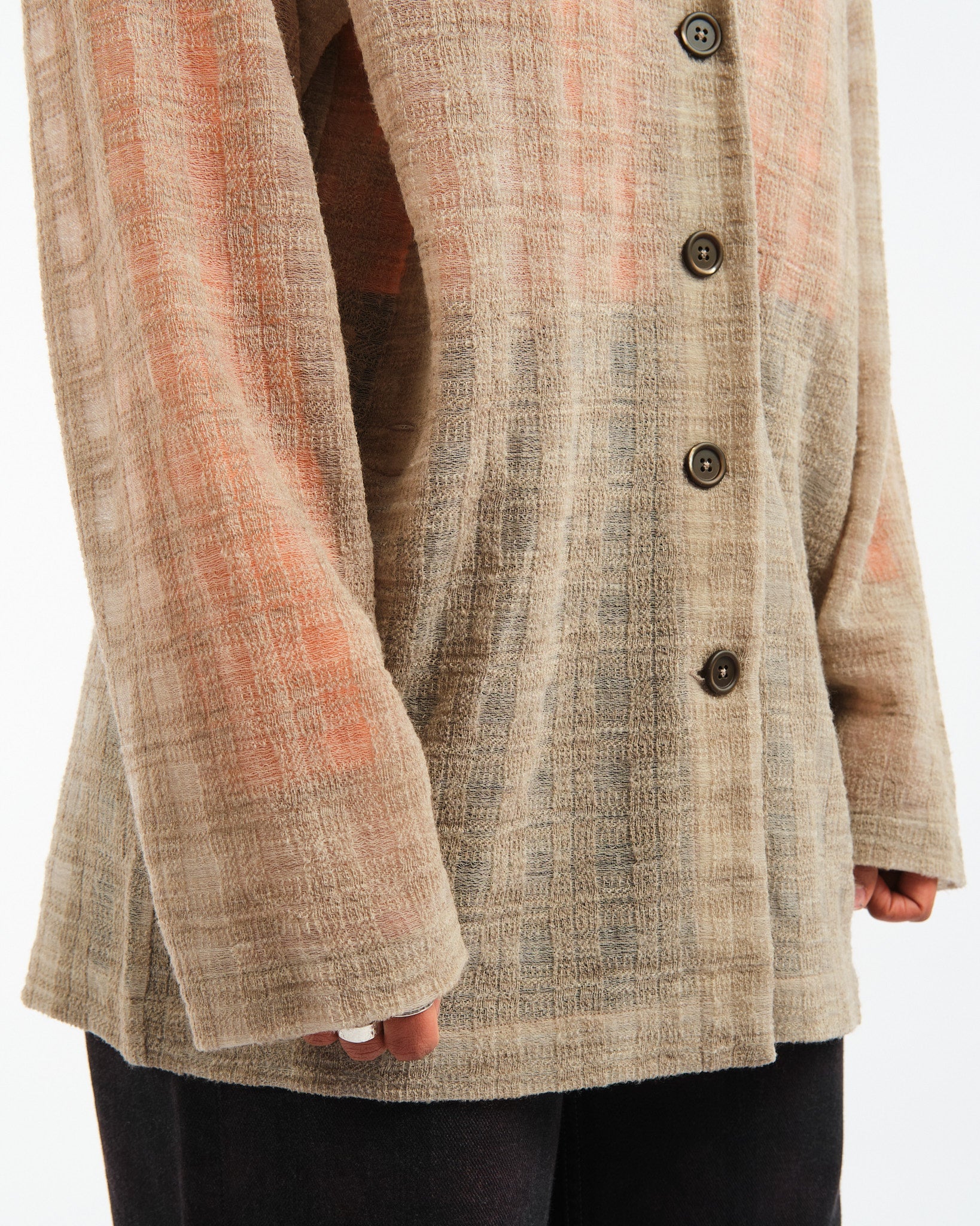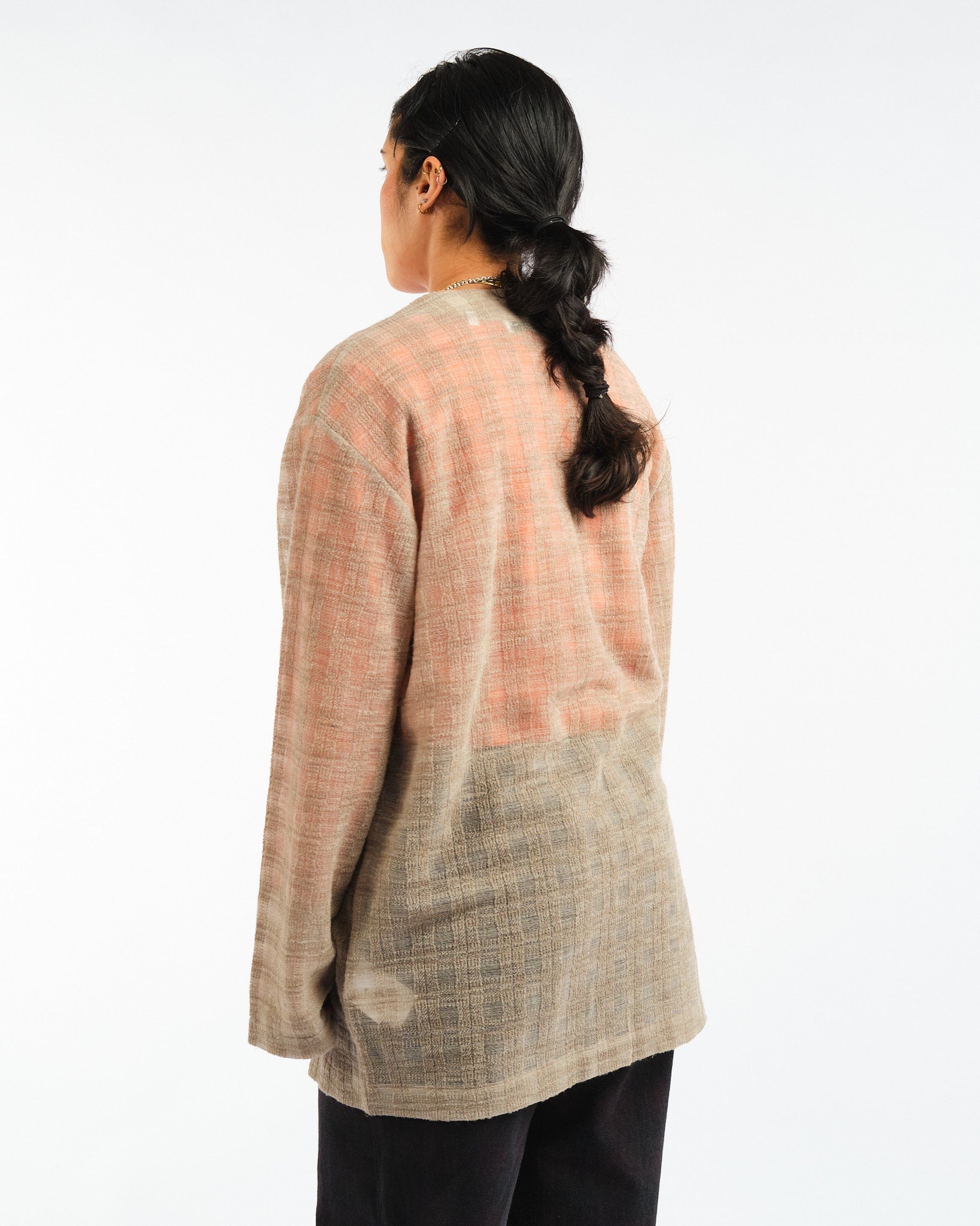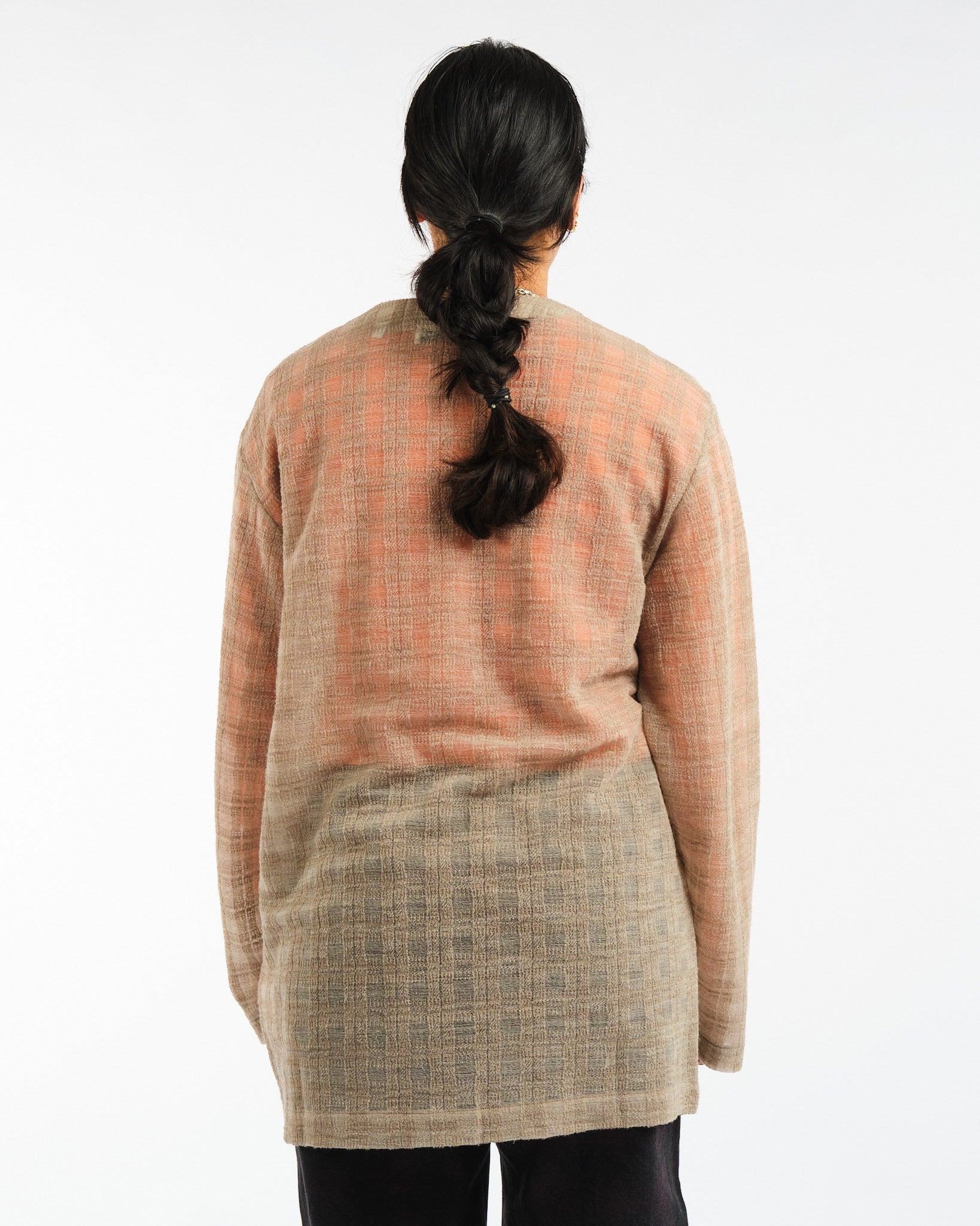 Questo capo è creato con un materiale speciale che possiede qualità uniche ed è selezionato con cura. Man mano che il portatore indossa il cardigan, questo assumerà la loro forma e si logorerà naturalmente nel tempo, completando il processo di design.
