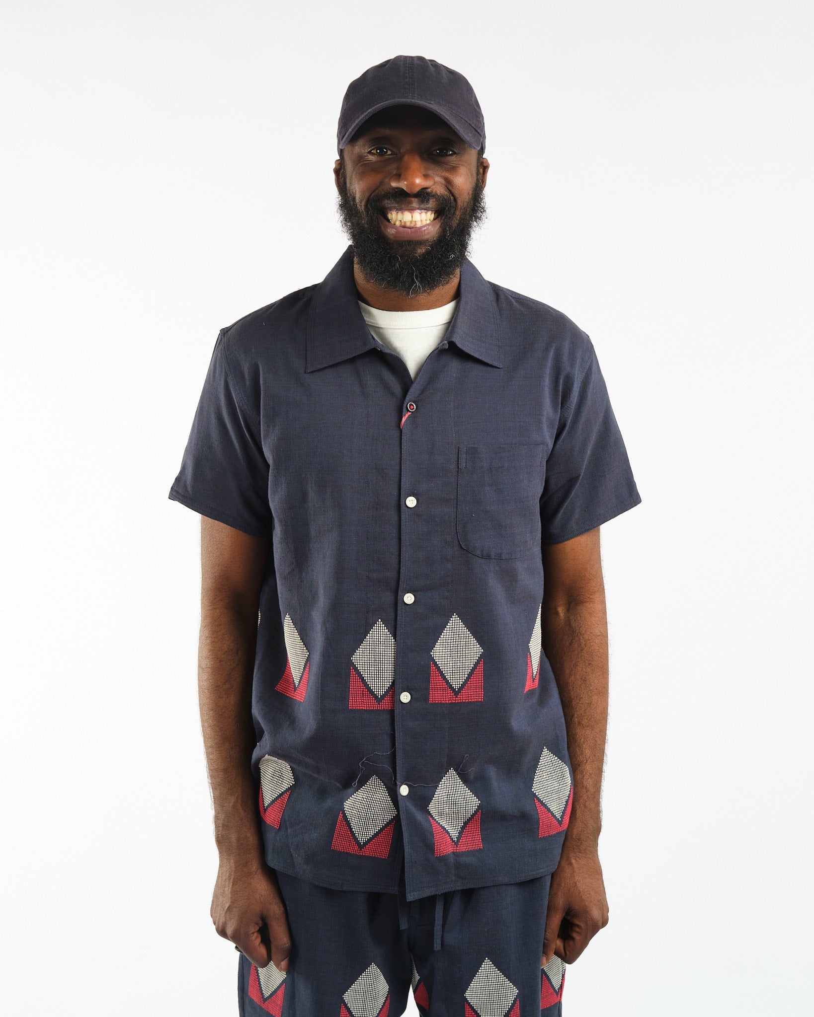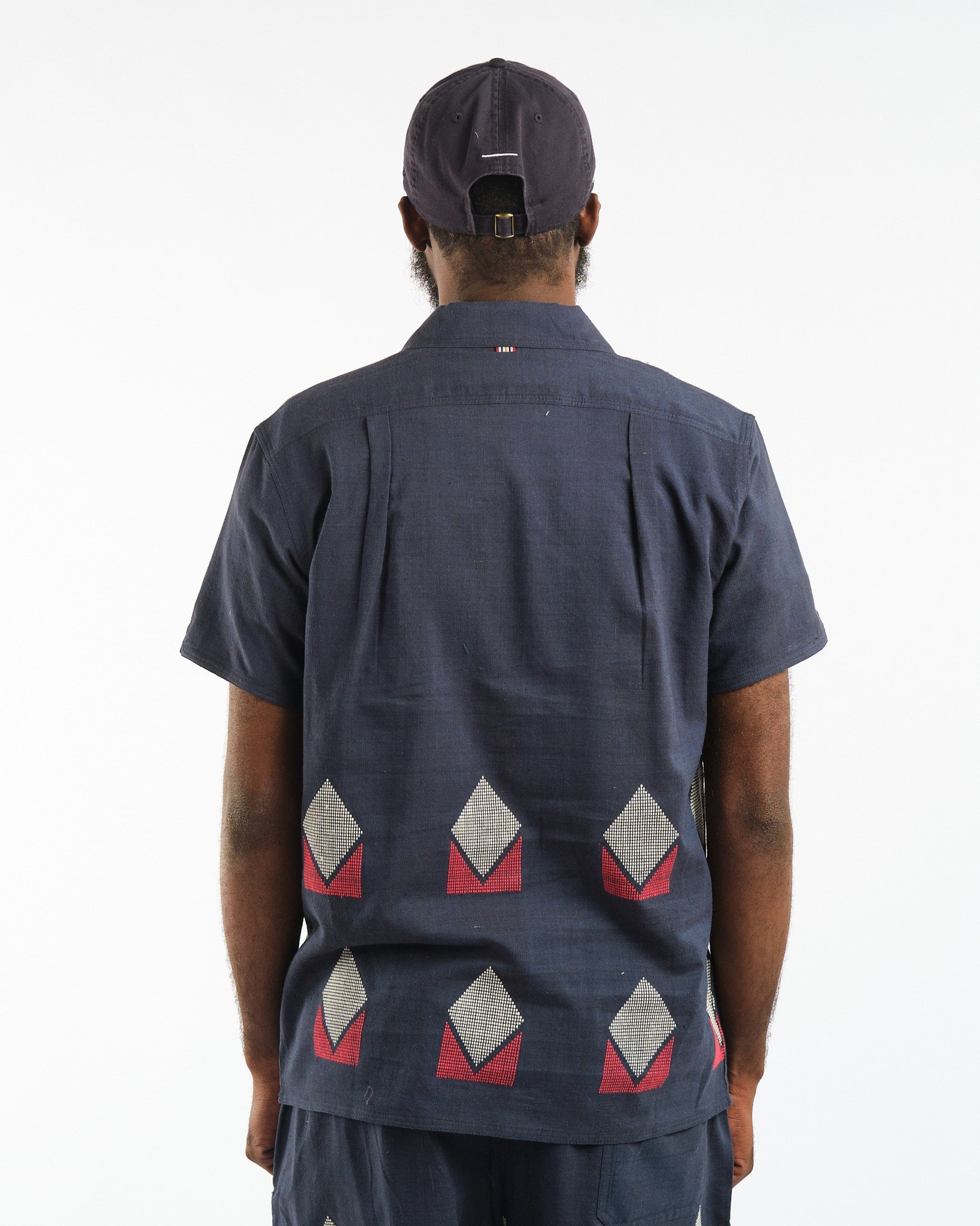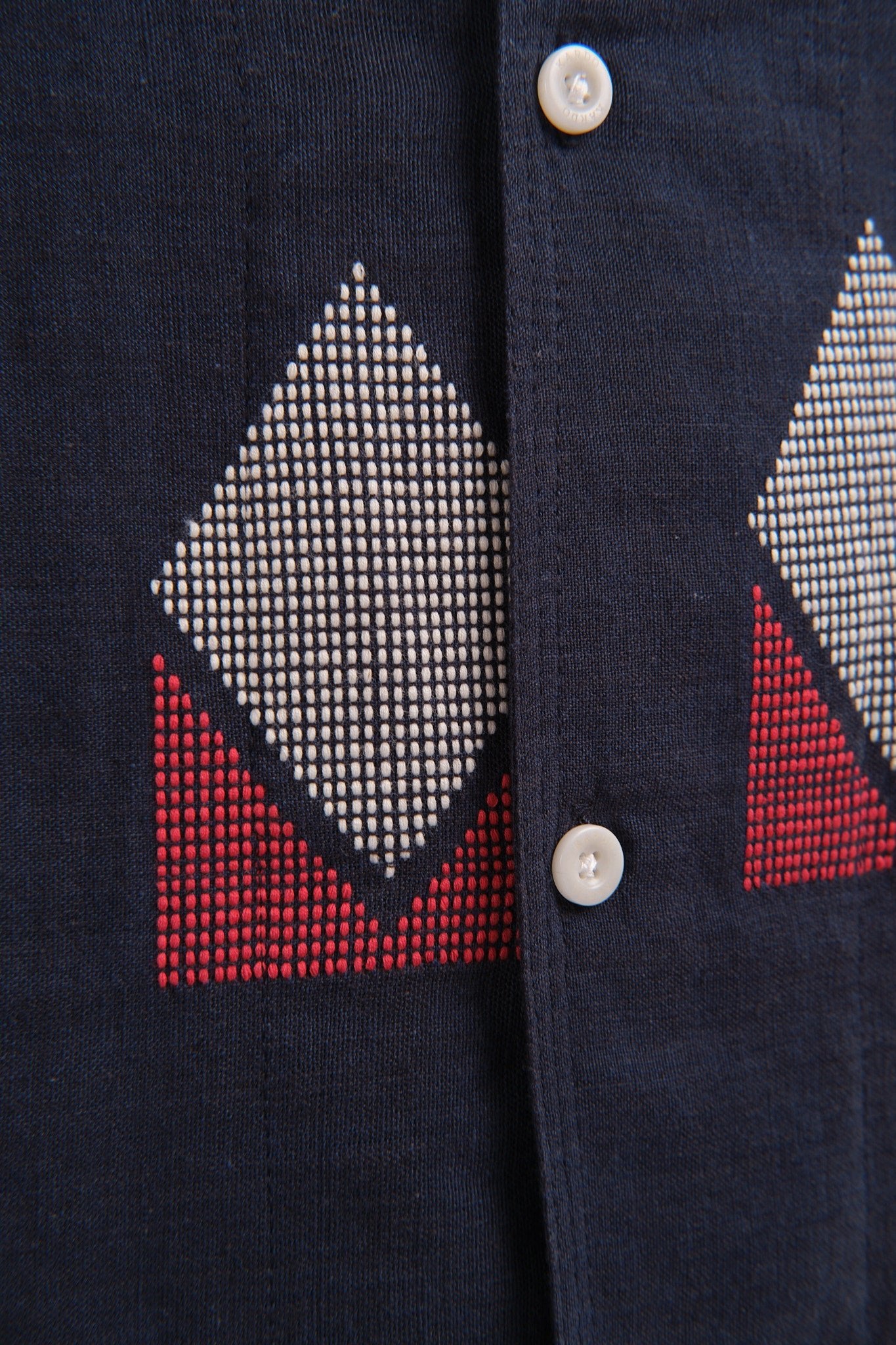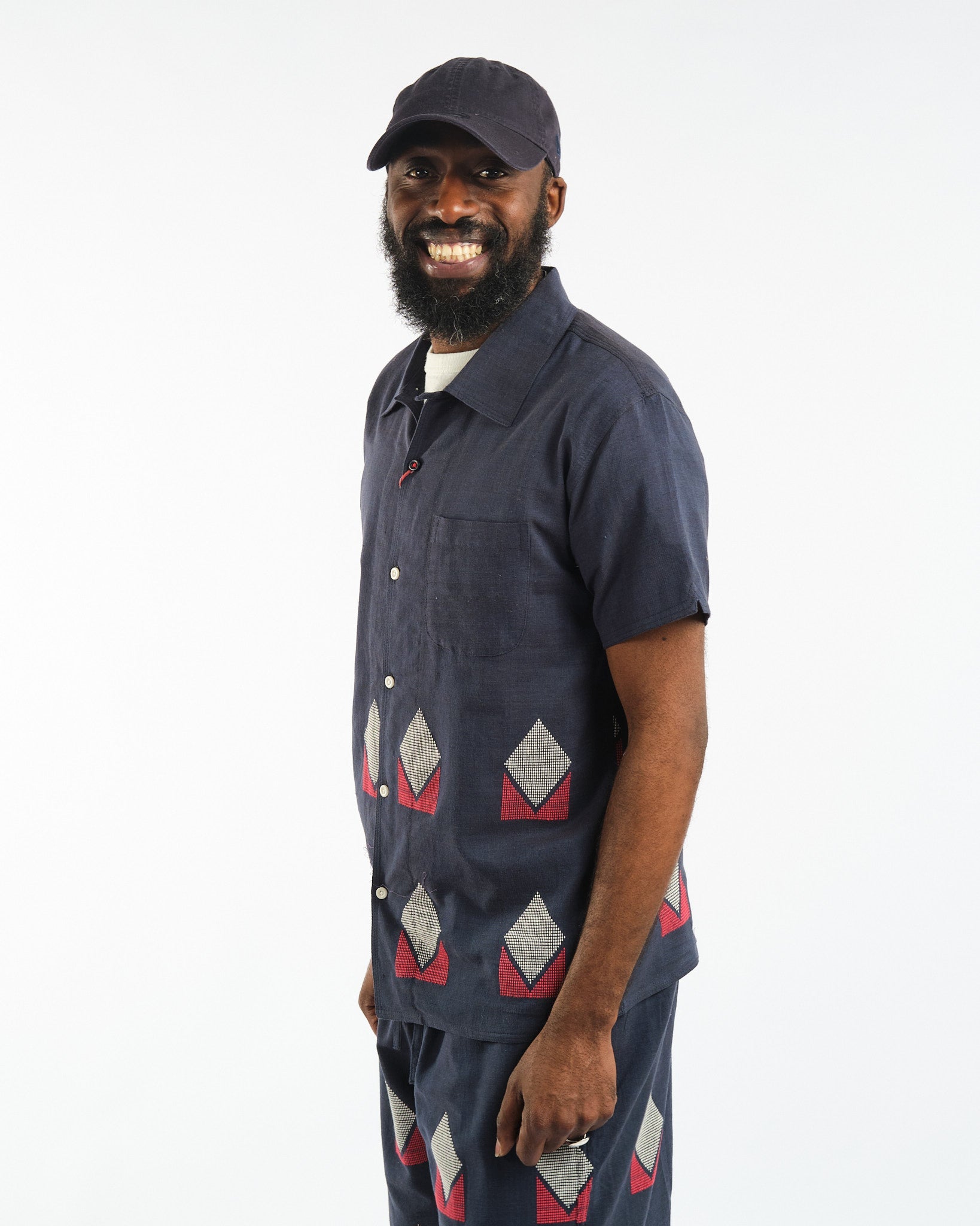 Vivi il massimo comfort e stile con la camicia navy Kardo Chintan Bunkar. Filata e tessuta a mano dai tessitori Nasruddin e Amresh di Bun.Kar, questo cotone khadi presenta motivi a trama extra ispirati ai templi buddisti e all'architettura di Bodh Gaya in Bihar, il luogo dove Buddha ha raggiunto l'illuminazione. Questa camicia a maniche corte ha una vestibilità ampia e un colletto aperto, con motivi Bun.Kar per un dettaglio aggiunto. I bottoni in corozo e i tocchi finiti a mano creano un aspetto sofisticato e moderno, essendo realizzati da un solo sarto dall'inizio alla fine per una qualità aggiunta.