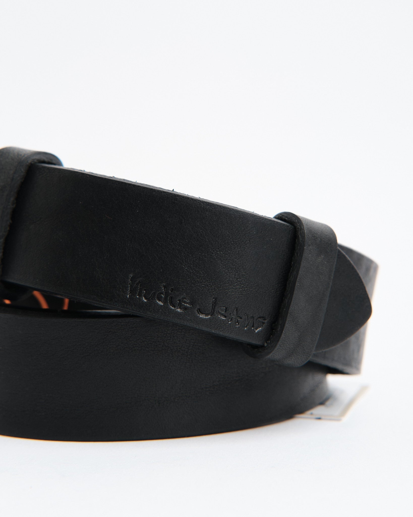 Cintura in Pelle Dwayne Nera di Nudie Jeans Co. Realizzata in pelle pieno fiore conciata al vegetale che invecchia magnificamente. Due passanti, fibbia in metallo e logo Nudie Jeans impresso. 100% pelle e larghezza 28 mm. Le taglie sono in cm. Prodotto in Polonia.