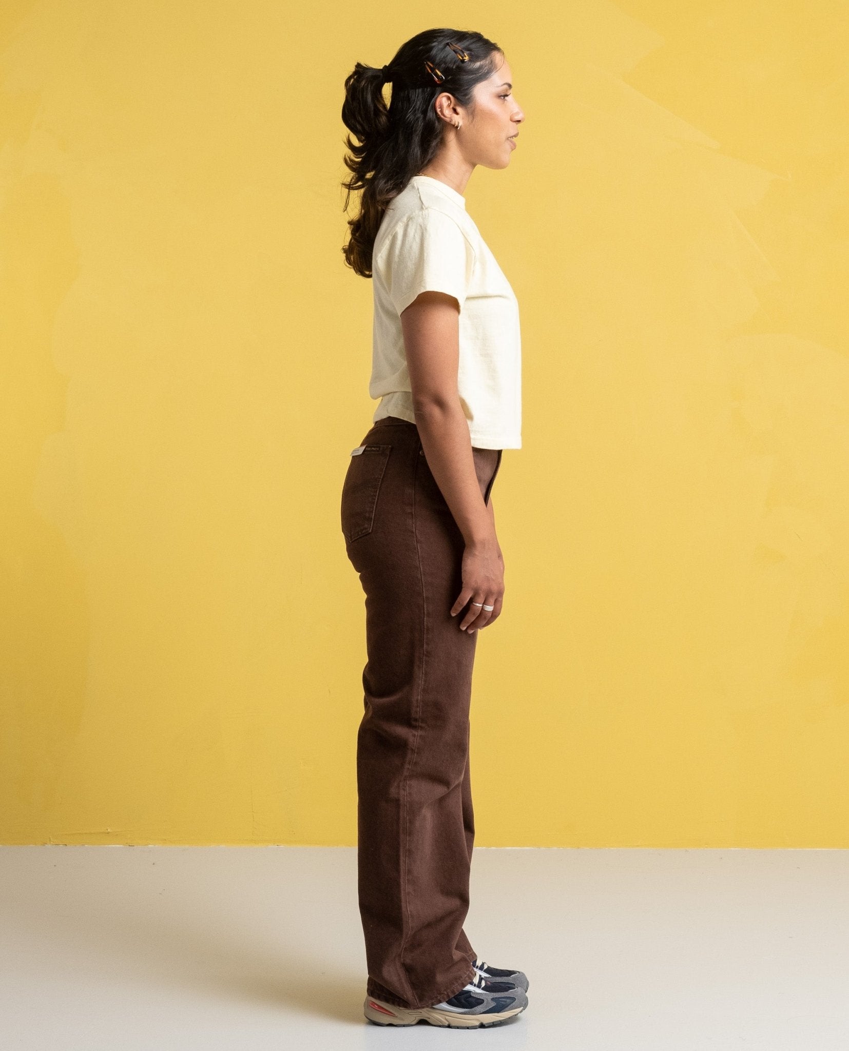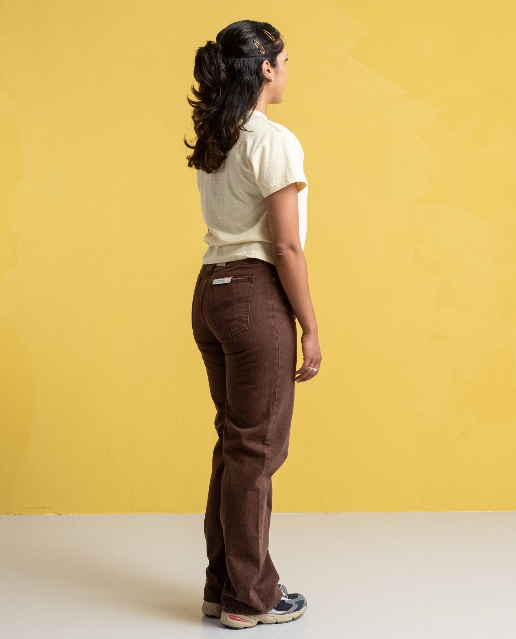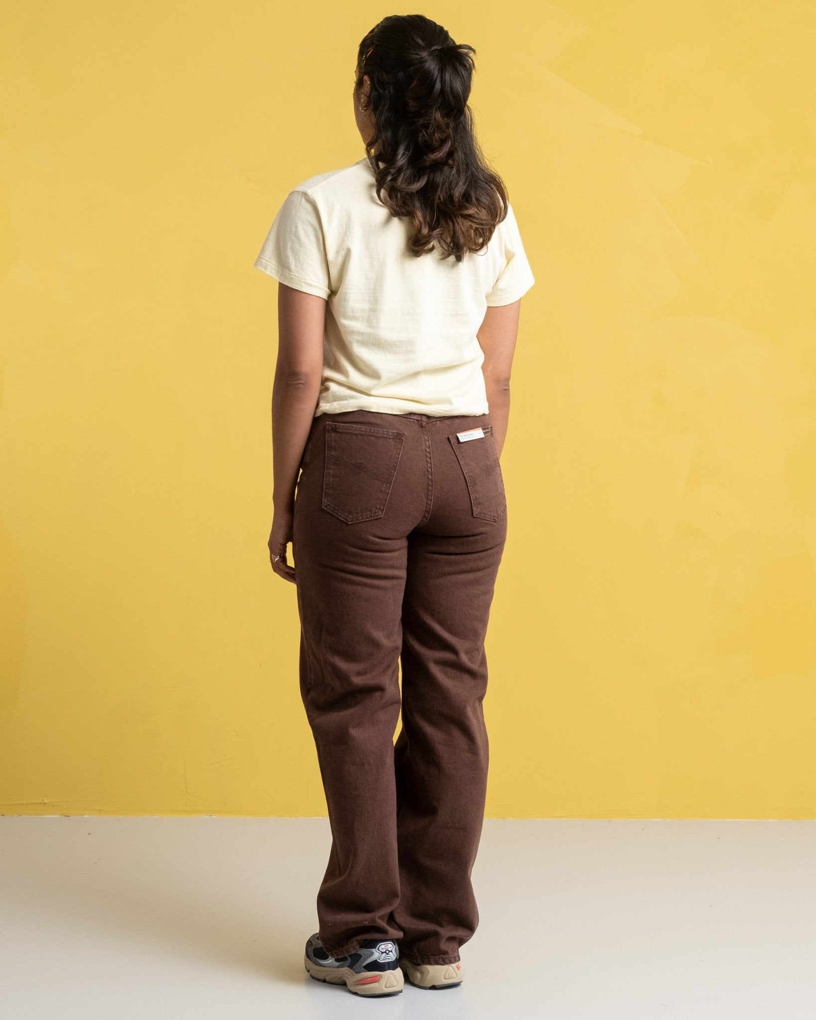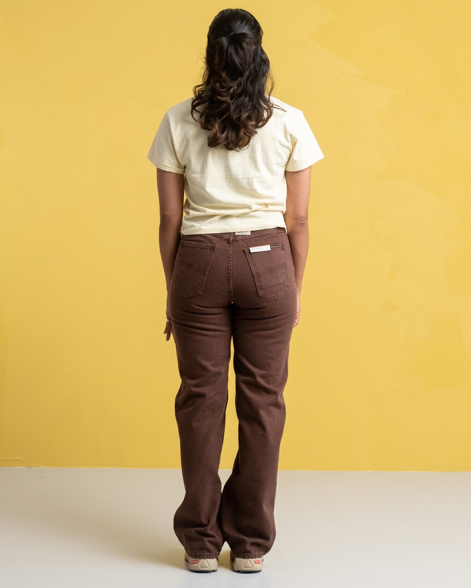 Clean Eileen Cinnamon di Nudie Jeans Co. Jeans da donna a vestibilità larga con vita alta e gambe ampie. Qui in un bel tono terroso con un sottile aspetto consumato. Realizzati in cotone organico 100%. Prodotto in Tunisia.