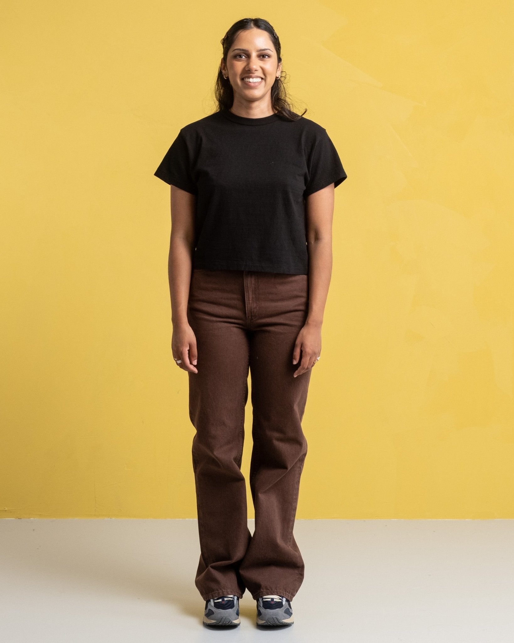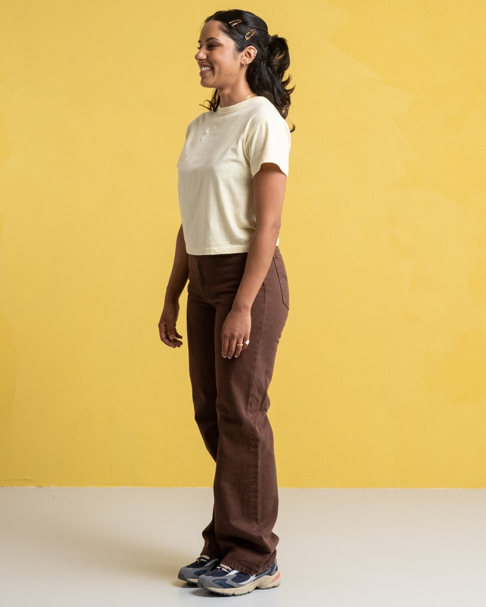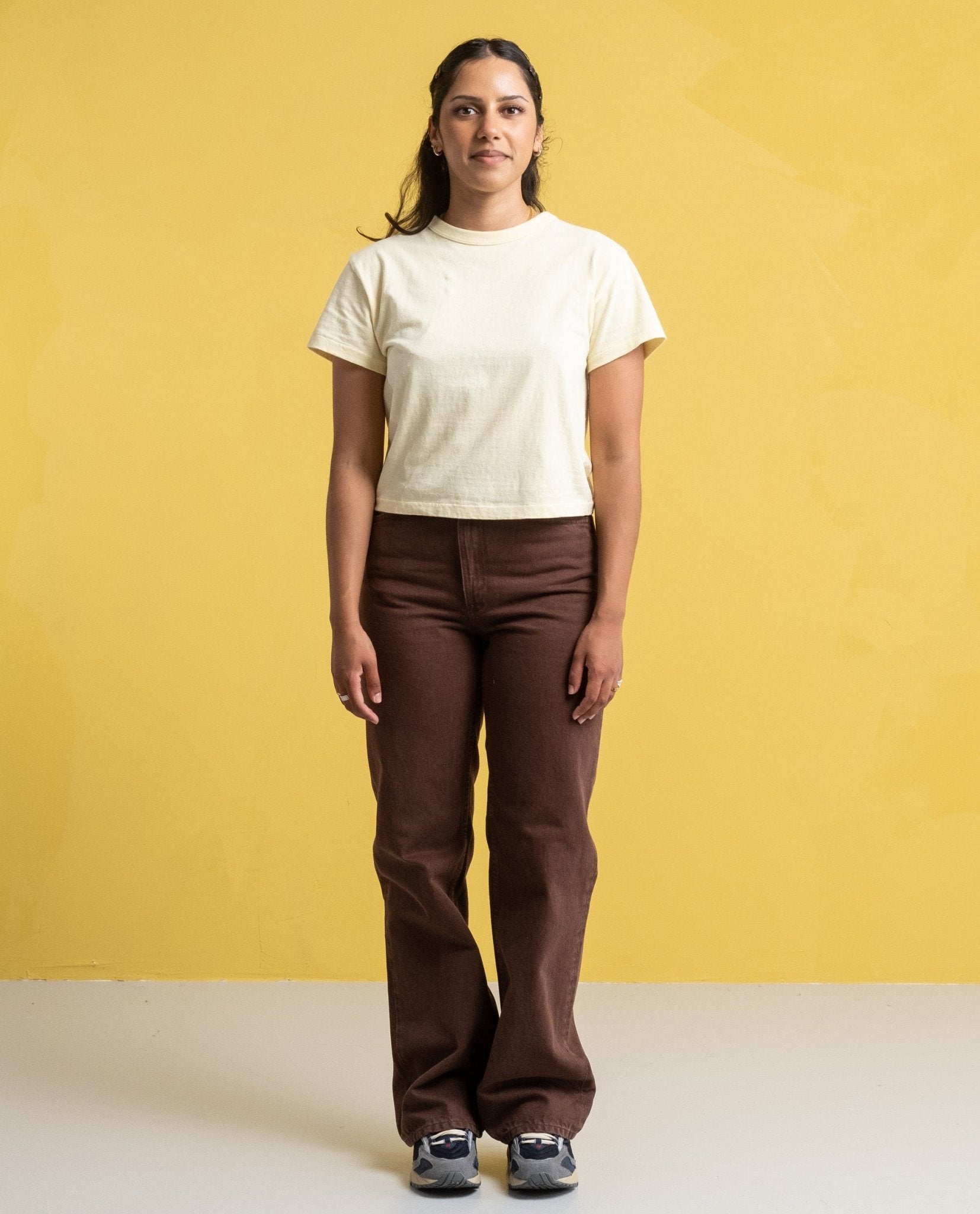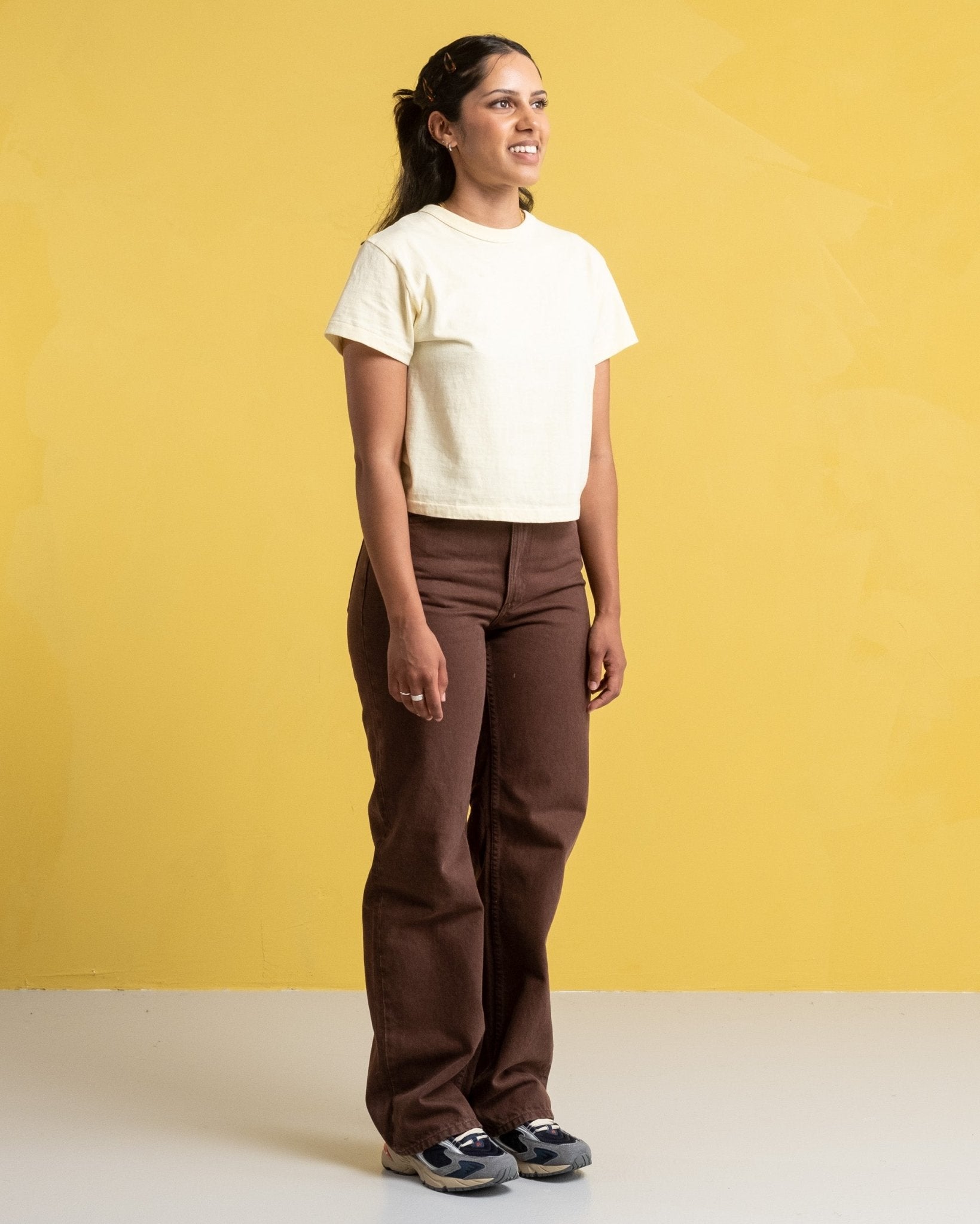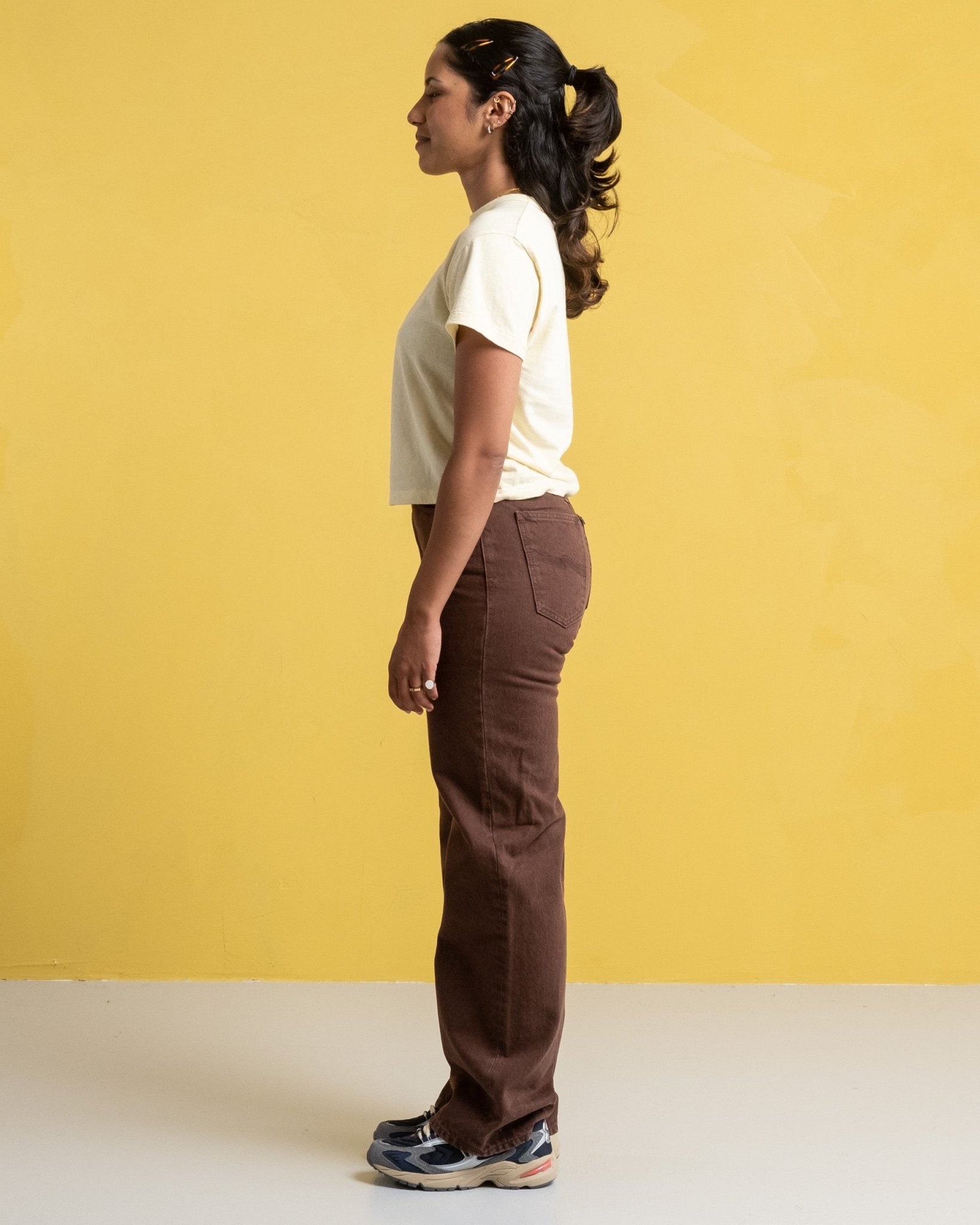 Clean Eileen Cinnamon di Nudie Jeans Co. Jeans da donna a vestibilità larga con vita alta e gambe ampie. Qui in un bel tono terroso con un sottile aspetto consumato. Realizzati in cotone organico 100%. Prodotto in Tunisia.