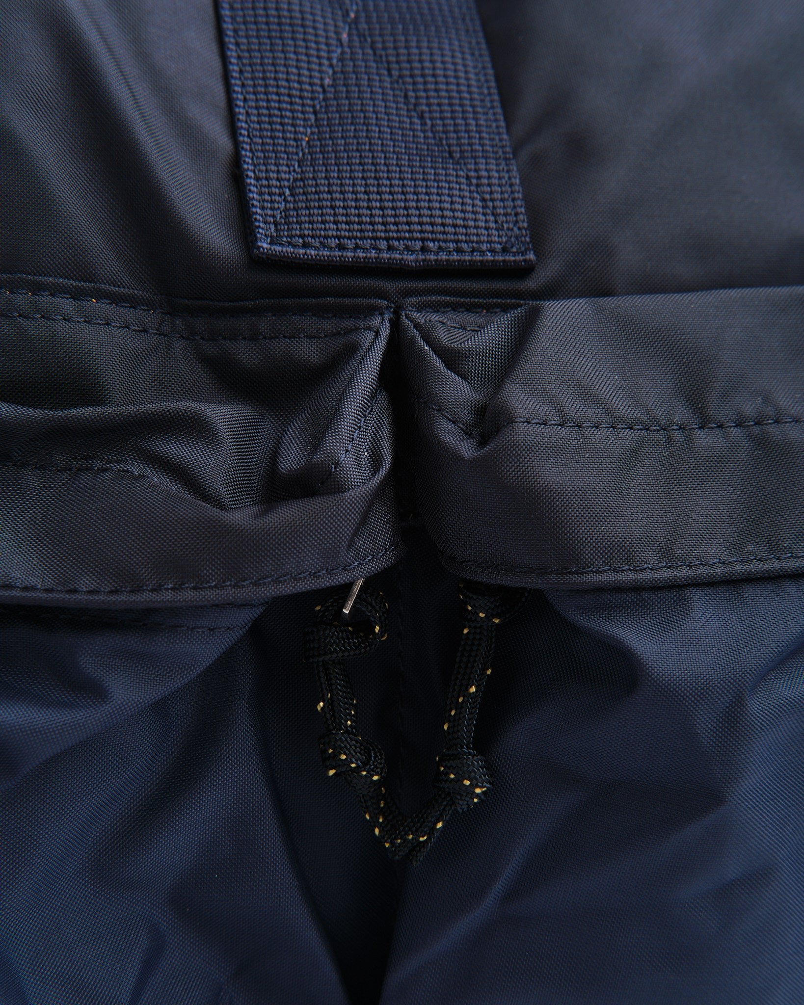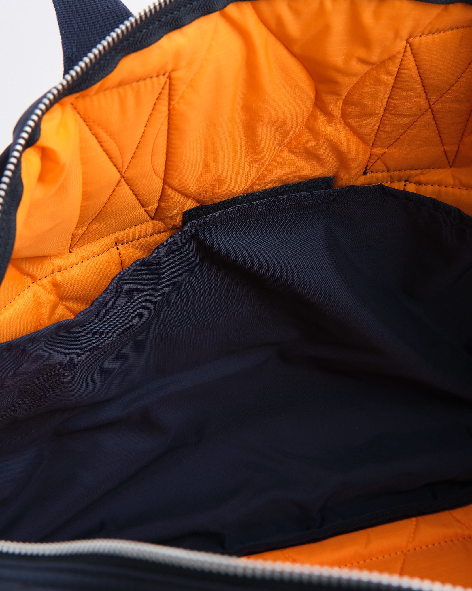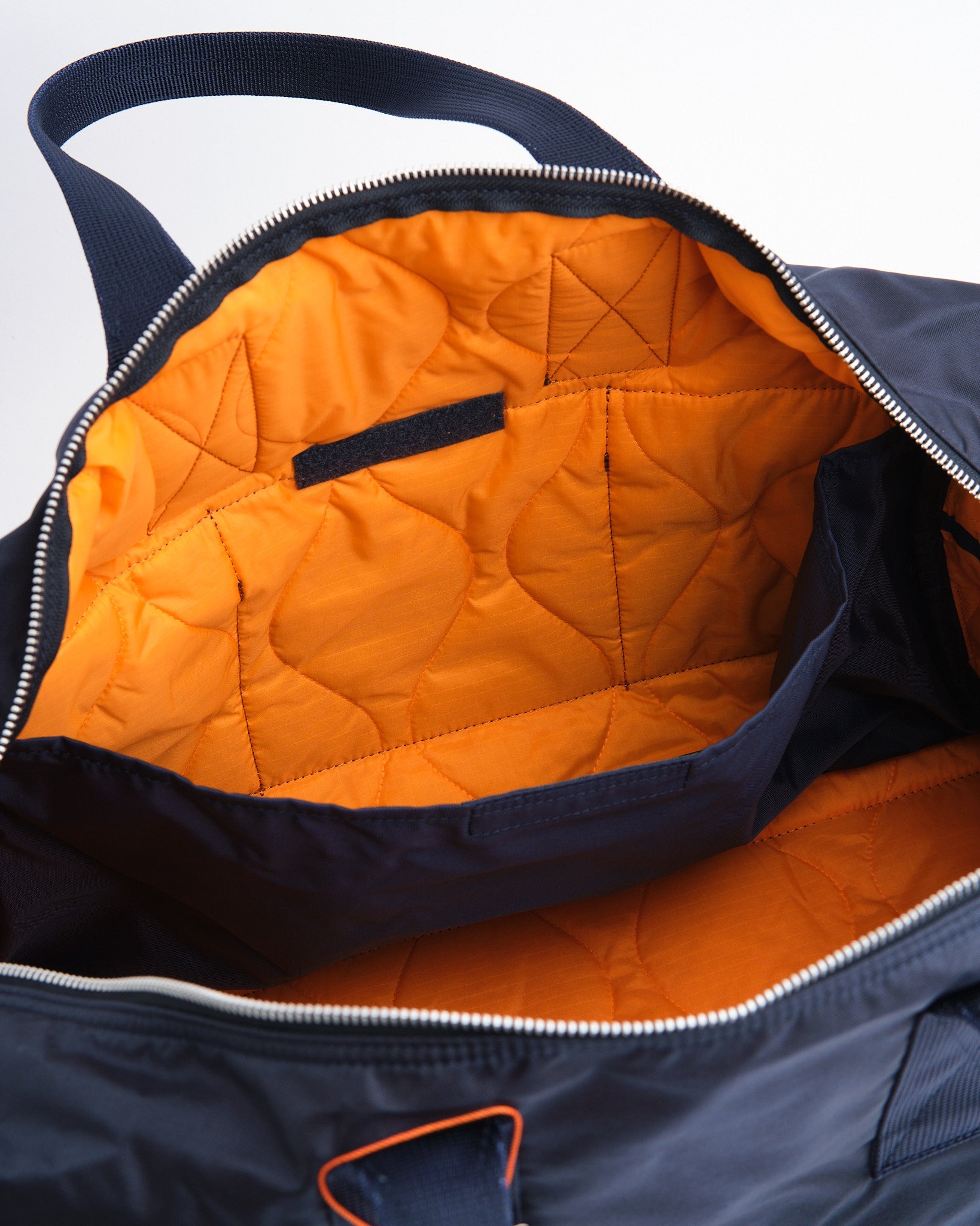 Realizzata in tessuto di grado industriale intessuto con filo di nylon forte da 210 denari 6, originariamente usato per le barche di gomma, la borsa è eccezionalmente resistente. L'interno vanta una fodera di colore arancione di emergenza, ispirata alle fodere delle giacche militari, e presenta nylon trapuntato antistrappo per una maggiore resilienza.