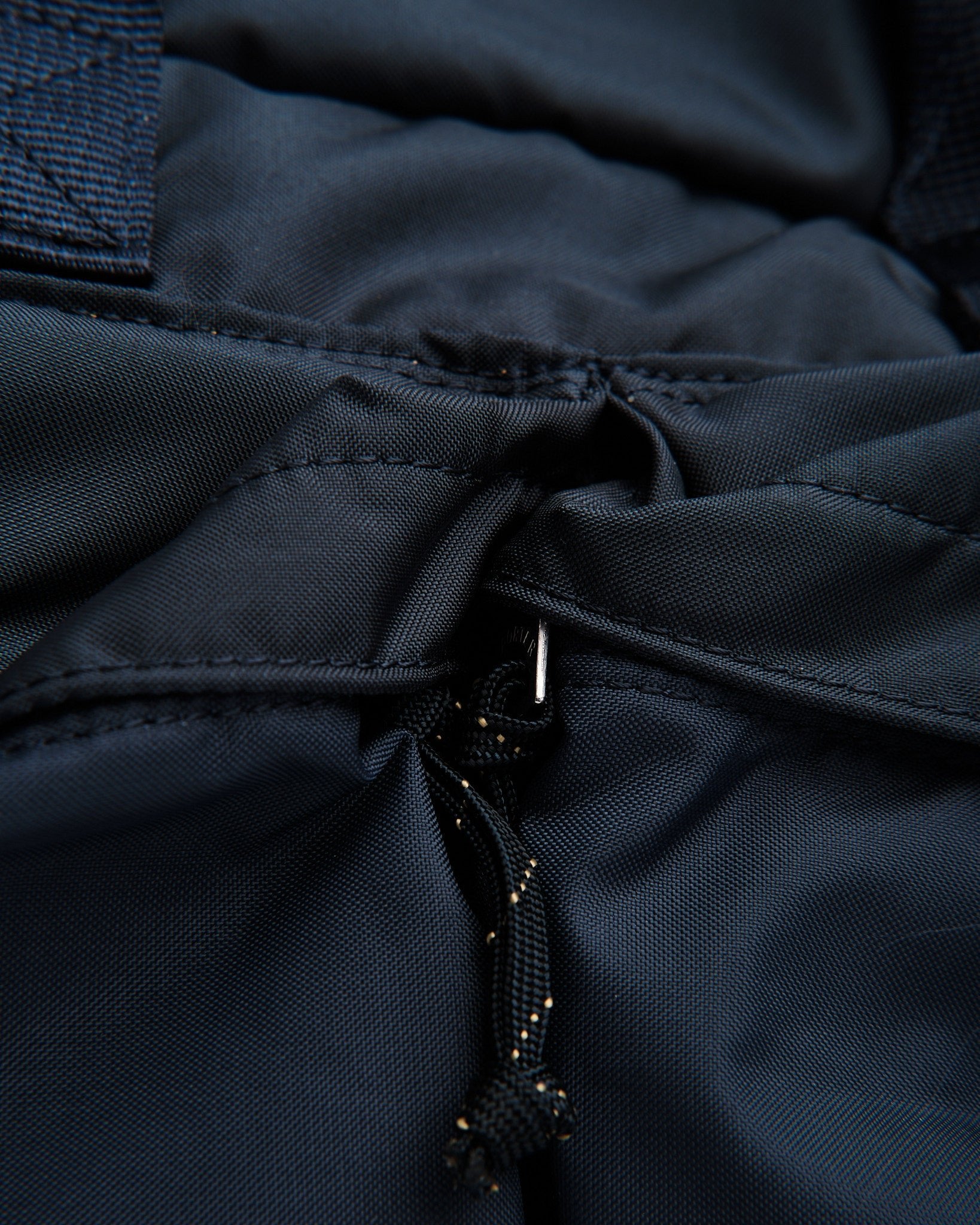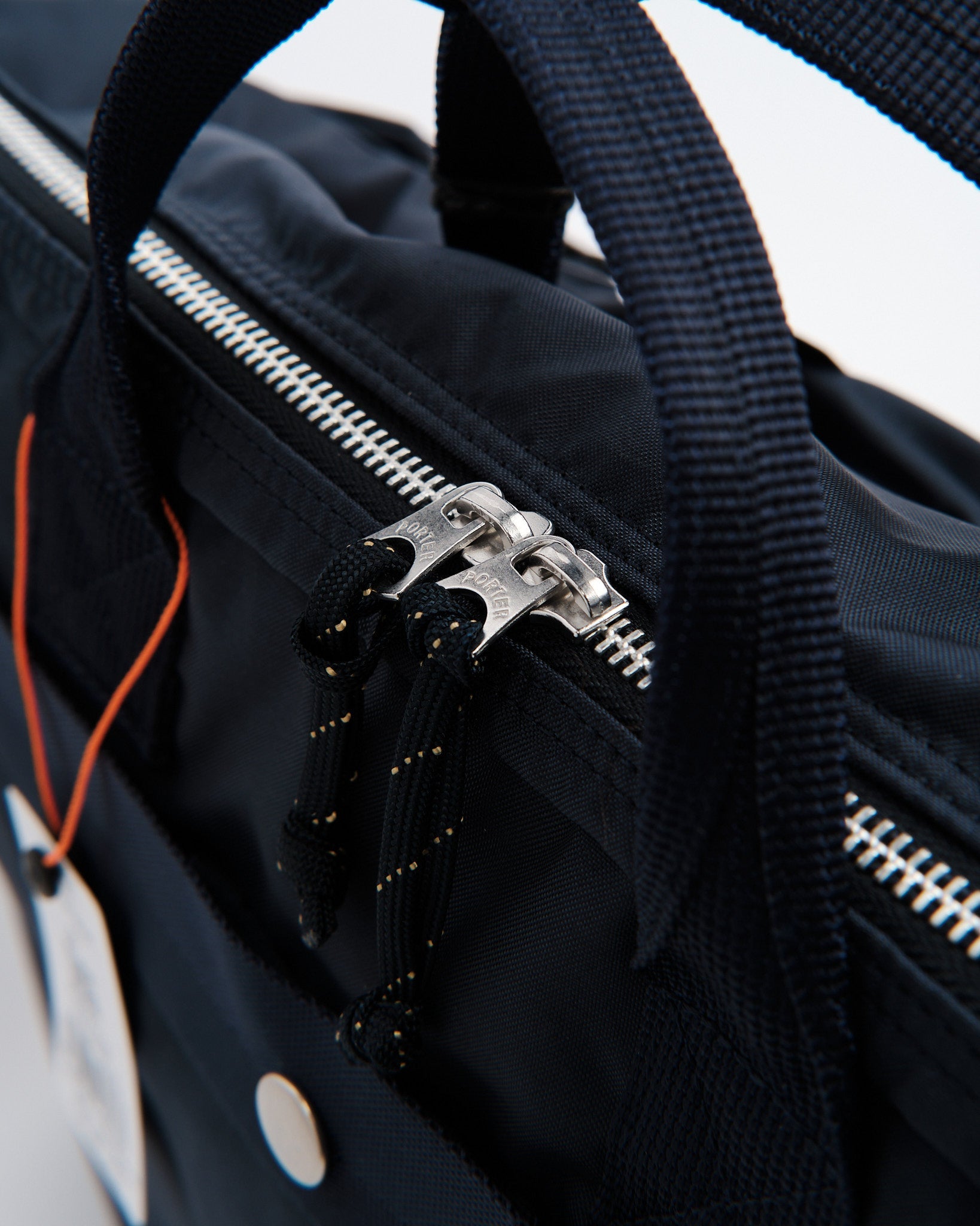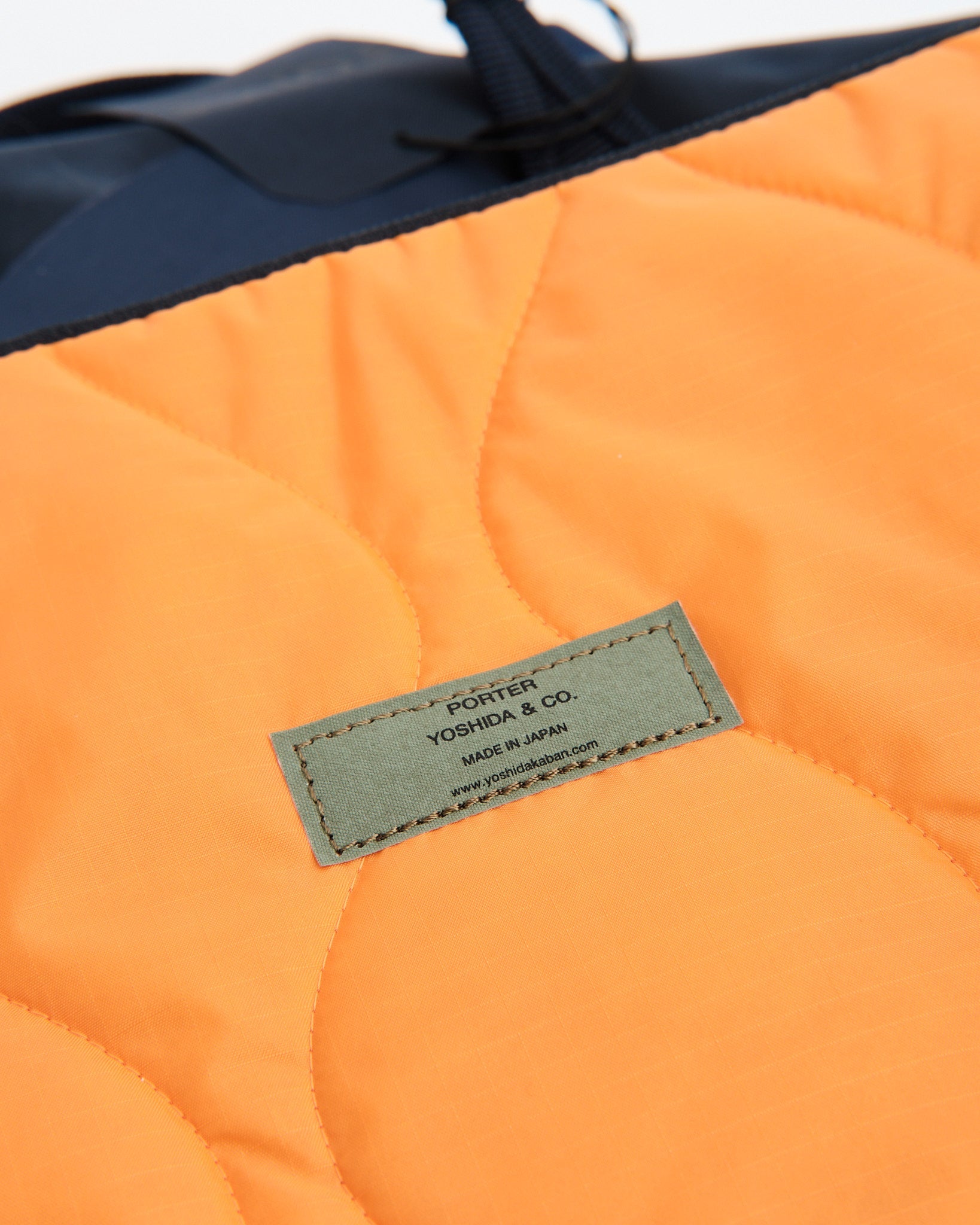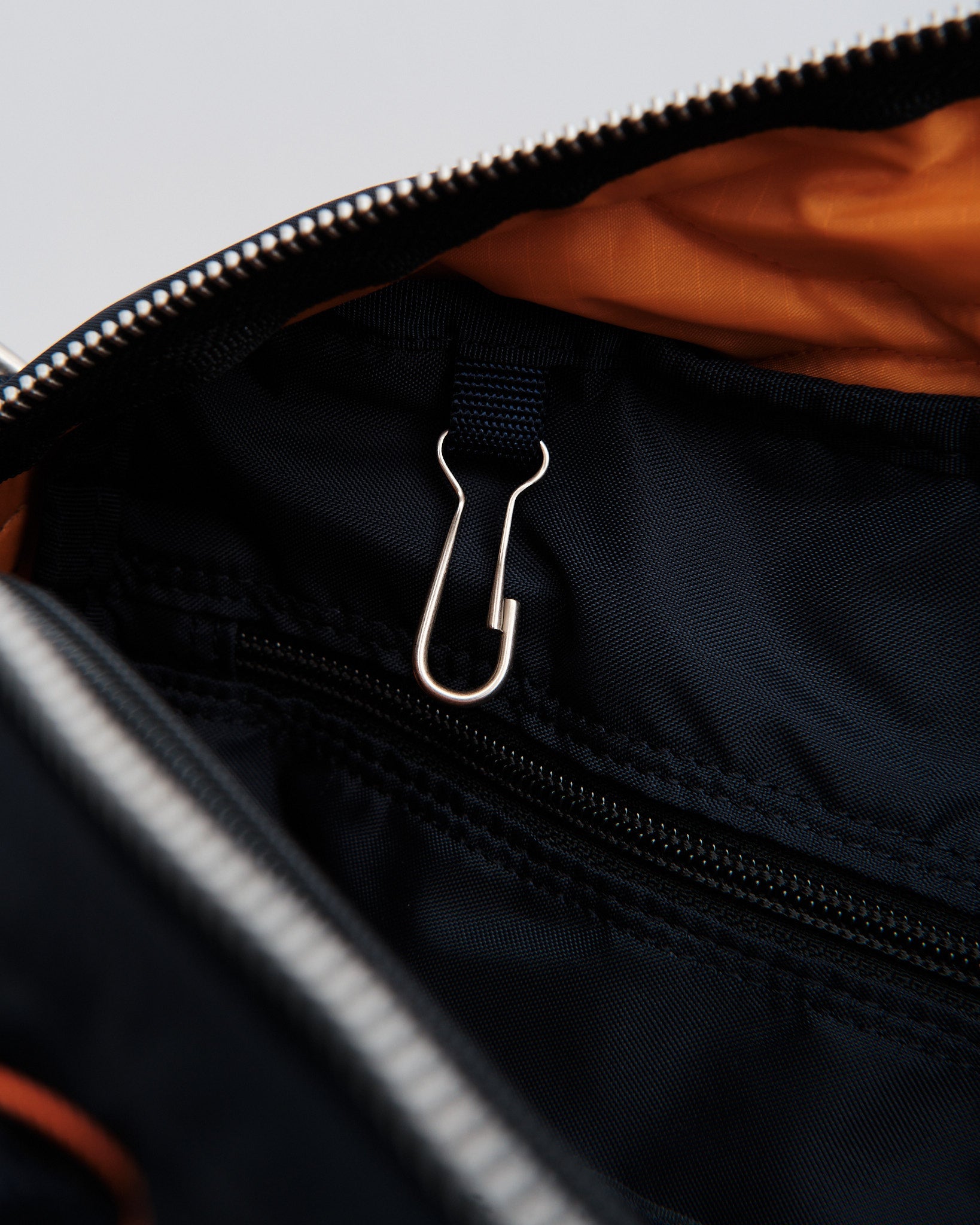 Realizzata in tessuto di grado industriale tessuto con filo forte di nylon 210 denari 6, originariamente usato per barche di gomma, la borsa è eccezionalmente durevole. L'interno vanta una fodera color arancione di emergenza, ispirata alle fodere delle giacche militari, e presenta nylon trapuntato antistrappo per una maggiore resilienza.
