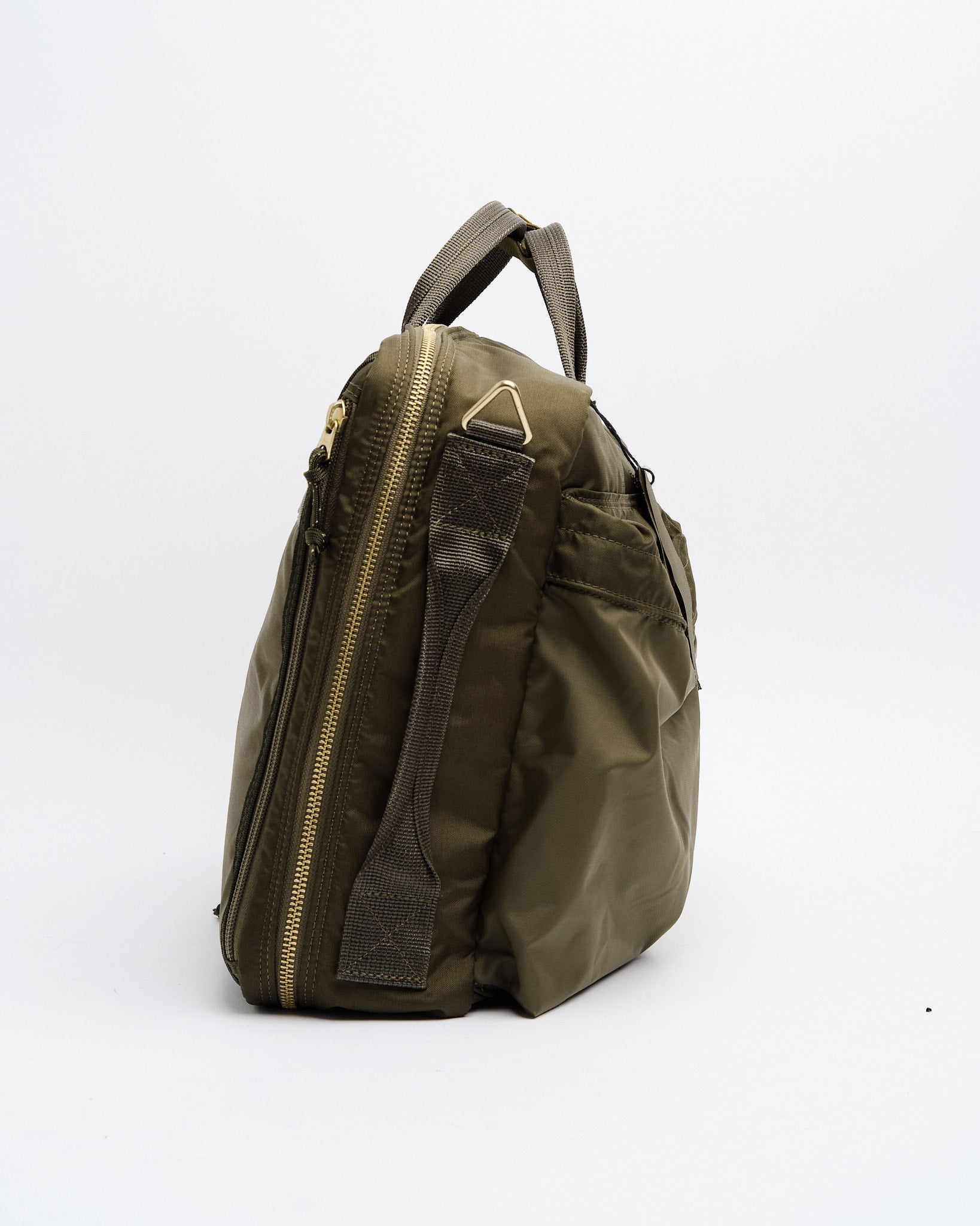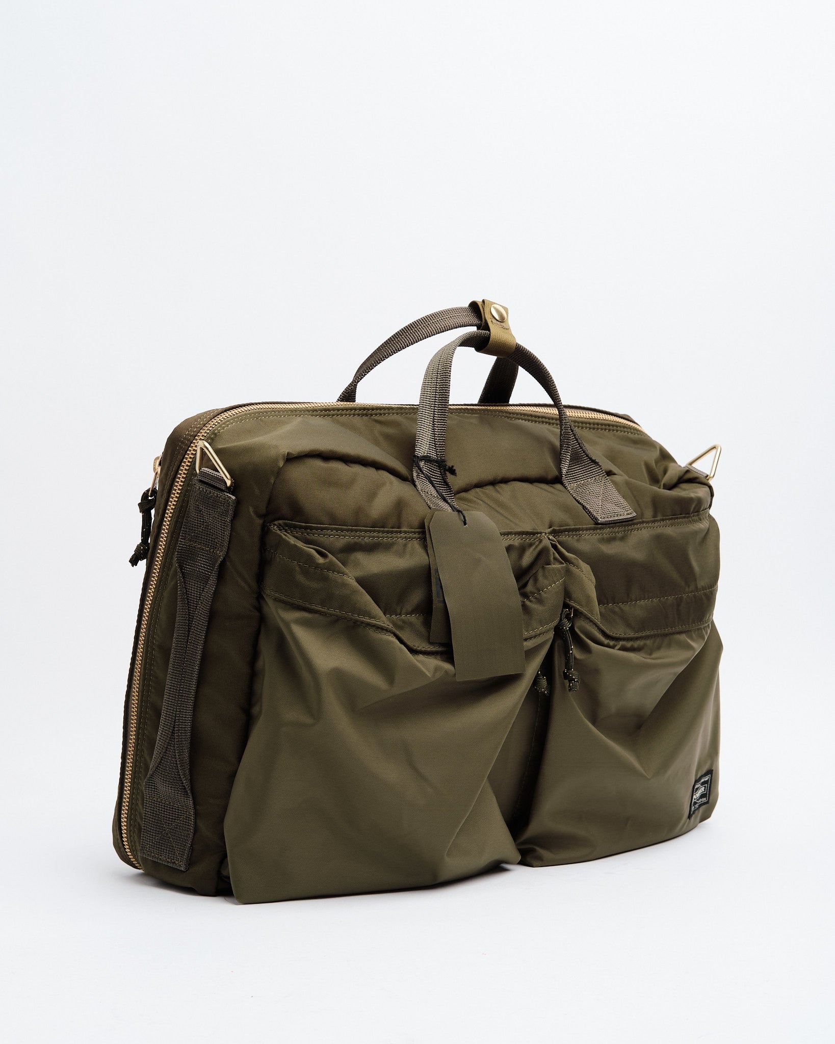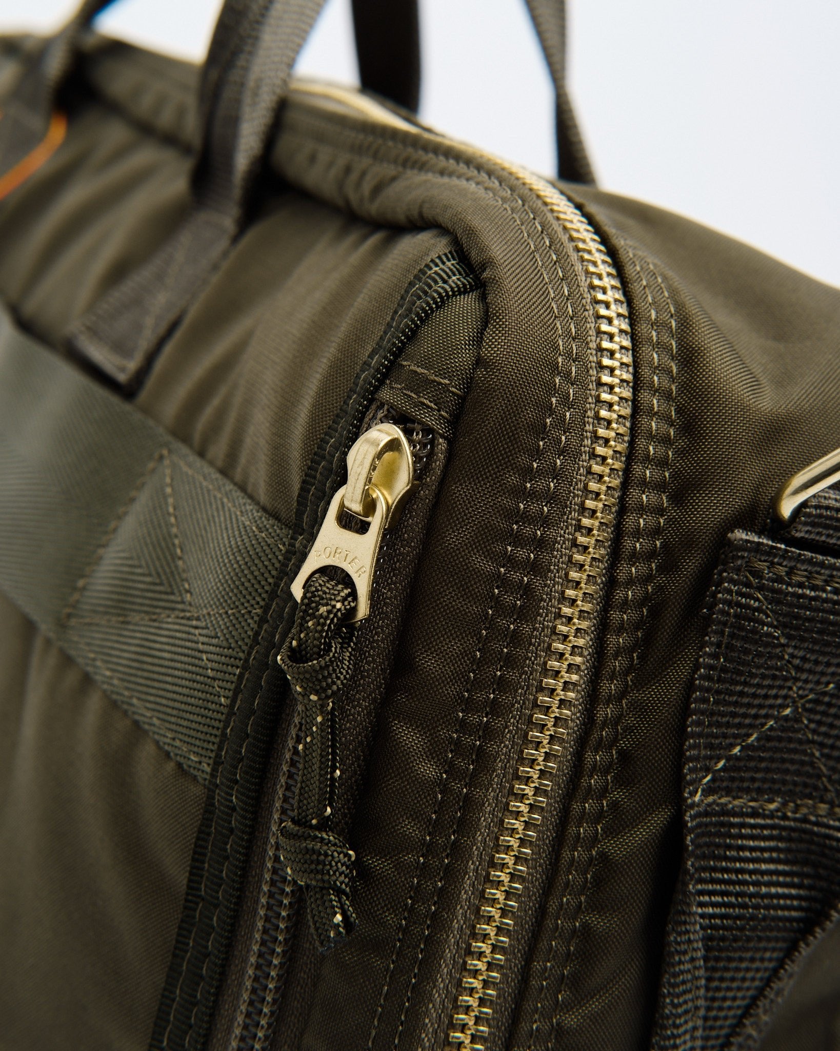 La PORTER BY YOSHIDA Force 3-Way Briefcase fa parte della serie PORTER FORCE, ispirata all'estetica militare e alle differenze di colore accidentali trovate nei beni militari. Una caratteristica notevole di questo design è la variazione di colore sottile tra il tessuto della tasca frontale e il corpo principale della borsa, creando l'aspetto di utilizzo di lotti di tessuto differenti. Questa serie celebra gli schemi di colore irregolari trovati nell'abbigliamento e negli accessori militari.