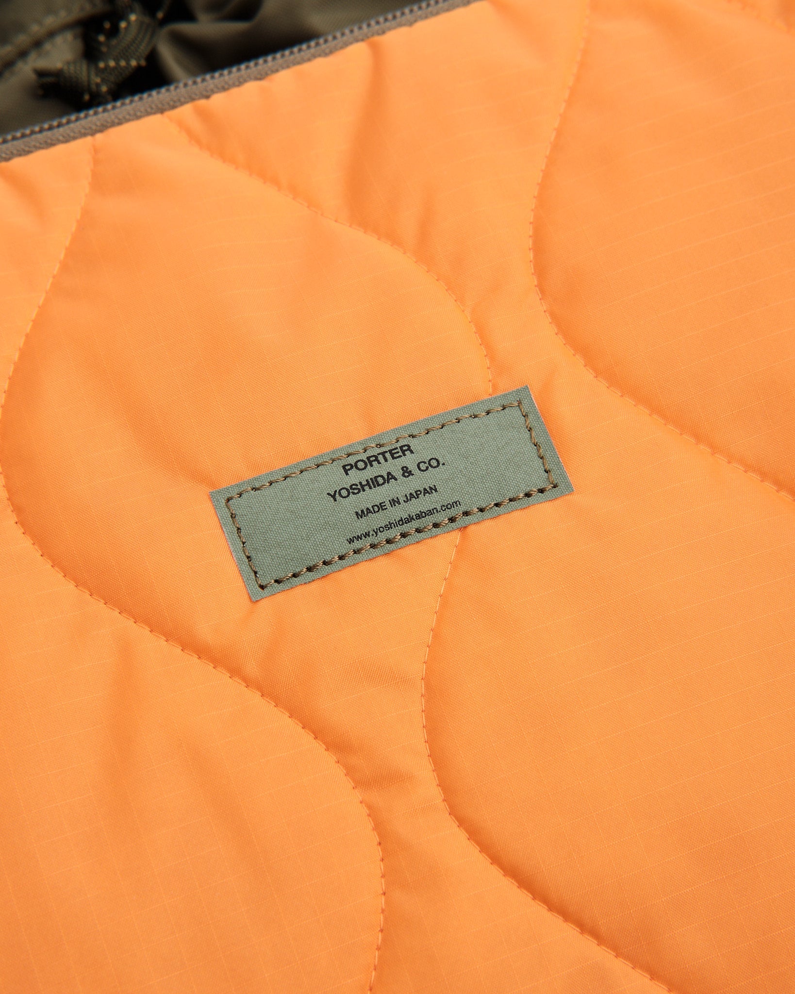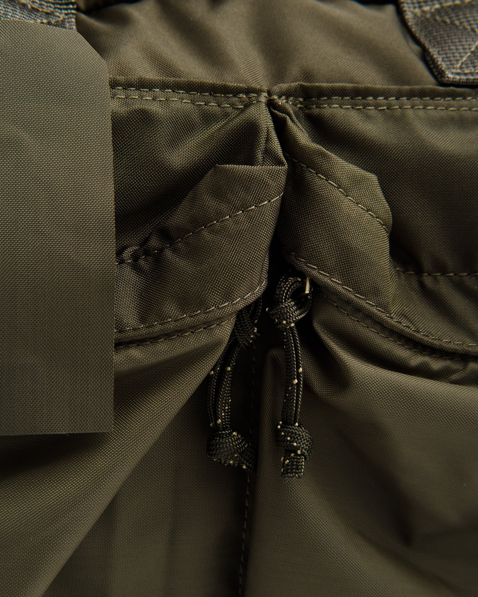 Realizzata in tessuto di grado industriale intessuto con filo di nylon forte da 210 denari 6, originariamente utilizzato per barche in gomma, la borsa è eccezionalmente resistente. L'interno vanta una fodera color arancione di emergenza, ispirata alle fodere delle giacche militari, e presenta nylon trapuntato antistrappo per una maggiore resilienza.