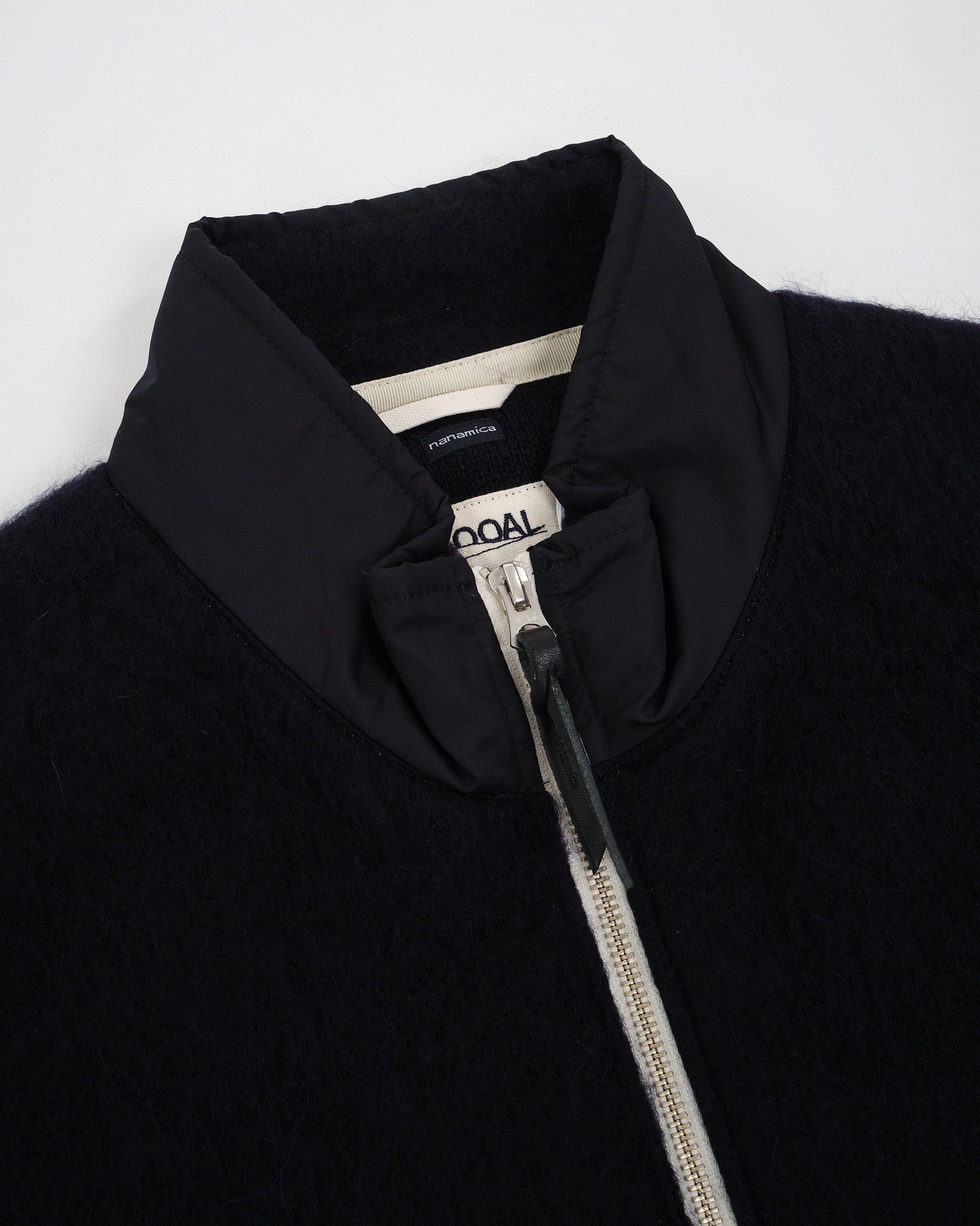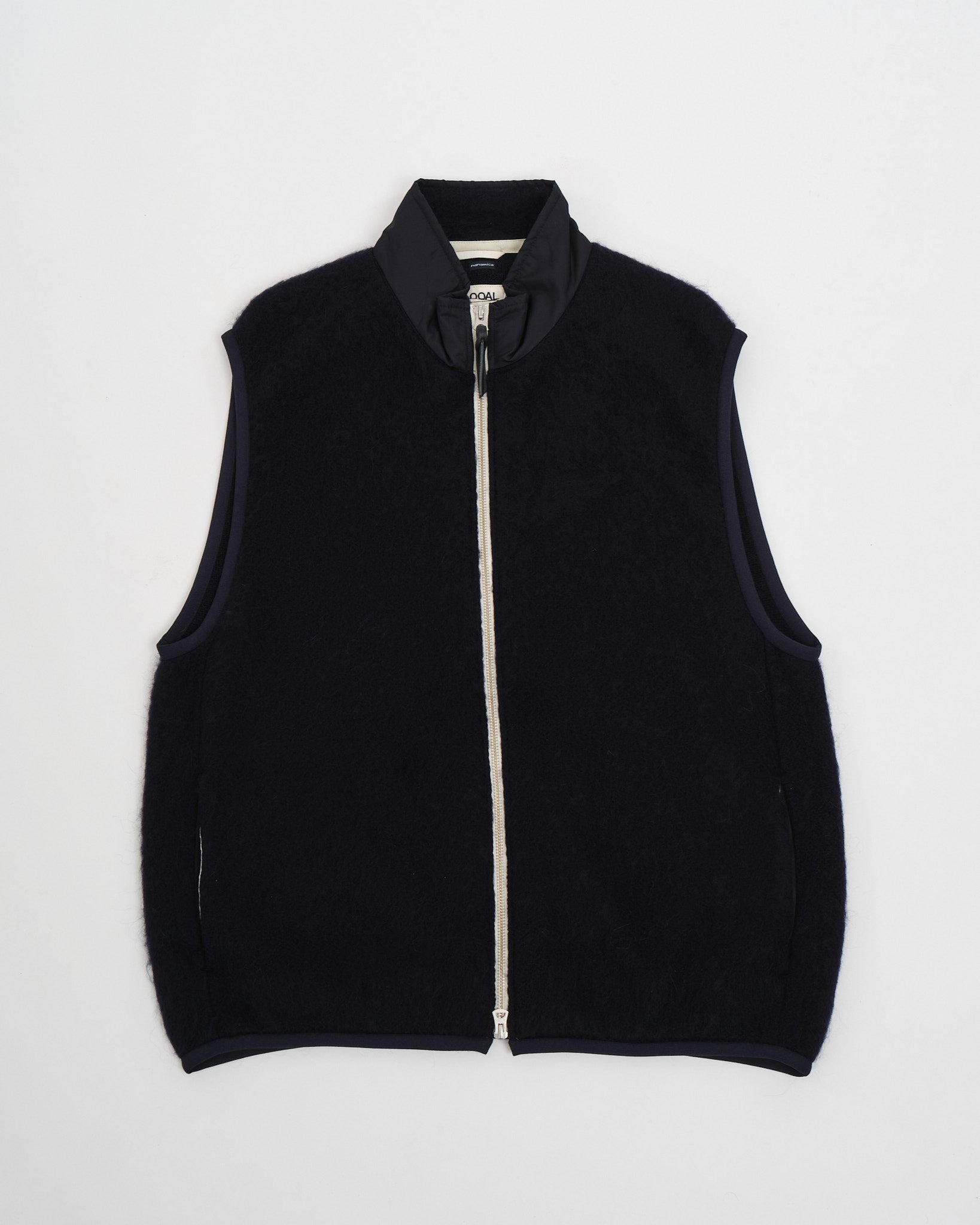 Immergiti nel calore e nel comfort senza pari del Gilet in Mohair con Zip Nanamica in Blu Navy. Questo pezzo è realizzato utilizzando filati derivati dal mohair grezzo, proveniente da fattorie rigorosamente dedicate a pratiche di produzione sostenibili, e meticolosamente lavorato in Giappone. La finitura della fibra sollevata dota il gilet di un volume che ricorda il pile da esterno. Ispirandosi al classico gilet in pile degli anni '90, questo gilet subisce una trasformazione moderna per abbracciare un design minimalista. Con la sua silhouette oversize, promette una vestibilità rilassata e libera per ogni occasione.