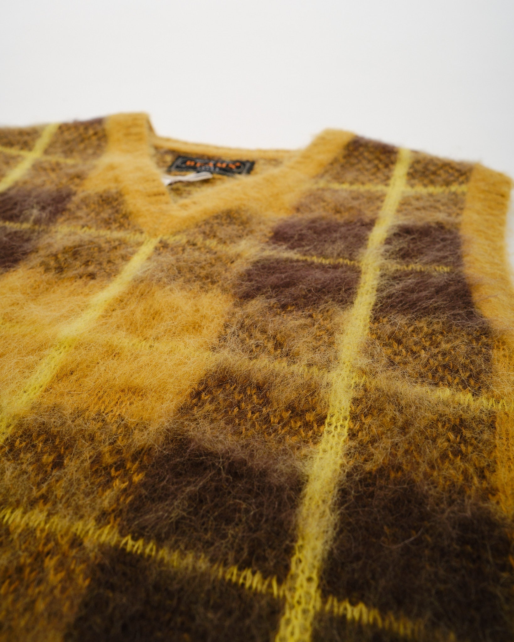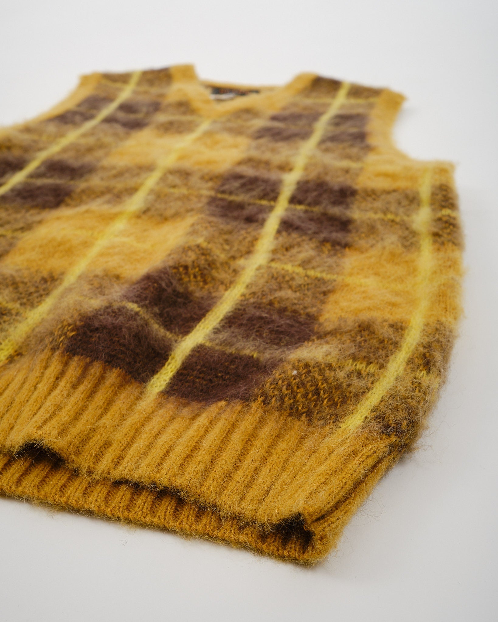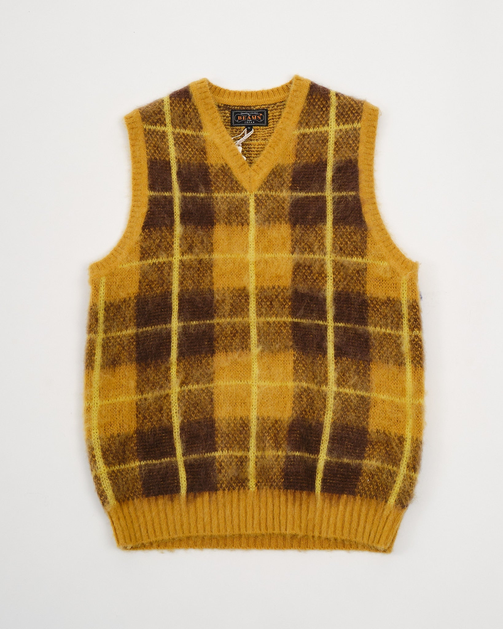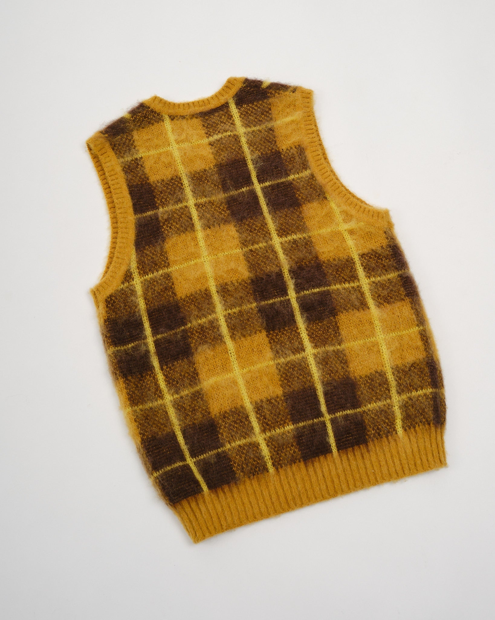 Vivi l'atmosfera retrò con il Gilet a Quadri in Mohair Beams+ in color Senape. Questo gilet ispirato ai maglioni degli anni '60 presenta un ampio disegno a plaid che fonde perfettamente eleganza senza tempo e stile contemporaneo. La miscela di lana mohair assicura una texture morbida e soffice mentre il collo a V e l'orlo a costine ne aumentano il comfort e la facilità di indossabilità. Non è il tuo modello a rombi ma il disegno a quadri e la miscela armoniosa di colori offrono un fascino simile, rendendolo perfetto per essere sovrapposto senza sentirsi troppo caldo.