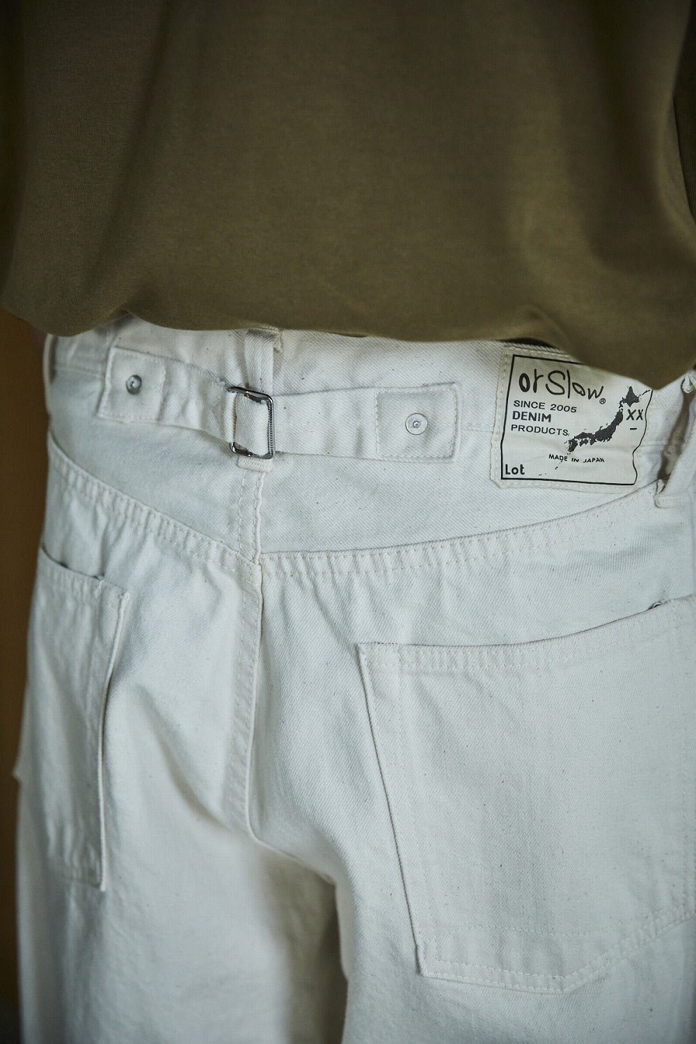 Realizzato in Giappone con il denim di cotone originale di orSlow in un tono ecru naturale non tinto, il tessuto possiede texture e carattere senza l'uso di sostanze chimiche aggressive. Il trattamento ad un lavaggio gli conferisce un tocco morbido e vissuto fin dal primo giorno. I dettagli ereditati includono una cintura con regolazione posteriore (senza ago), bottone in metallo inciso, rivetti nascosti sul retro, e una tasca per monete con orlo a risvolto—ognuno un segno di autenticità discreta.