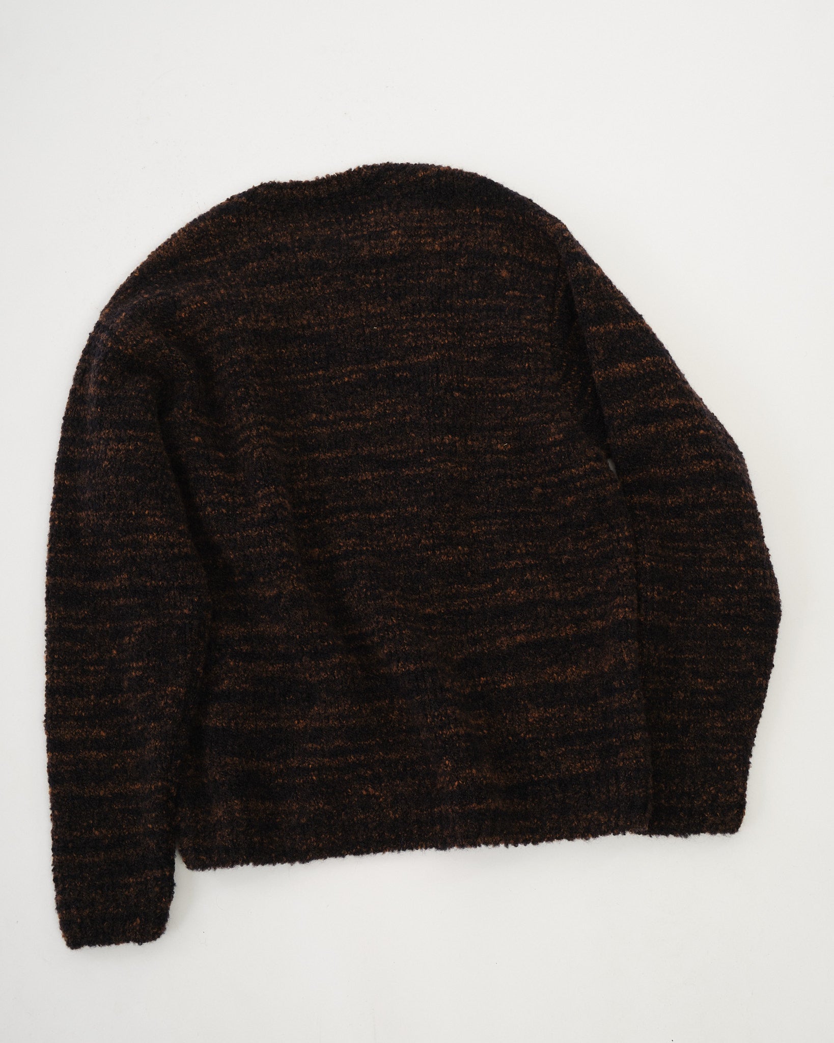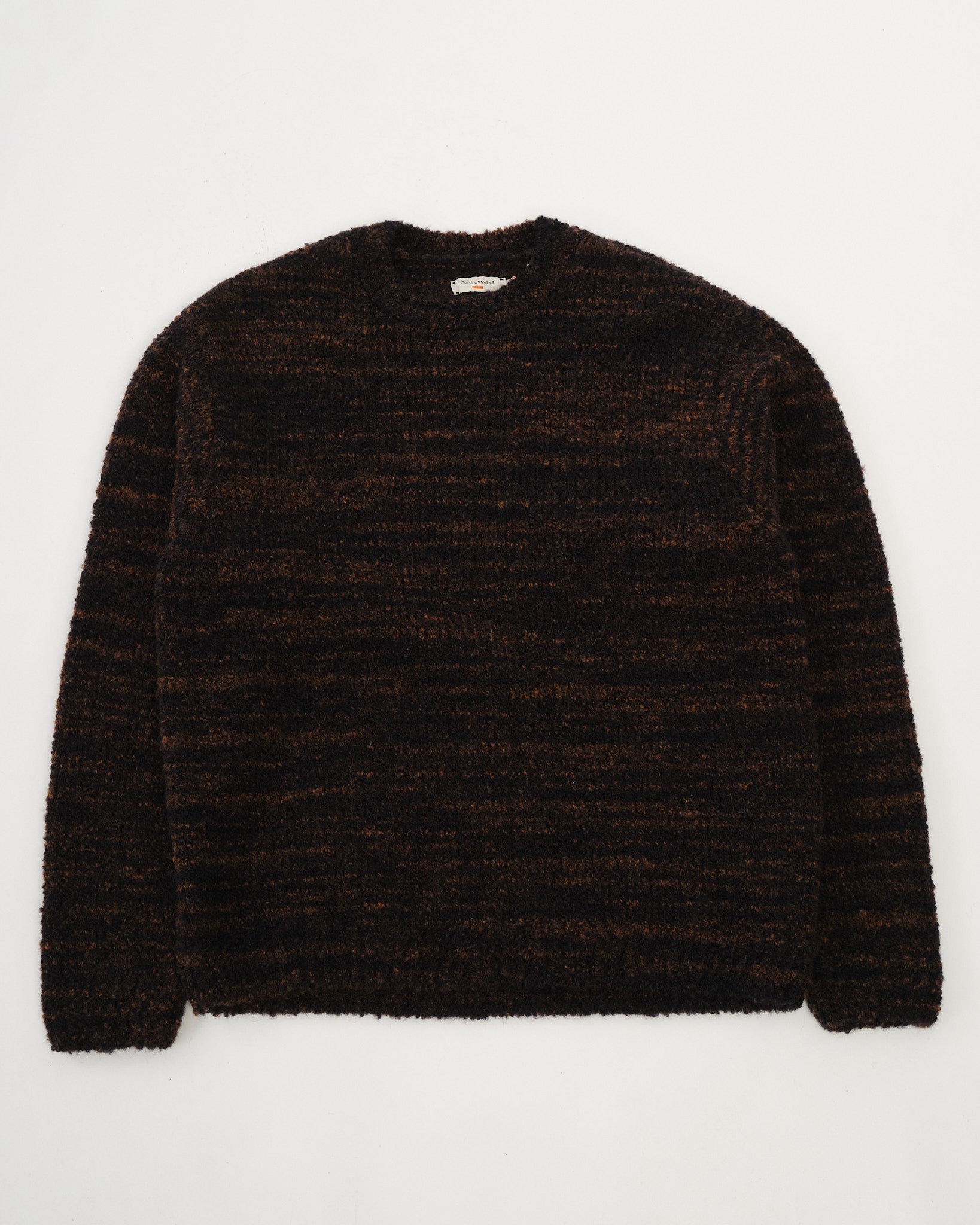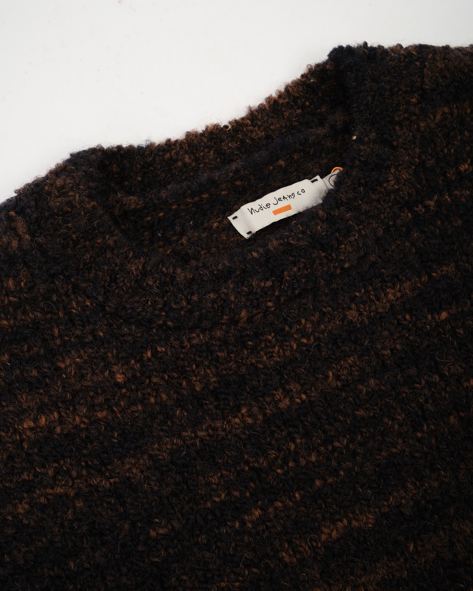 Il MAGLIONE BOUCLE GURRA DI NUDIE JEANS CO. NAVY/ARANCIONE è un maglione leggero con collo a giro con una texture unica, maglia lanosa. Realizzato utilizzando filato irregolare e slub, mescola blu navy intenso con arancione ruggine, creando un effetto bouclé riccamente maculato che aggiunge profondità e carattere al tessuto.