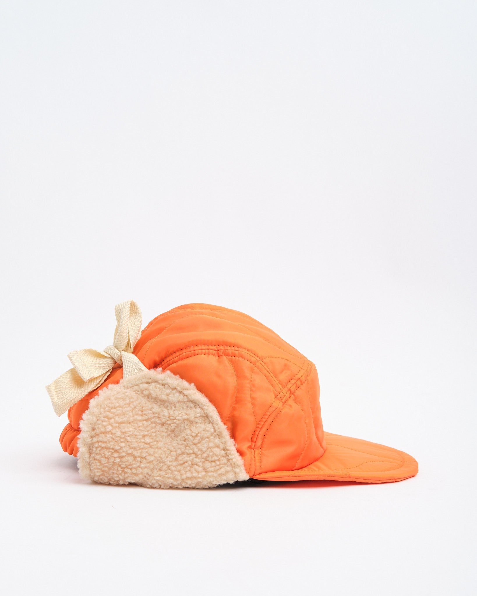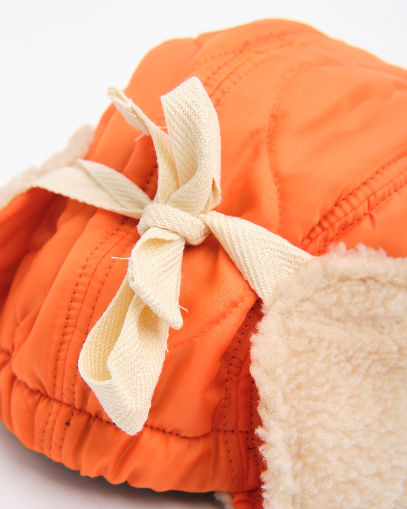 Il Cappello a Mezzaluna Con Orecchie in Arancione di Found Feather fonde la funzionalità militare con uno stile audace. Realizzato in Giappone in nylon trapuntato con un leggero riempimento in poliestere, presenta pannelli per le orecchie in morbido pile boa e un morbido bordo in schiuma EVA per calore e comfort senza peso. Il design a quattro pannelli fornisce struttura, mentre l'elastico completo sul retro e i lacci piatti in cotone garantiscono una vestibilità sicura e adattabile. Rifinito con dettagli timbrati a mano, fodera in twill di cotone e un'etichetta per la cura codificata QR, questo cappello è al tempo stesso utilitario ed espressivo.