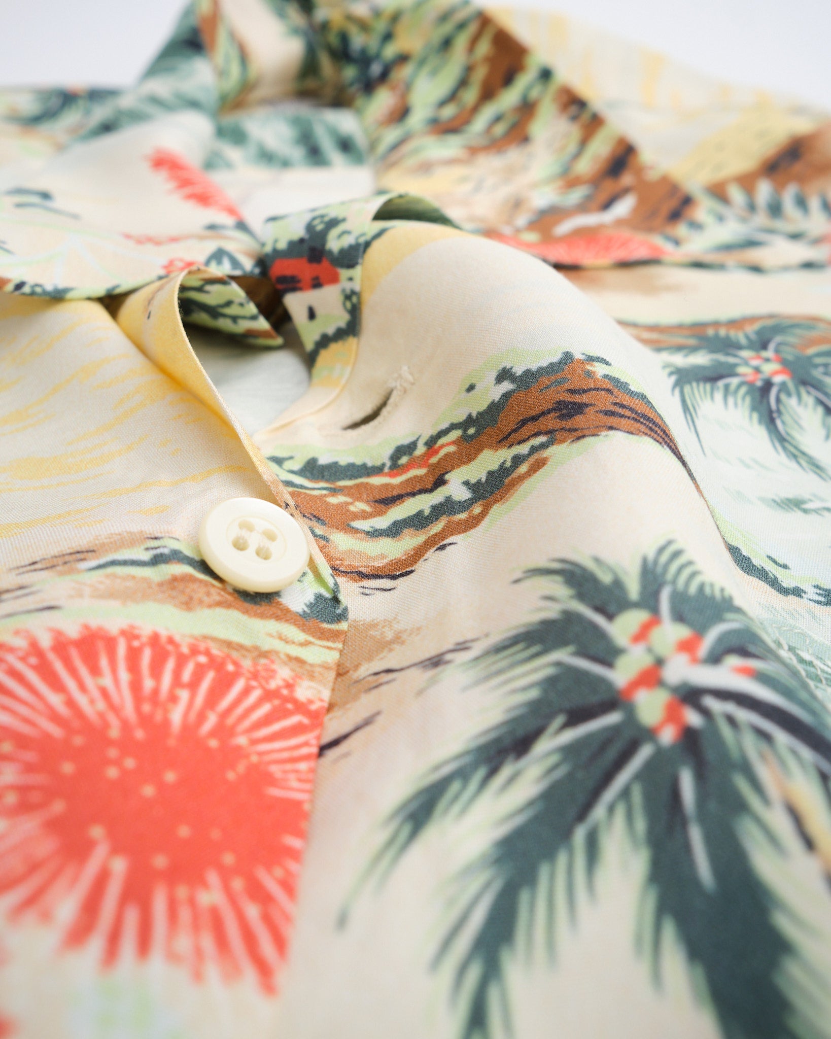 La stampa hawaiana astratta su tutto il tessuto è ispirata ai classici paesaggi insulari, reinterpretati con un tocco artistico. La vestibilità rilassata e oversize permette libertà di movimento e un aspetto disinvolto, rendendola un must-have per qualsiasi guardaroba. Il colletto da campo aggiunge un fascino ispirato al vintage, mentre l'orlo curvo migliora la silhouette.