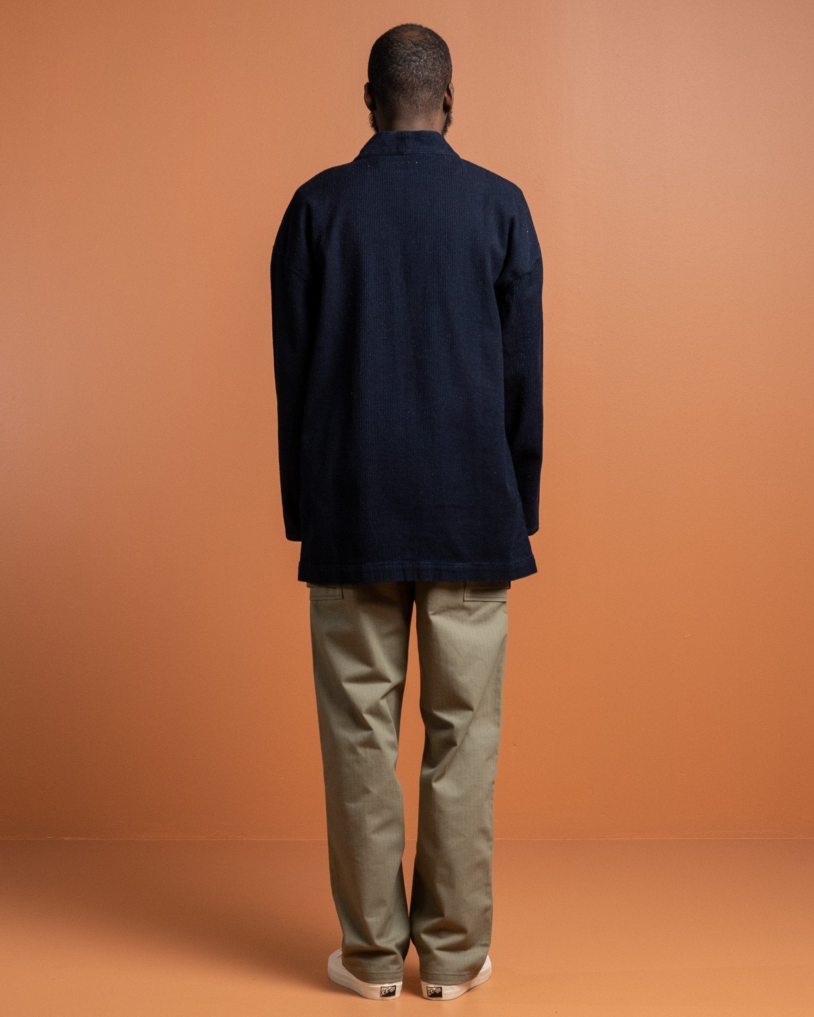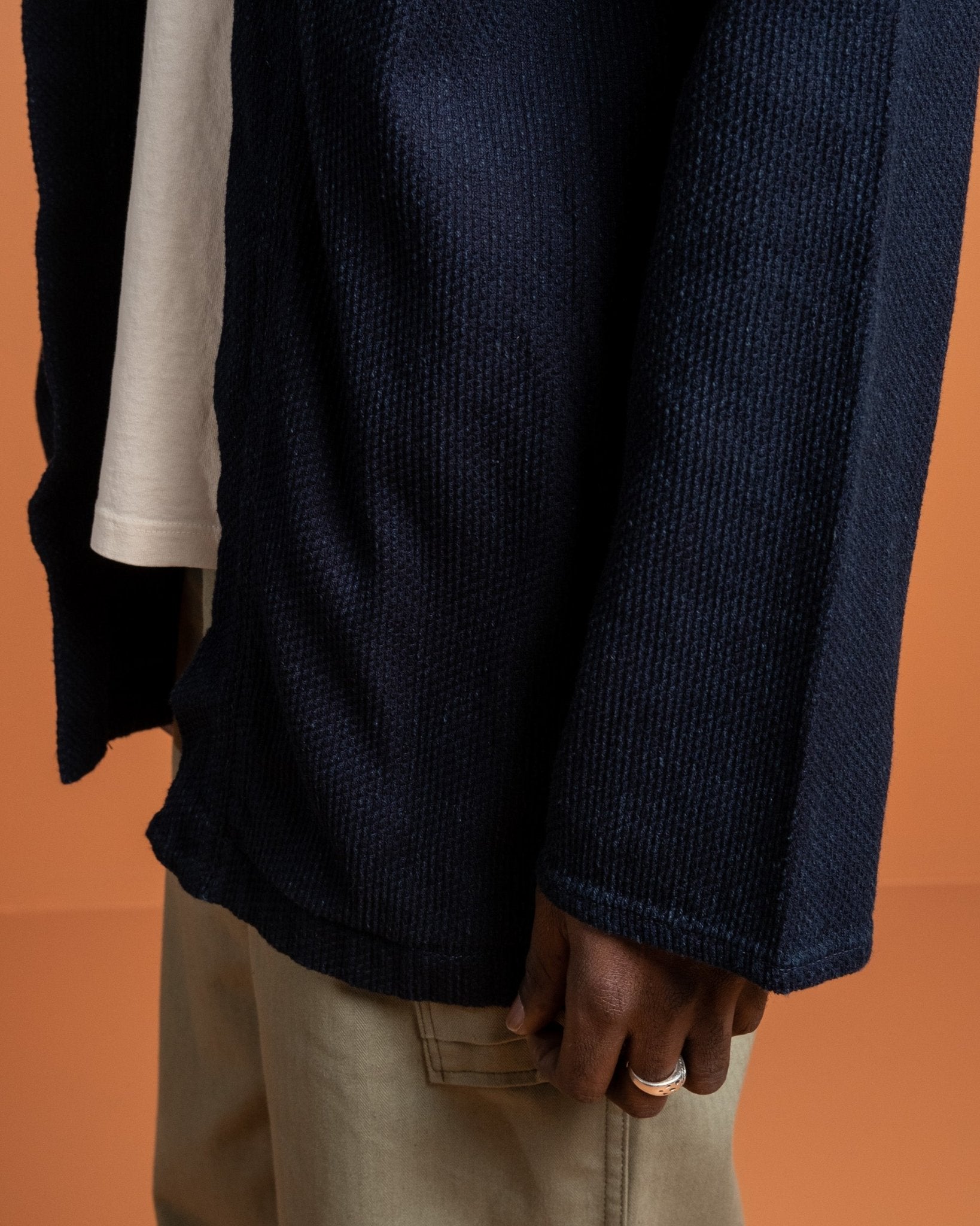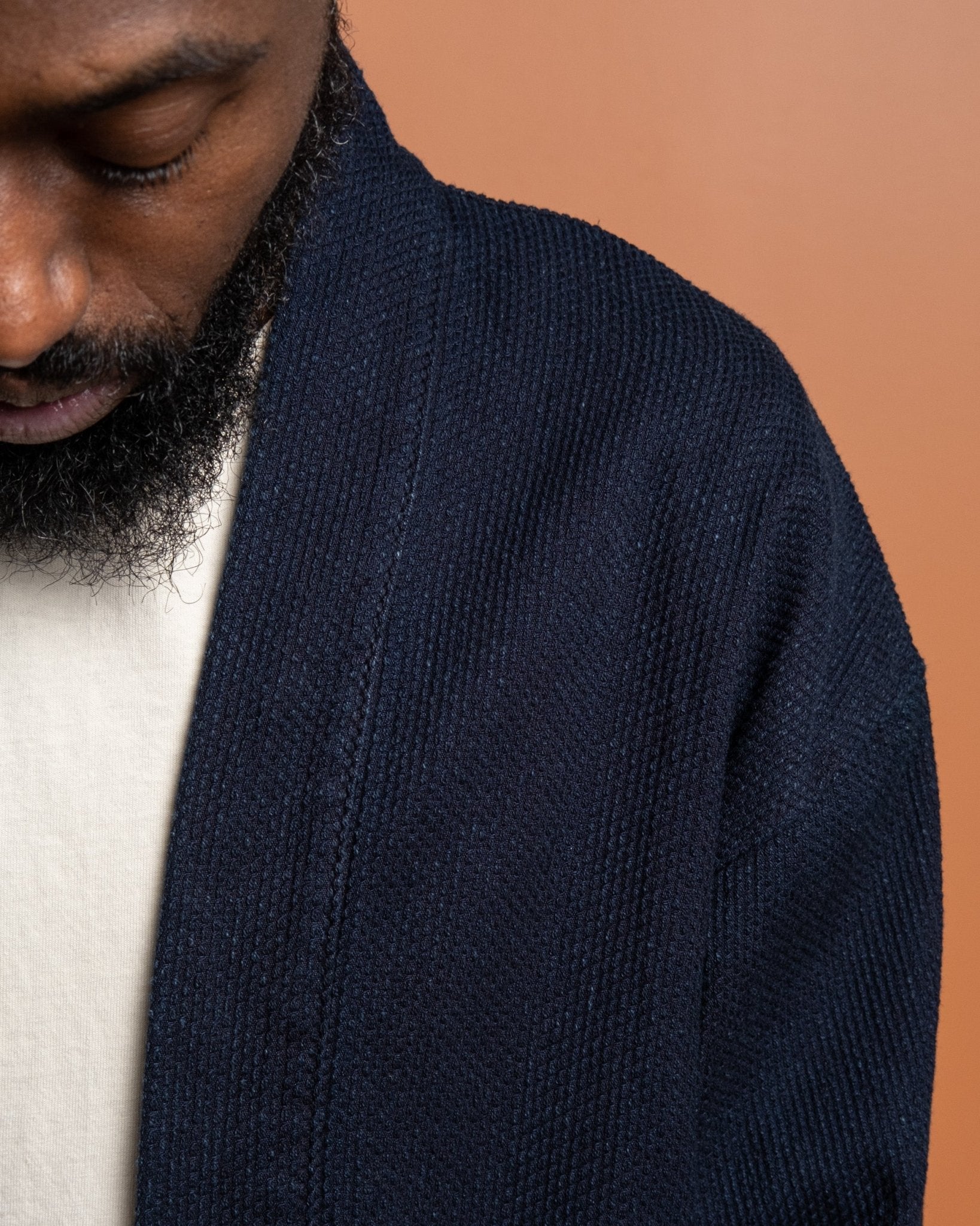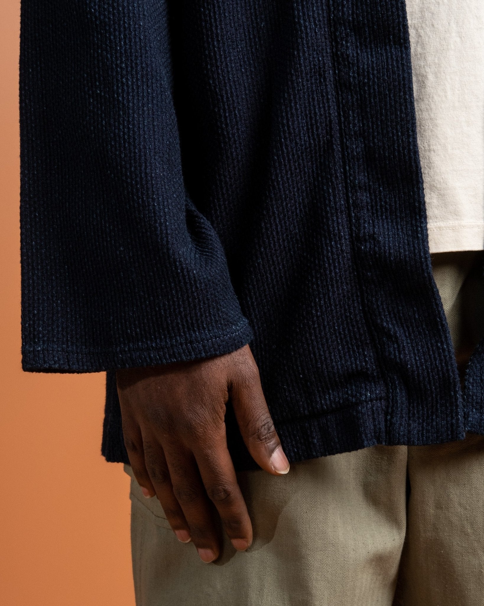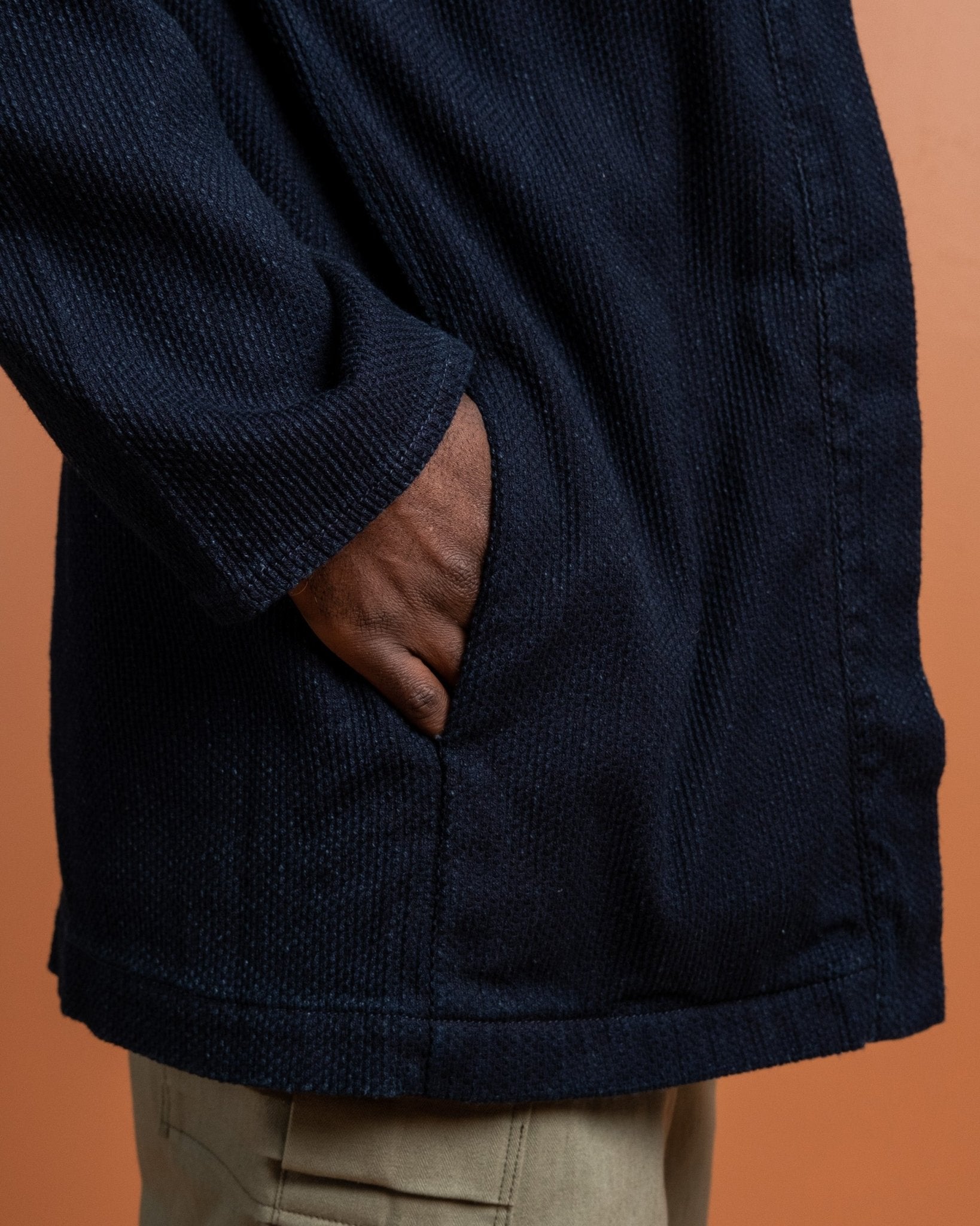 J692951 Sashiko Haori Indaco da Japan Blue Jeans. Giacca Haori dal taglio rilassato. Realizzata in tessuto giapponese Sashiko da 11 oz in 100% cotone. Due tasche laterali nascoste e due tasche interne. L'Haori è una giacca tradizionale giapponese indossata sopra un Kimono. Taglia unica (f). Prodotto in Giappone.