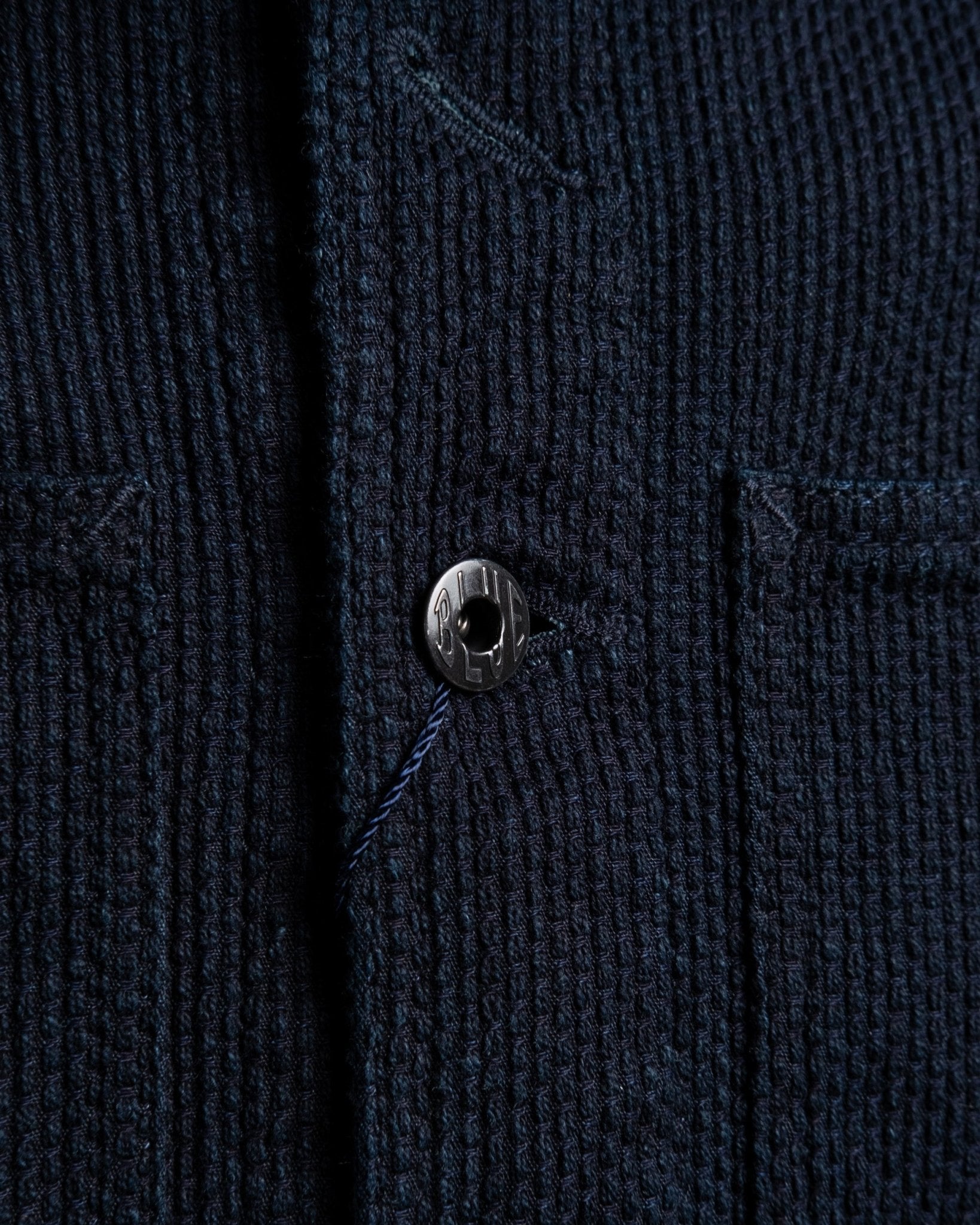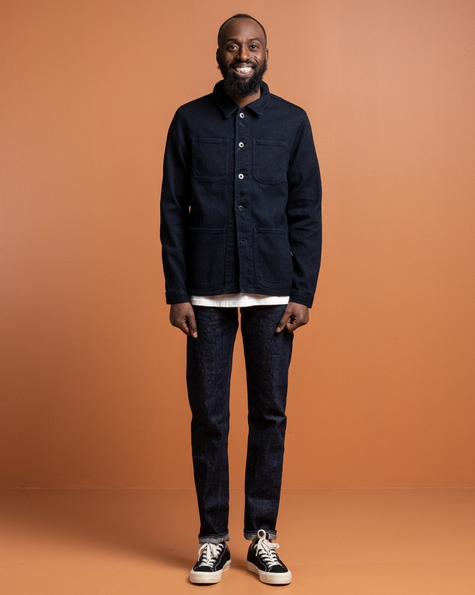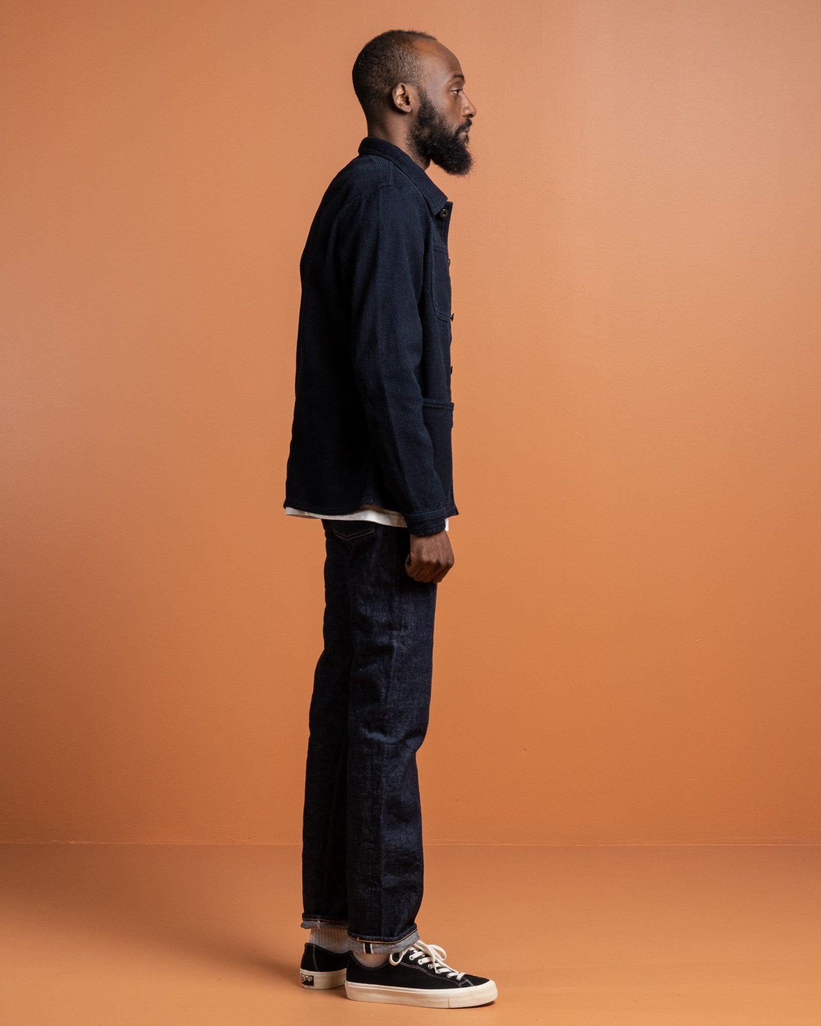 Sashiko Coverall Indigo da Japan Blue Jeans. Realizzato in tessuto Sashiko giapponese da 11 oz in 100% cotone. Due tasche sul petto, due tasche inferiori e chiusura con bottoni. Bottoni personalizzati, polsini e orlo regolabili. Prodotto in Giappone.