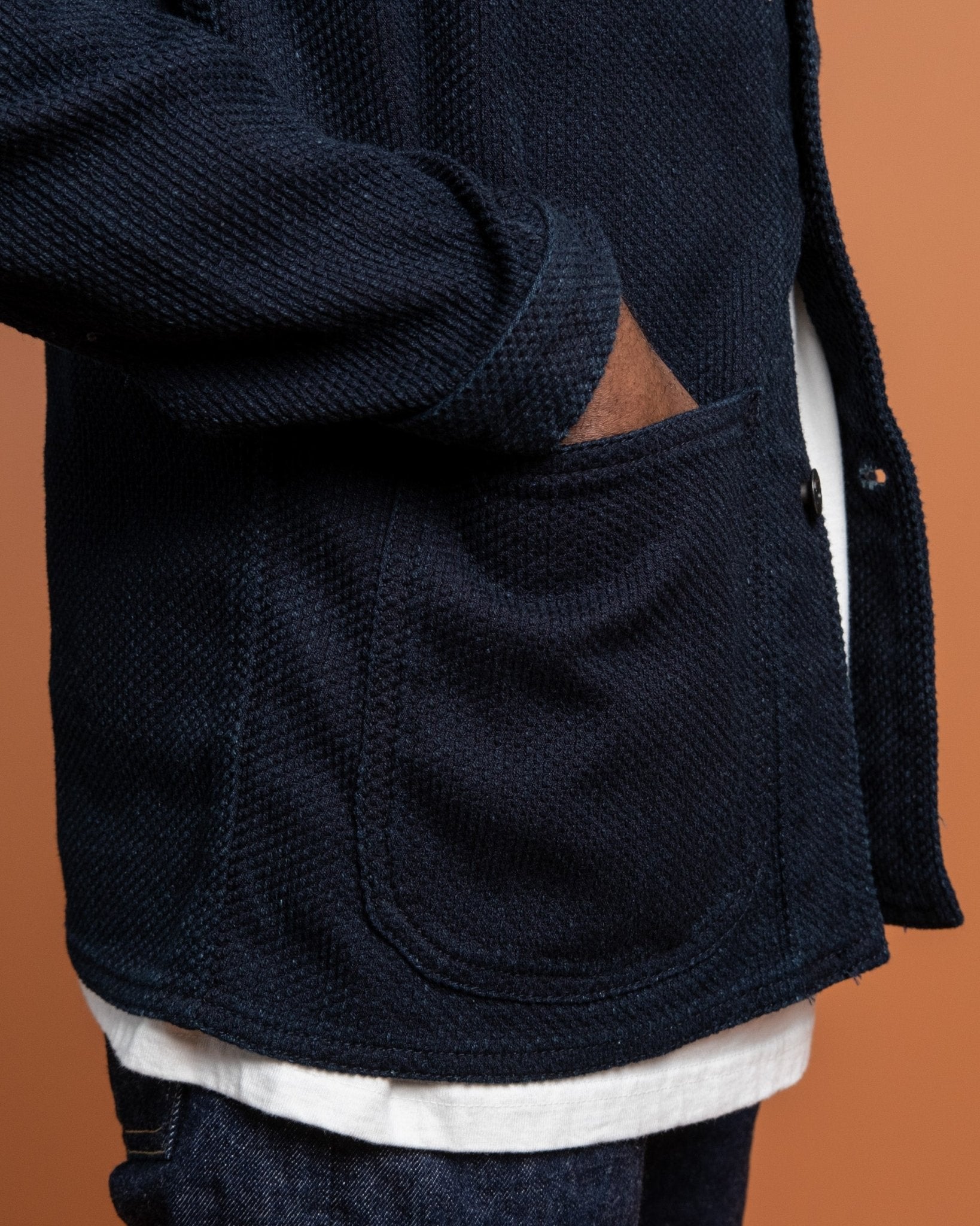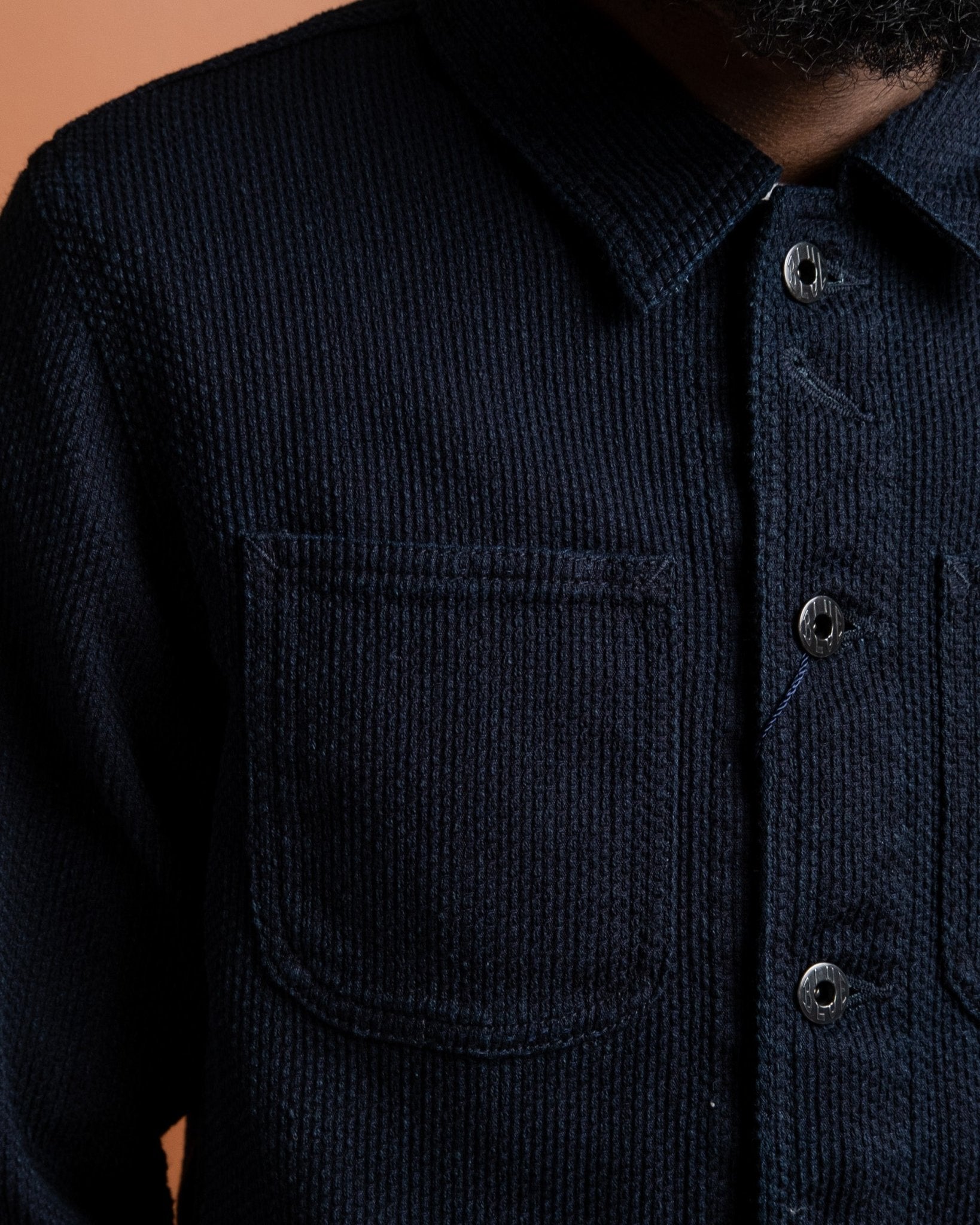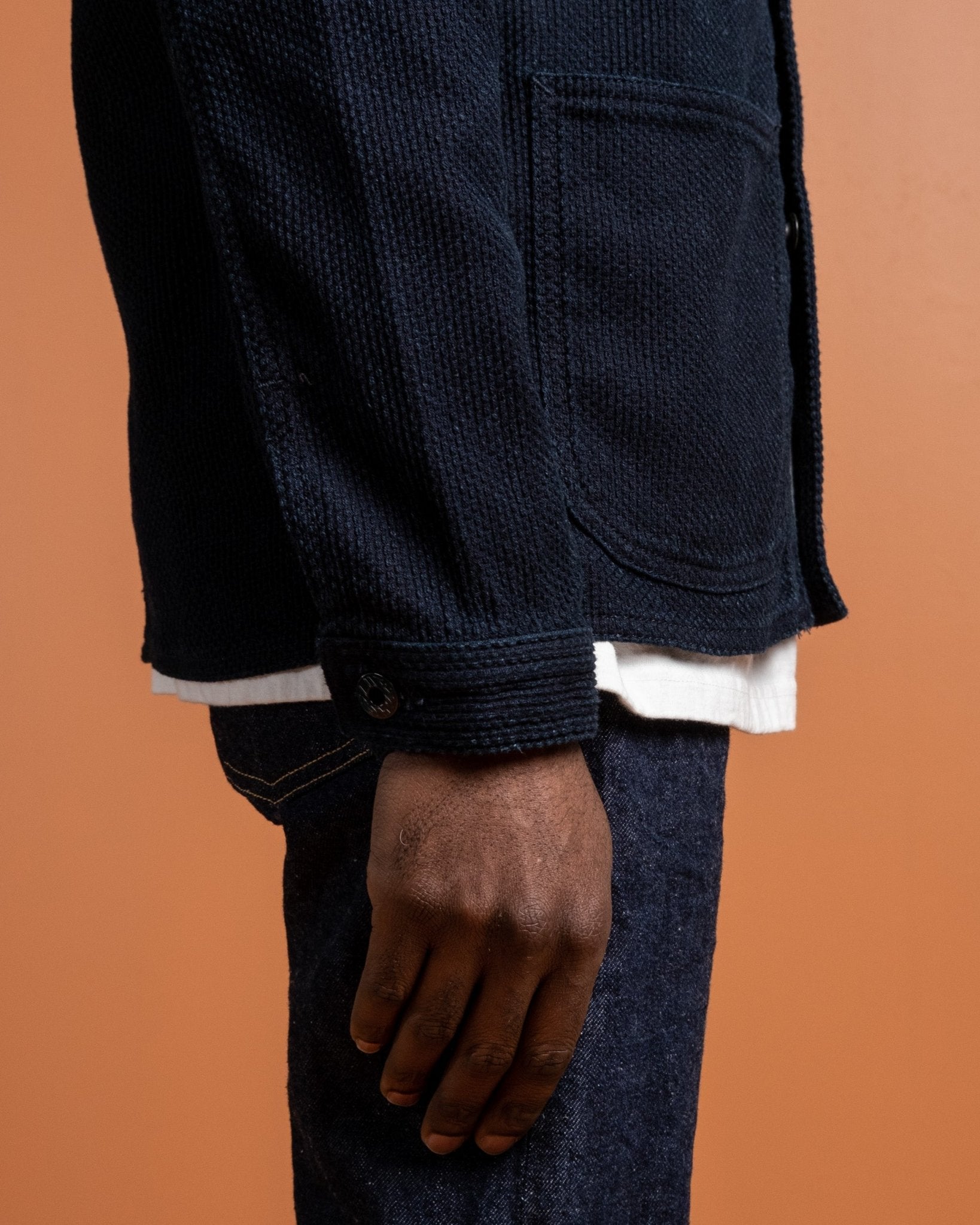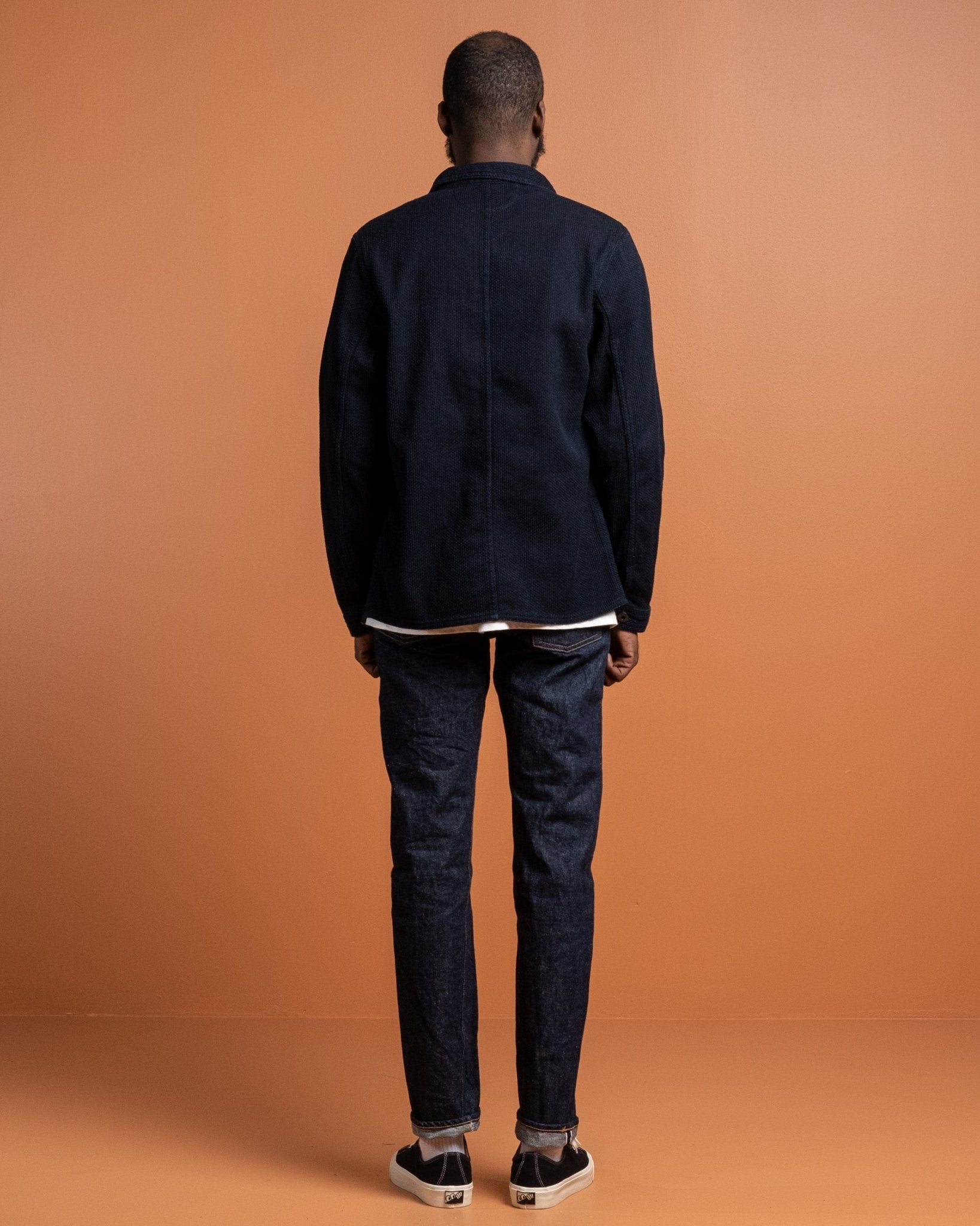 Sashiko Coverall Indigo da Japan Blue Jeans. Realizzato in tessuto Sashiko giapponese da 11 oz in 100% cotone. Due tasche sul petto, due tasche inferiori e chiusura con bottoni. Bottoni personalizzati, polsini e orlo regolabili. Prodotto in Giappone.