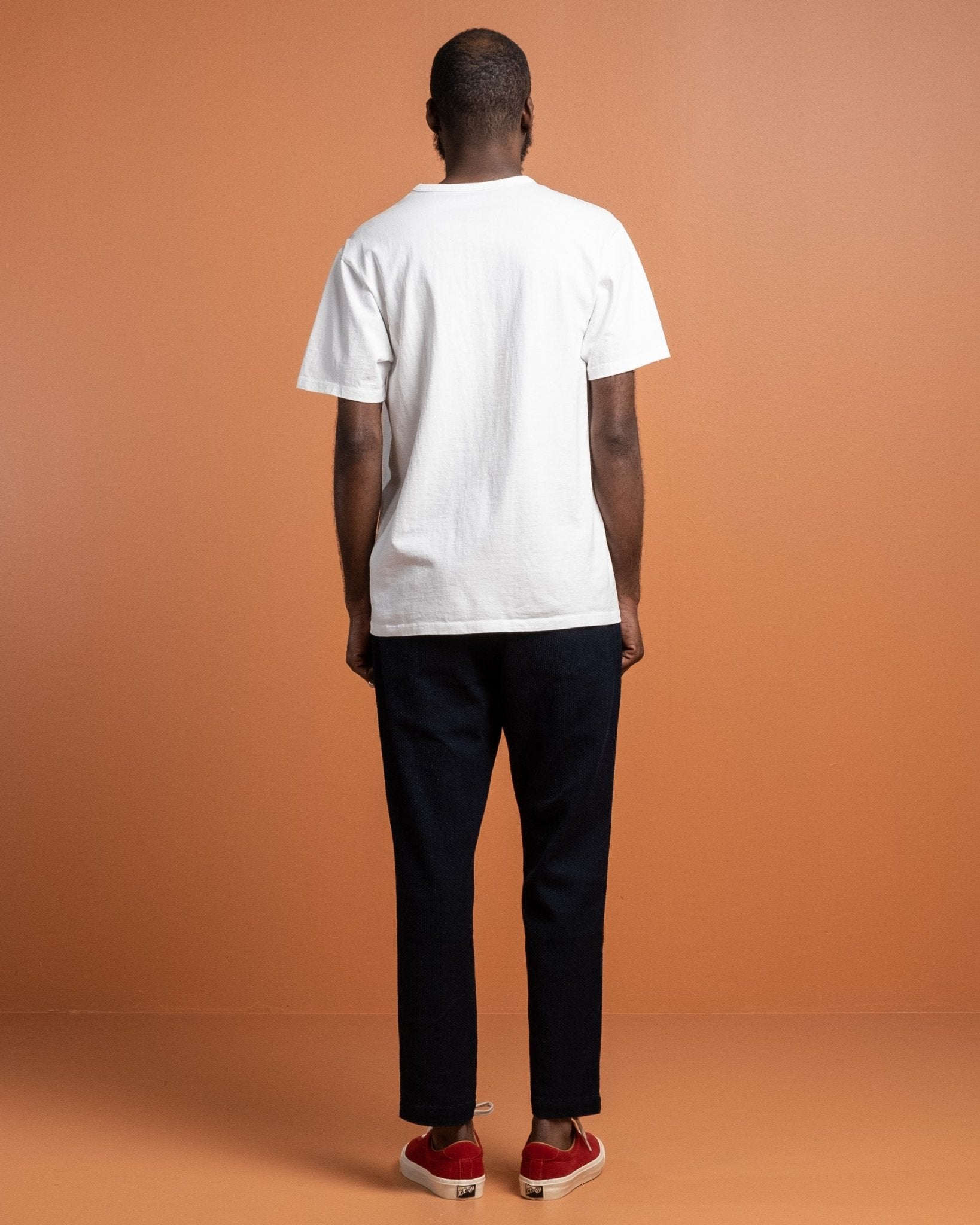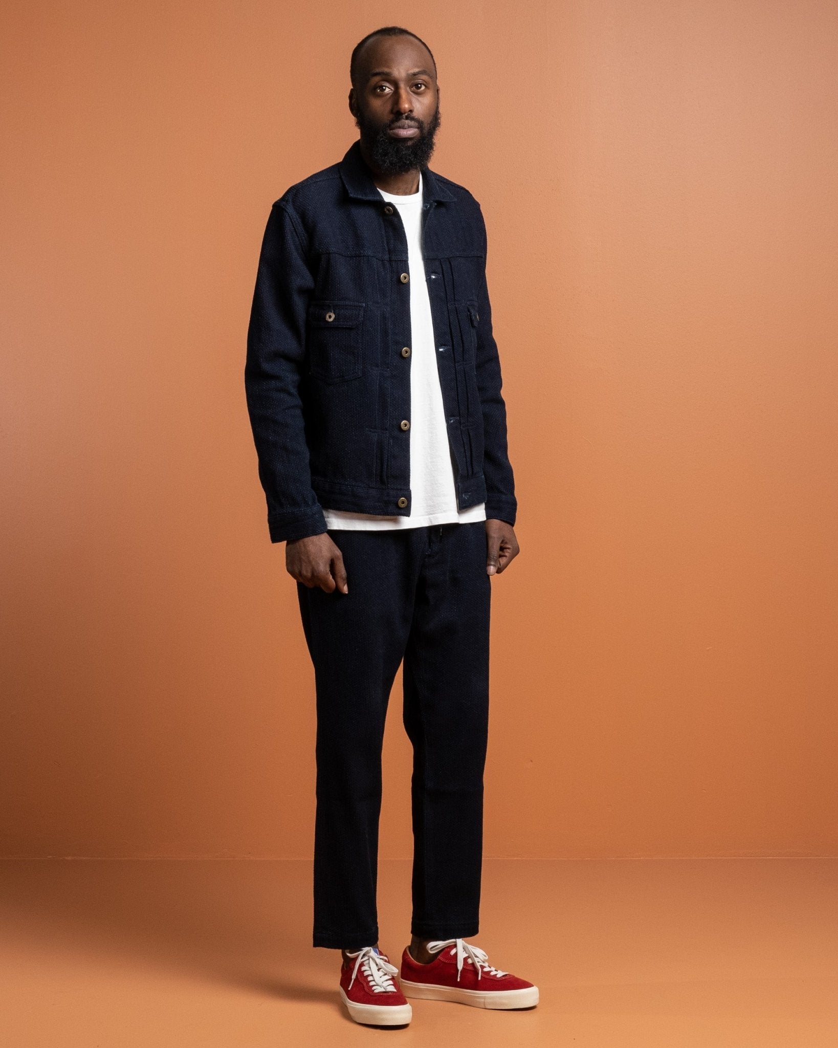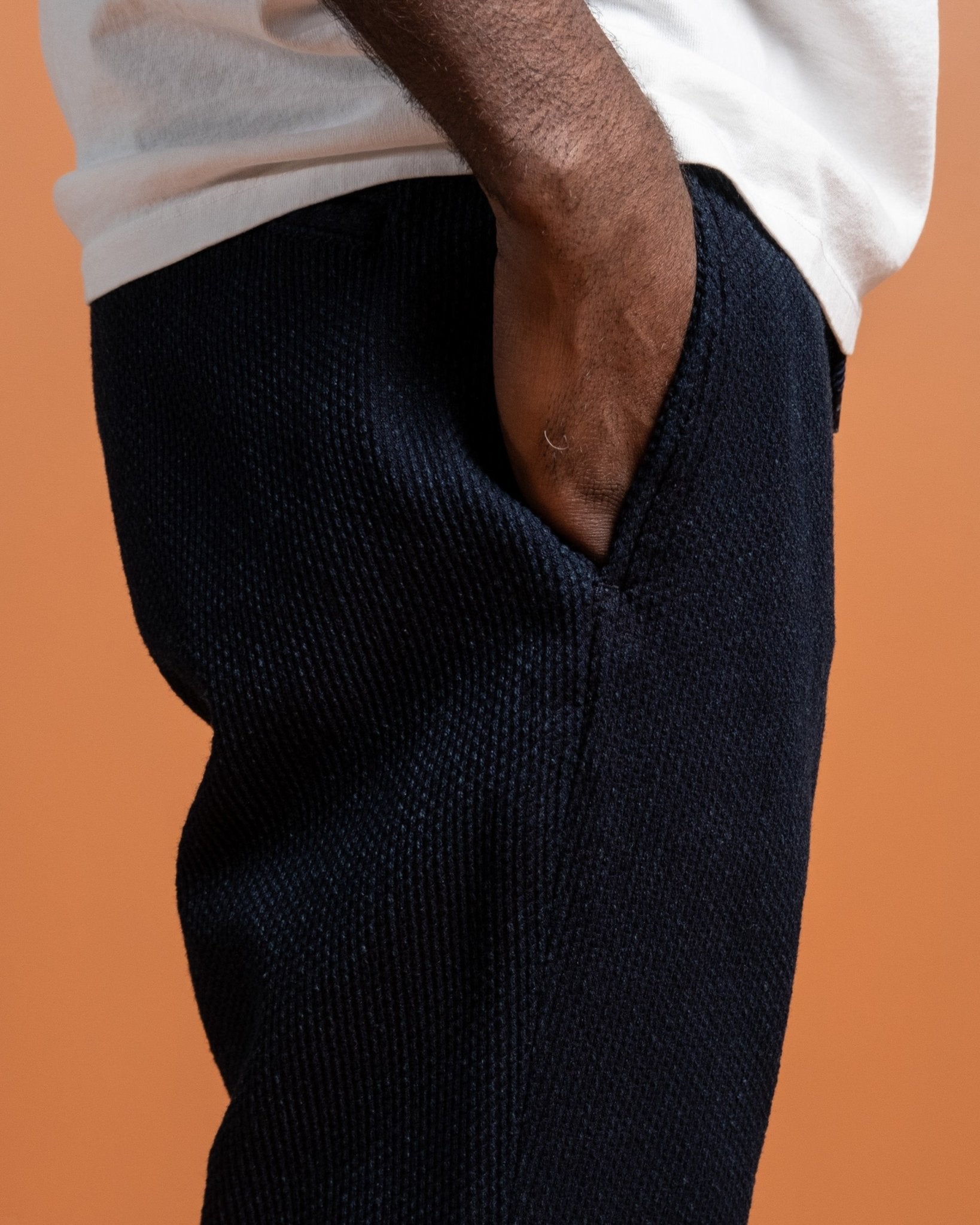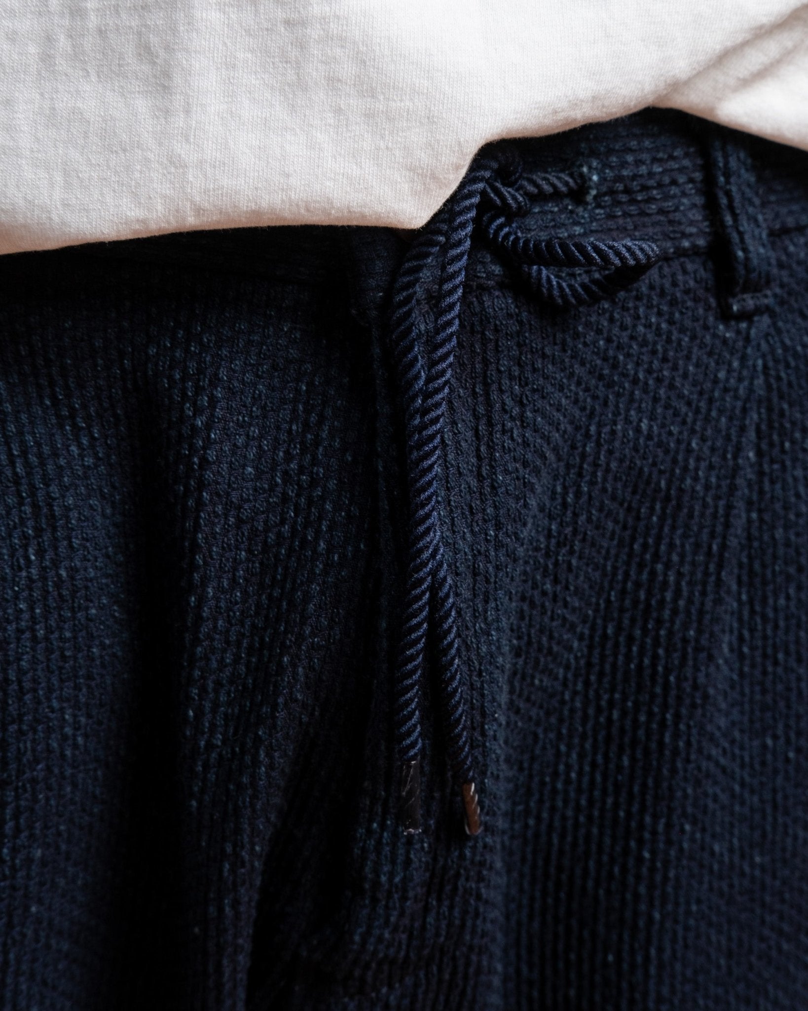JBPT10043A Pantaloni Tapered Facili Sashiko di Japan Blue Jeans. Pantaloni dal taglio rilassato realizzati in tessuto di cotone sashiko con chiusura a zip. Due tasche laterali, due tasche posteriori e vita regolabile con cordoncino, oltre a passanti per cintura aggiunti. Tessuto fantastico che diventerà ancora migliore una volta che inizia a sbiadire con l'uso. Prodotto in Giappone.