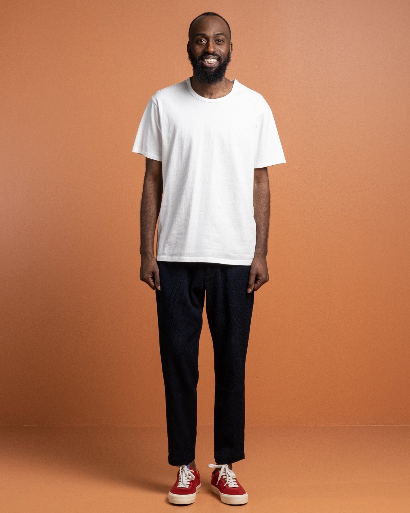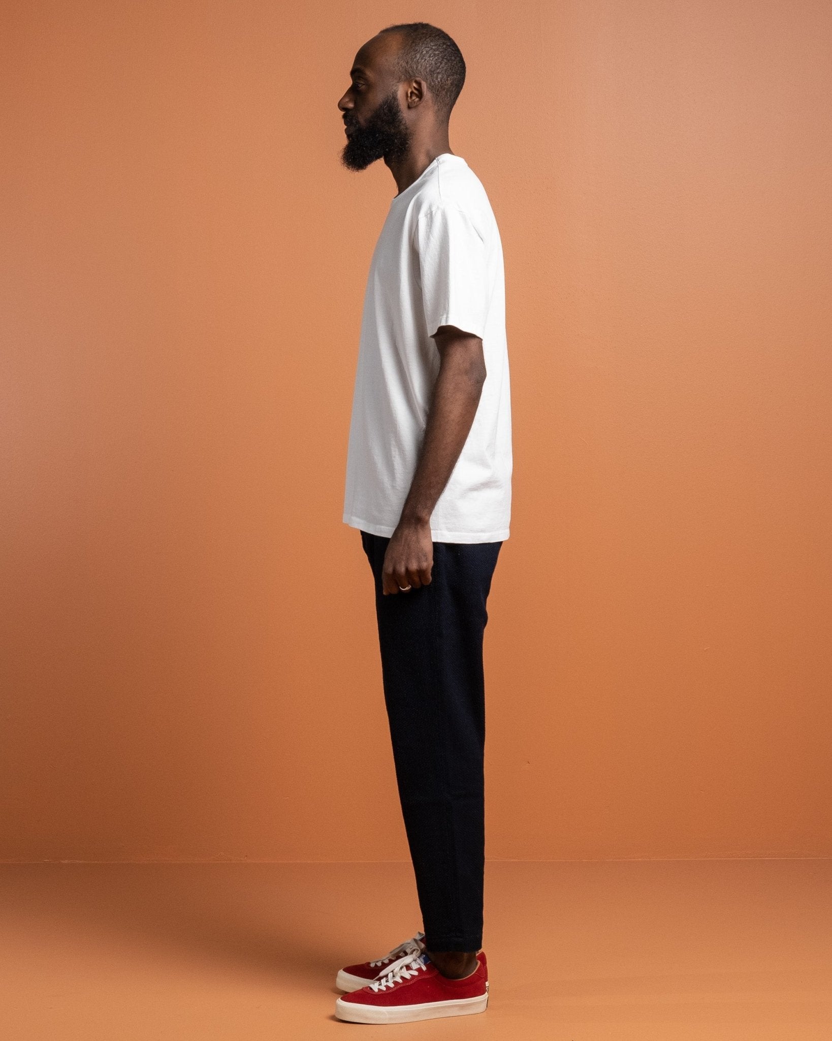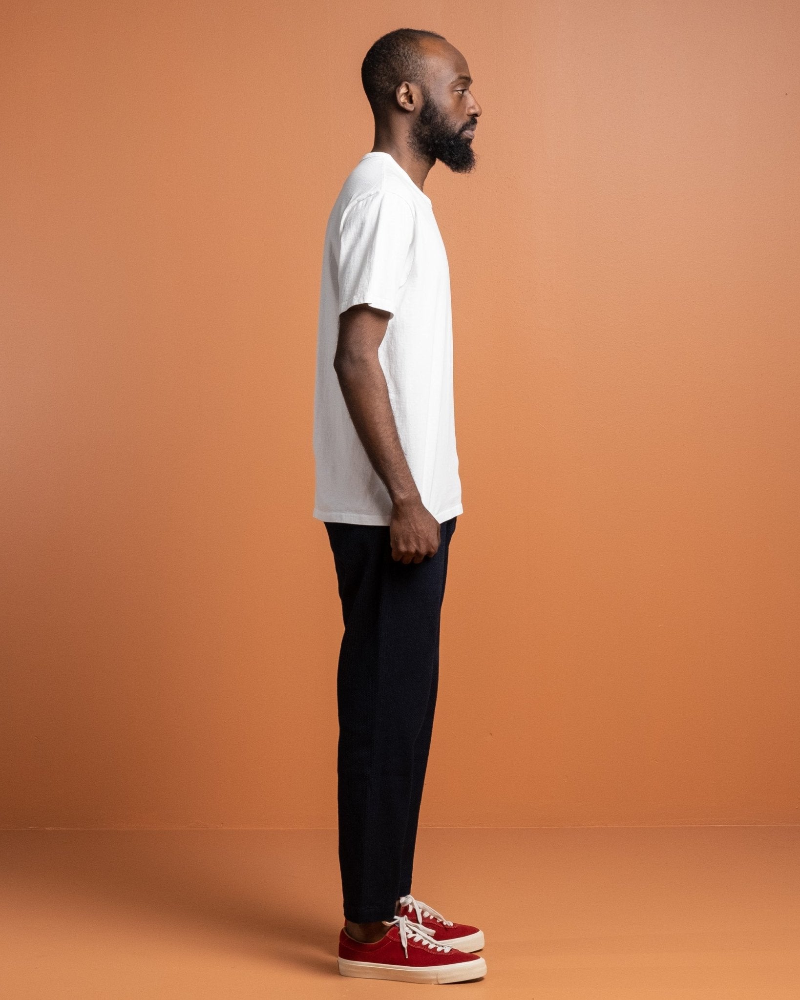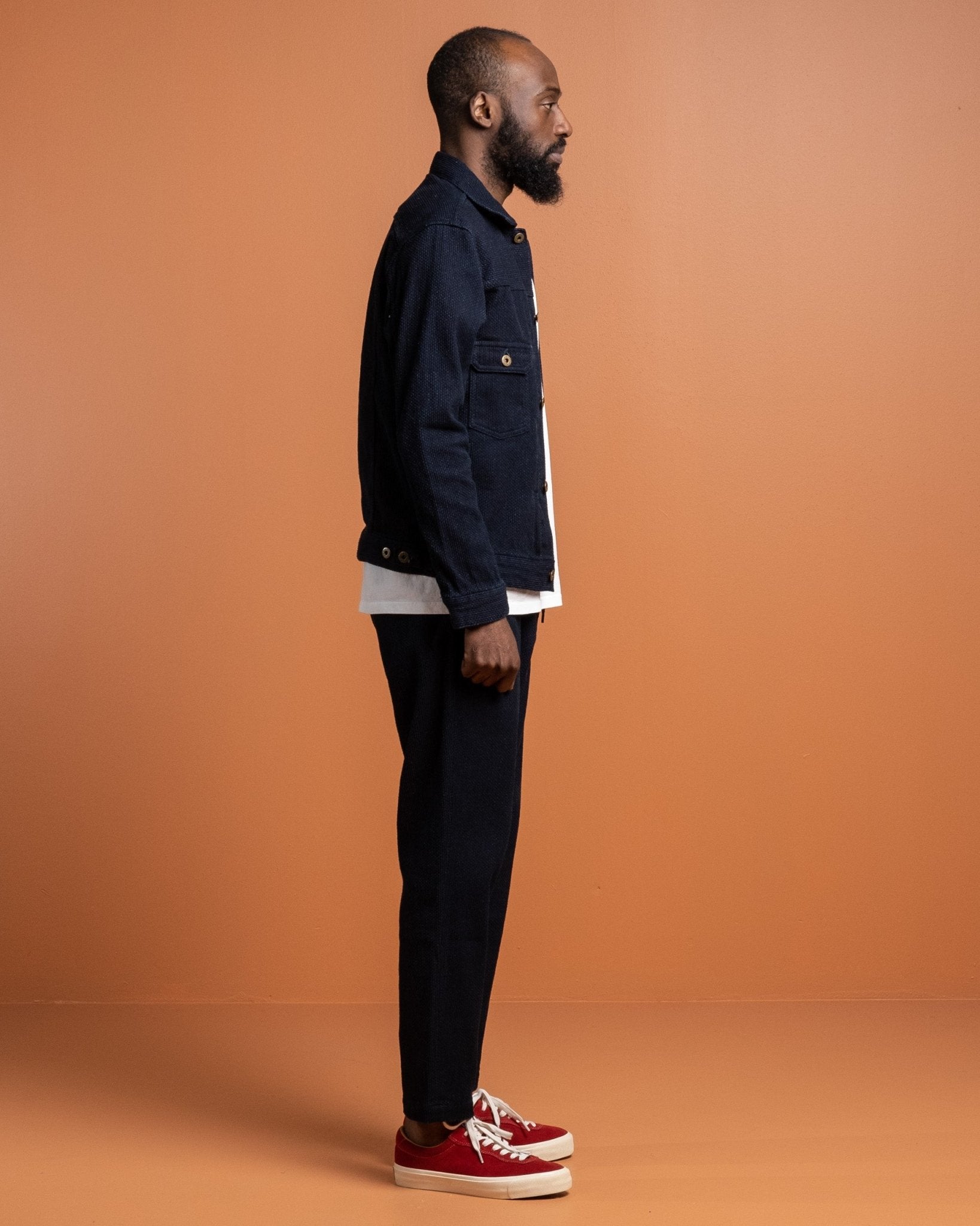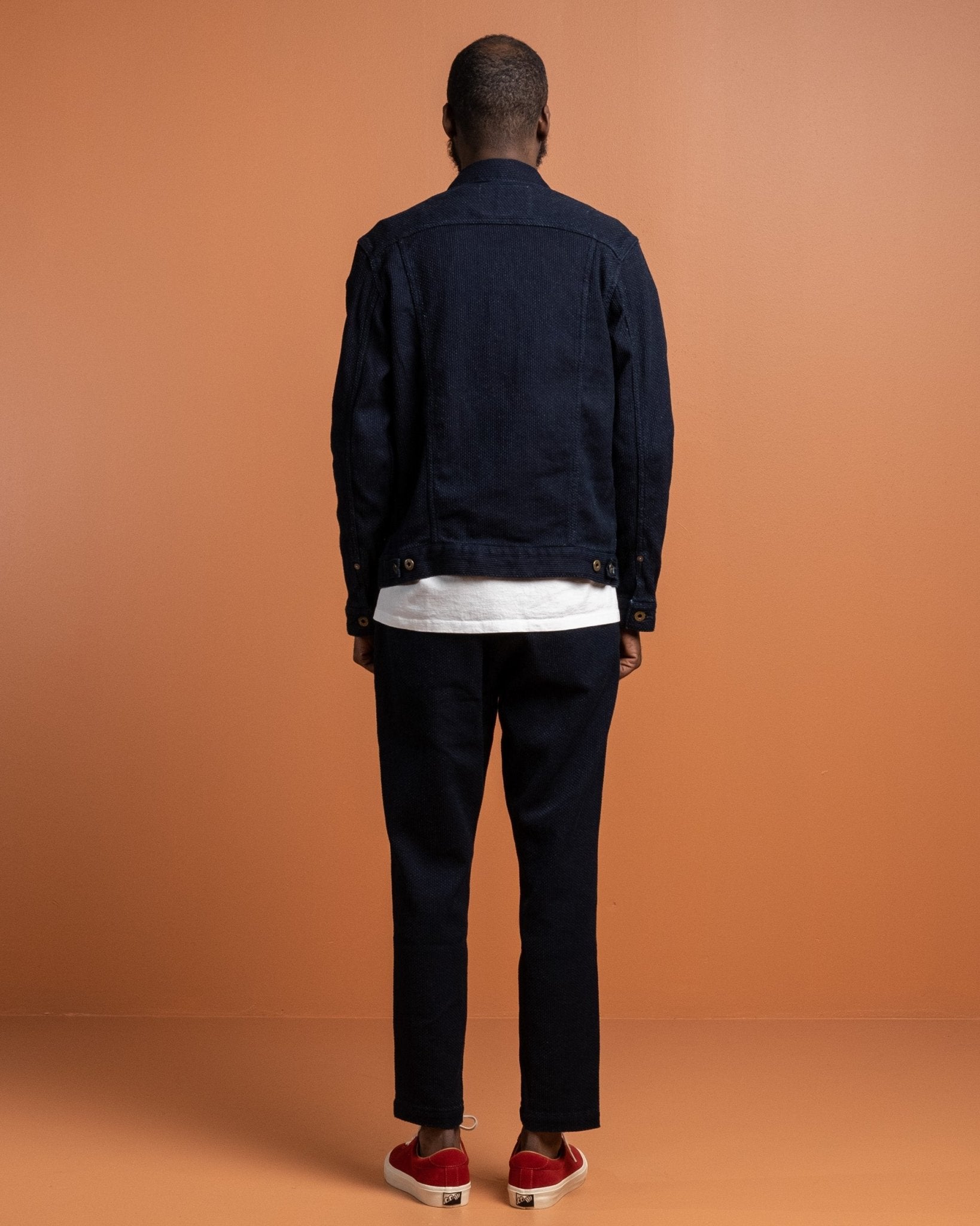 JBPT10043A Pantaloni Tapered Facili Sashiko di Japan Blue Jeans. Pantaloni dal taglio rilassato realizzati in tessuto di cotone sashiko con chiusura a zip. Due tasche laterali, due tasche posteriori e vita regolabile con cordoncino, oltre a passanti per cintura aggiunti. Tessuto fantastico che diventerà ancora migliore una volta che inizia a sbiadire con l'uso. Prodotto in Giappone.