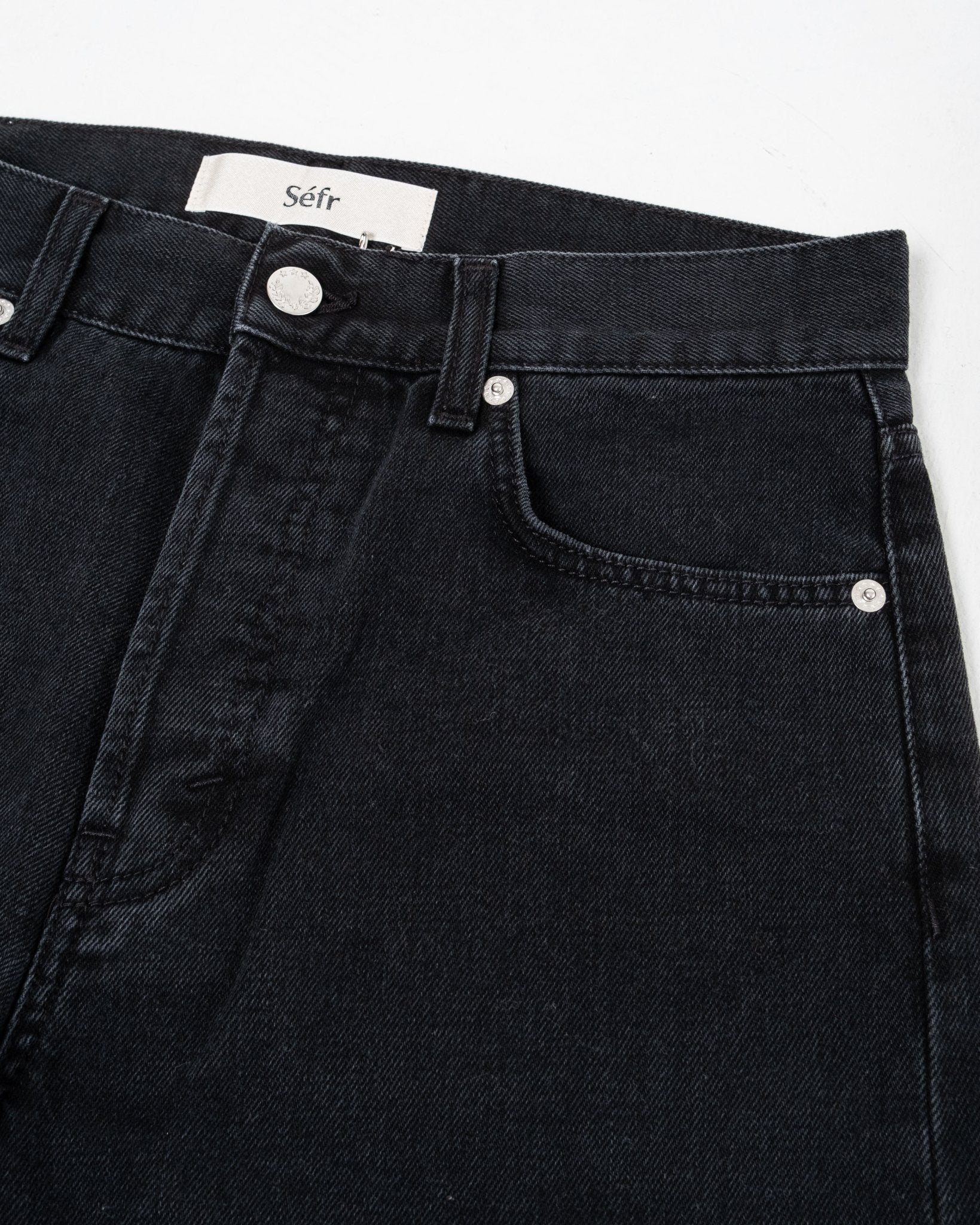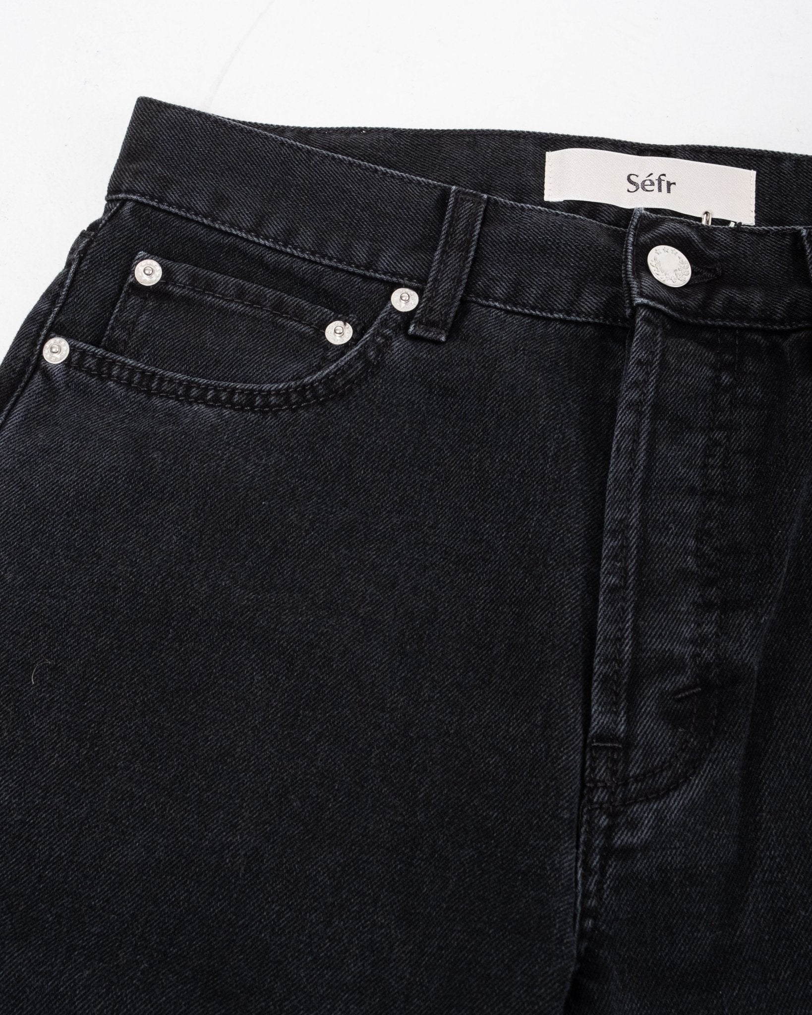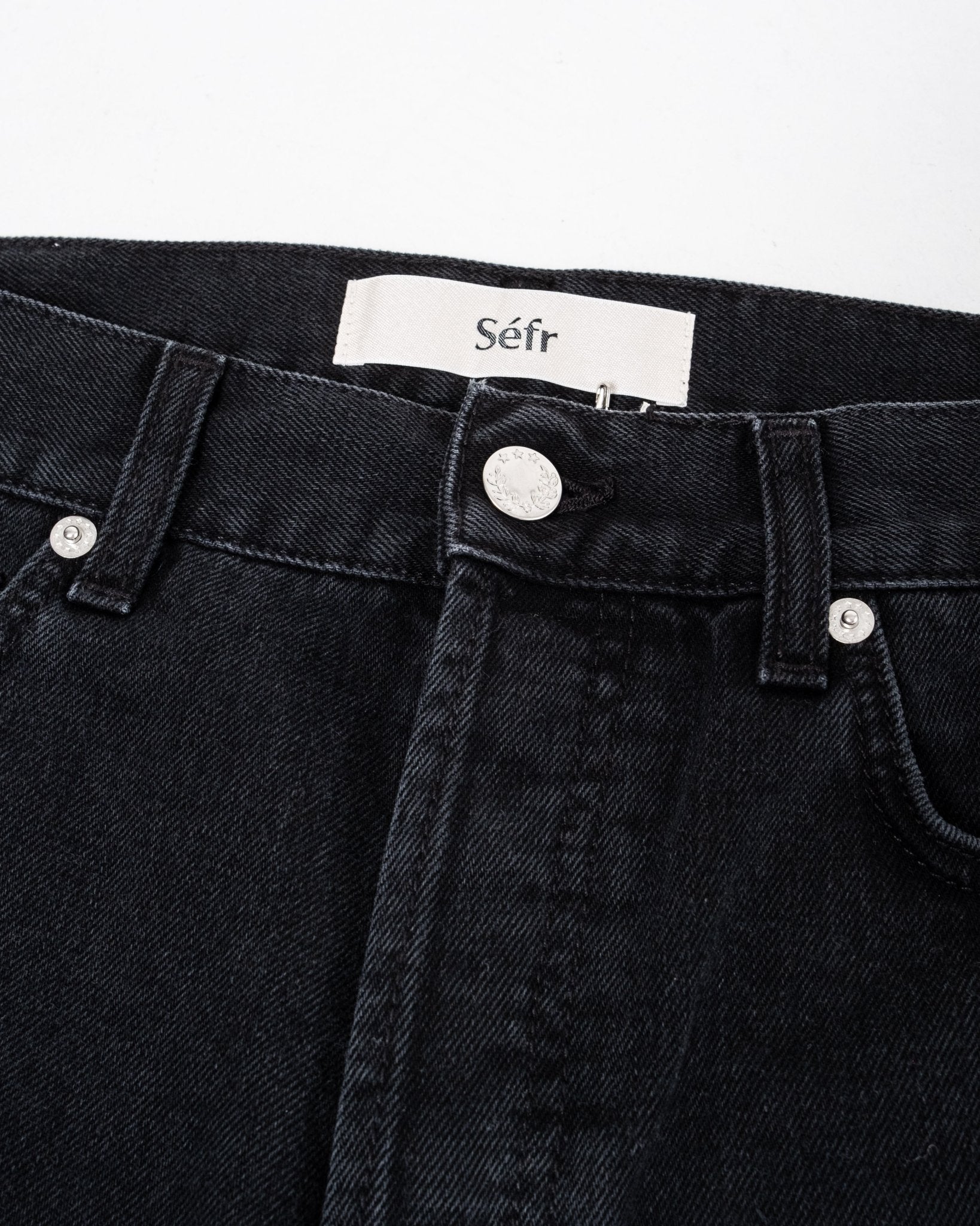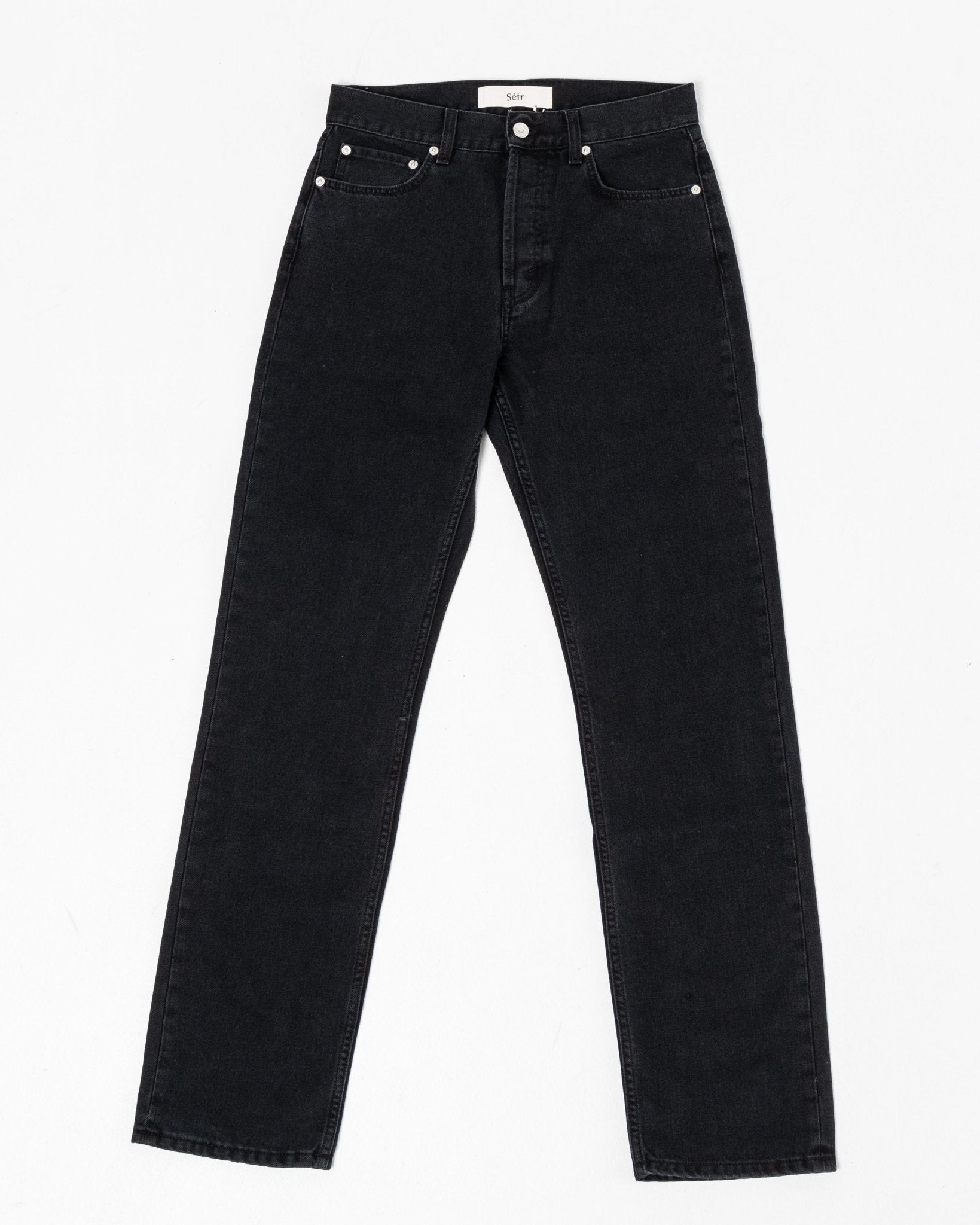 Jeans a taglio dritto in nero risciacquato di Séfr. Classico jeans a cinque tasche prodotto in cotone italiano da 13 oz. Chiusura con bottone frontale, taglio dritto e risciacquato una volta per una vestibilità morbida e confortevole fin dall'inizio. Prodotto in Lettonia.