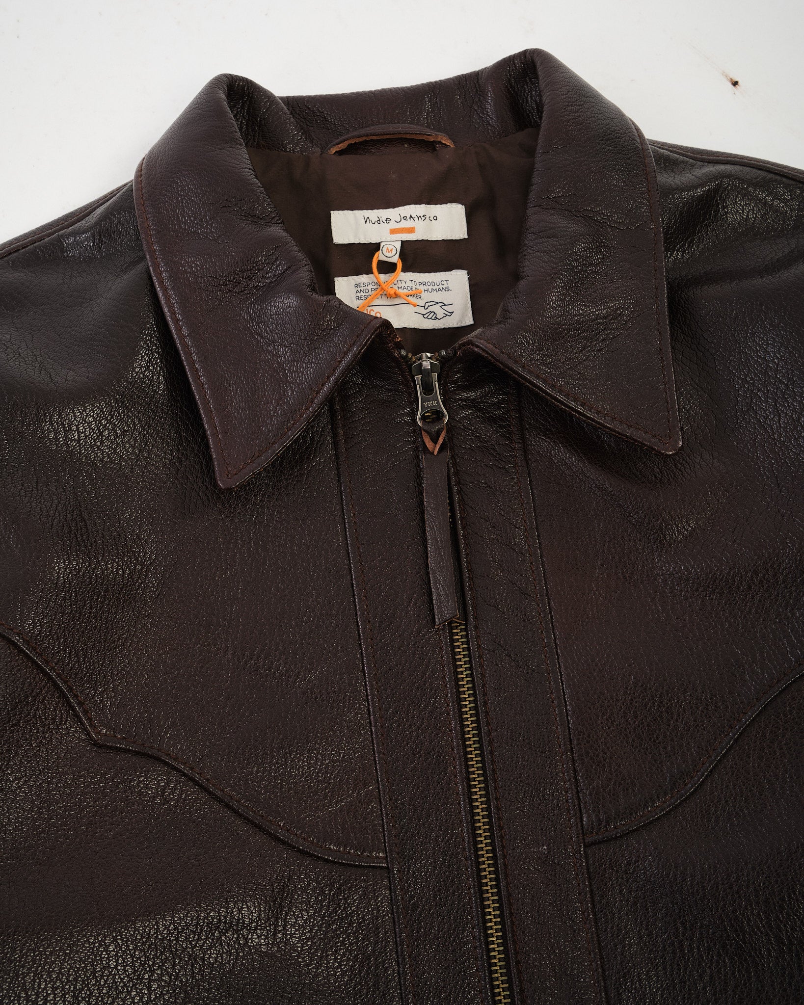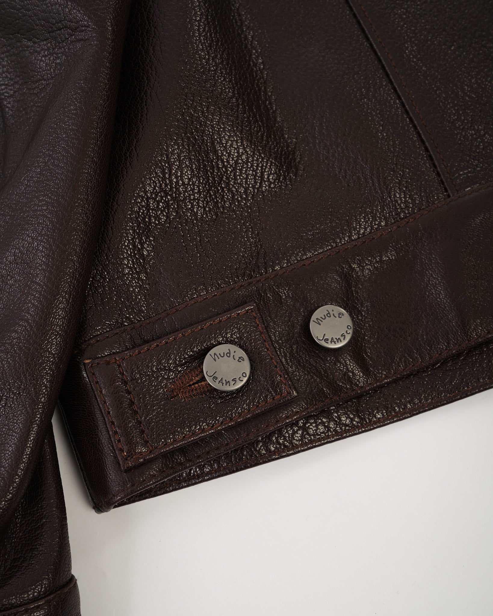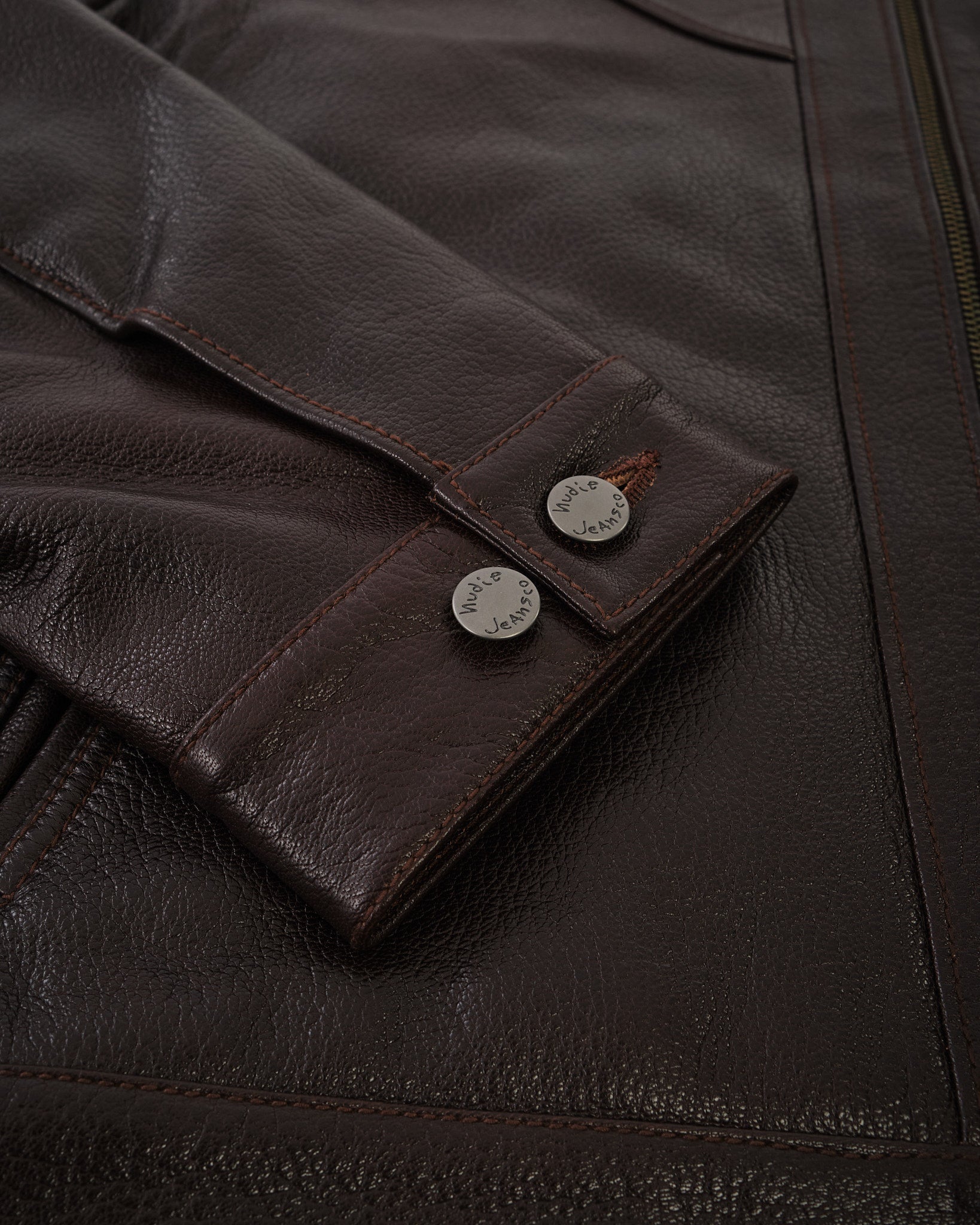 Il NUDIE JEANS CO. JOPPE WESTERN LEATHER JACKET BROWN è una giacca di pelle dritta e senza tempo, realizzata in pelle di capra semi-conciata vegetale morbida come il burro. La tonalità marrone cioccolato profondo è arricchita da un fine lustro, che esalta il ricco carattere della pelle.