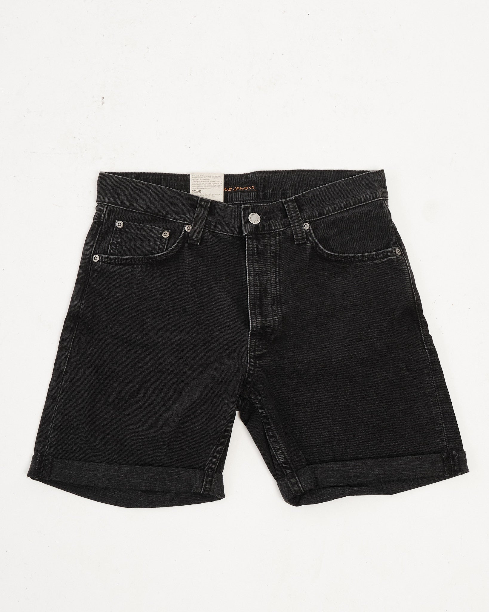Il denim è stato leggermente lavato per ottenere un tono nero smorzato che evidenzia la trama grossolana del tessuto, conferendo a questi shorts carattere senza sfarzo. Dettagli come filo nero sulle cuciture, rifiniture in rame, e una patch in Jacron offrono contrasto e personalità, mentre la chiusura con bottoni mantiene il design classico. Realizzati in Tunisia con tutti i segni distintivi dell'etica di sostenibilità di Nudie.
