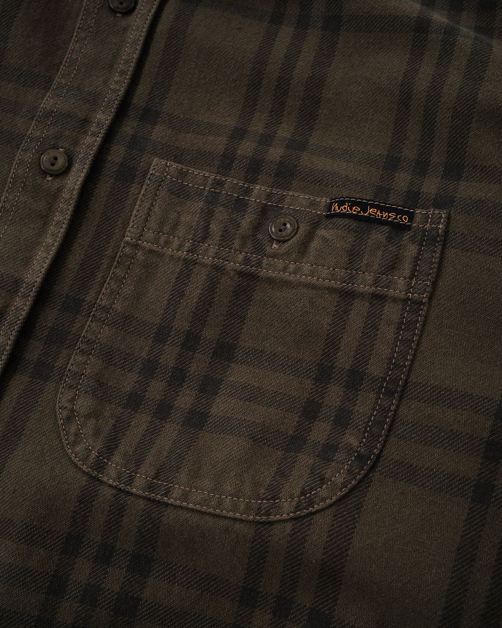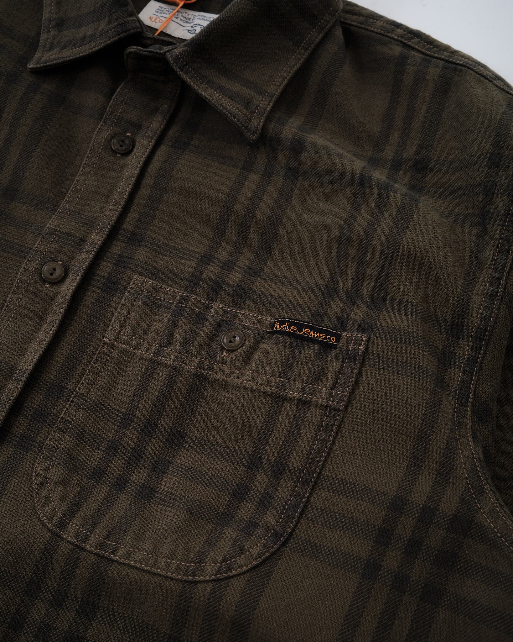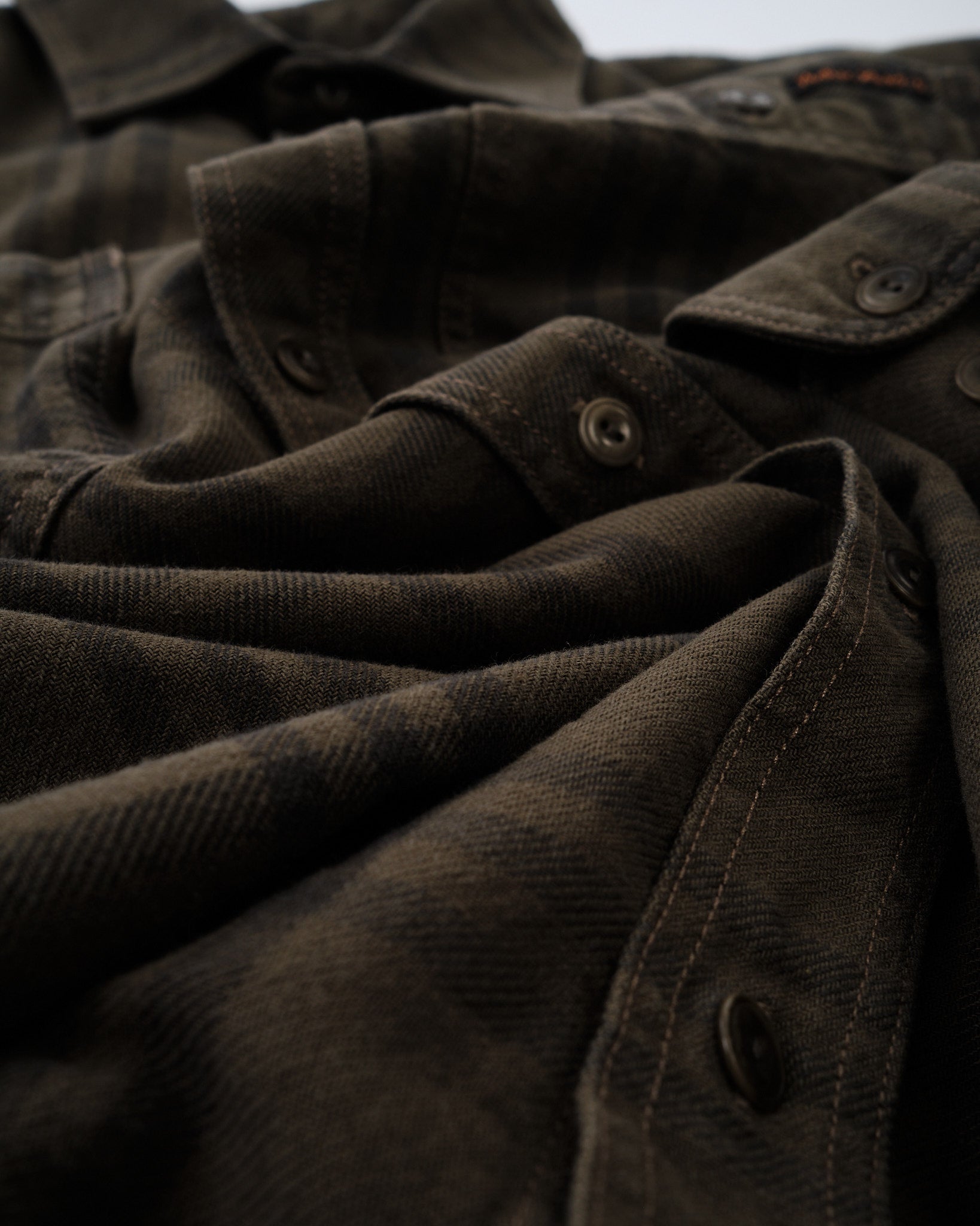 La CAMICIA A QUADRI OLIVA JULIAN WORKER DI NUDIE JEANS CO. è una camicia a maniche lunghe ispirata all'abbigliamento da lavoro classico, realizzata in twill di cotone organico robusto ma morbido. Il tessuto presenta una base verde oliva terroso con un motivo a quadri verde scuro, creando un look senza tempo e versatile.