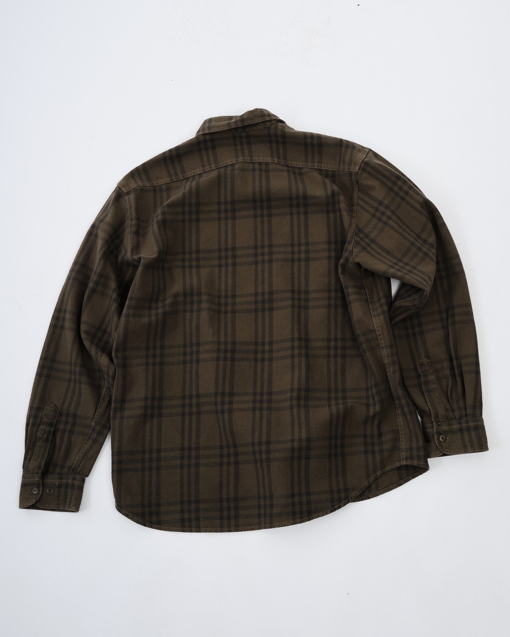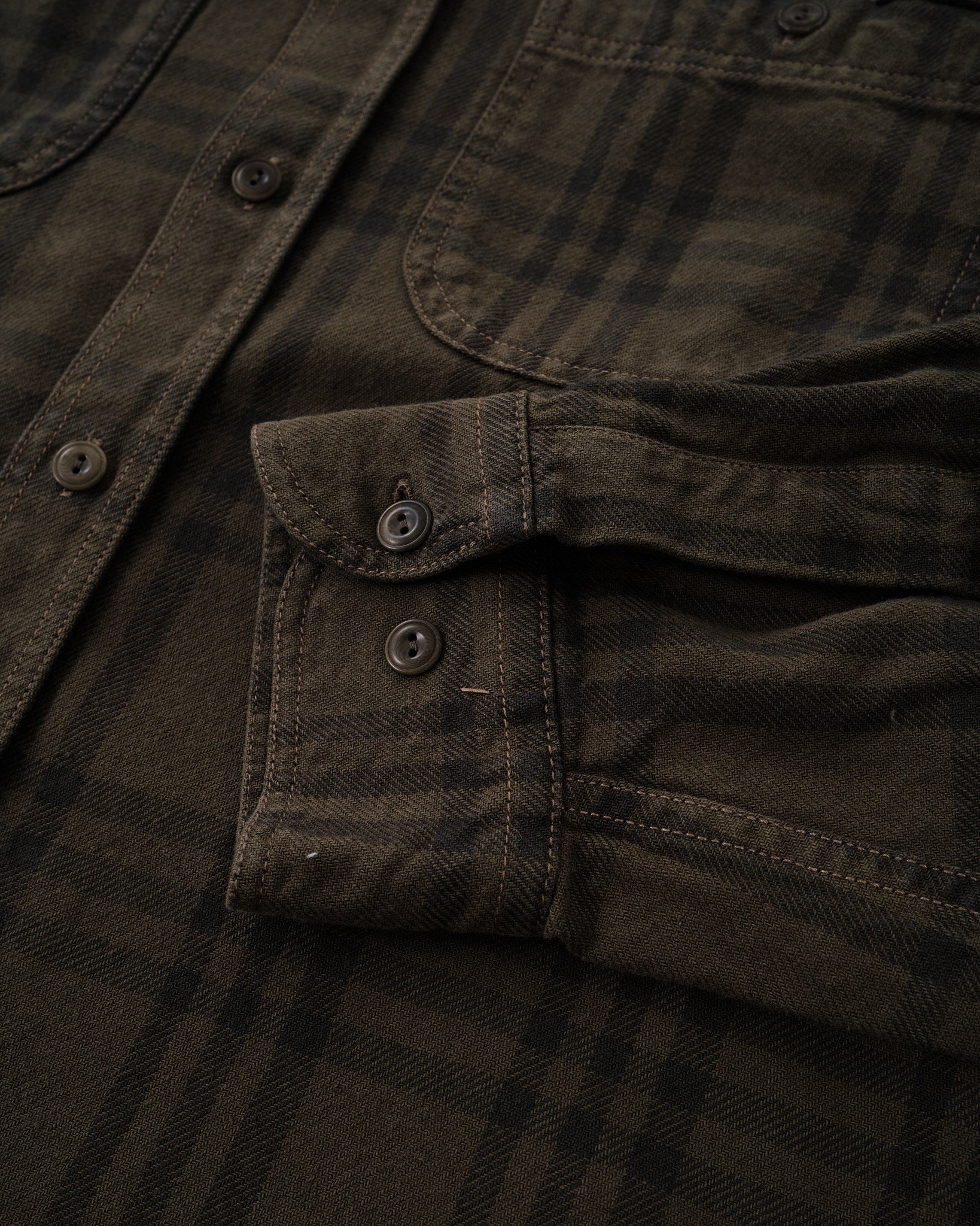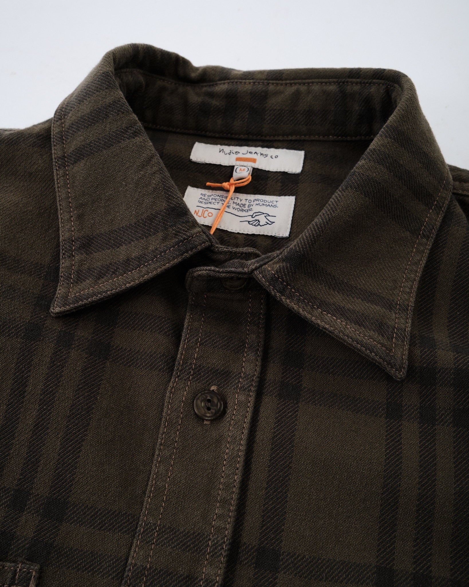 La CAMICIA A QUADRI OLIVA JULIAN WORKER DI NUDIE JEANS CO. è una camicia a maniche lunghe ispirata all'abbigliamento da lavoro classico, realizzata in twill di cotone organico robusto ma morbido. Il tessuto presenta una base verde oliva terroso con un motivo a quadri verde scuro, creando un look senza tempo e versatile.