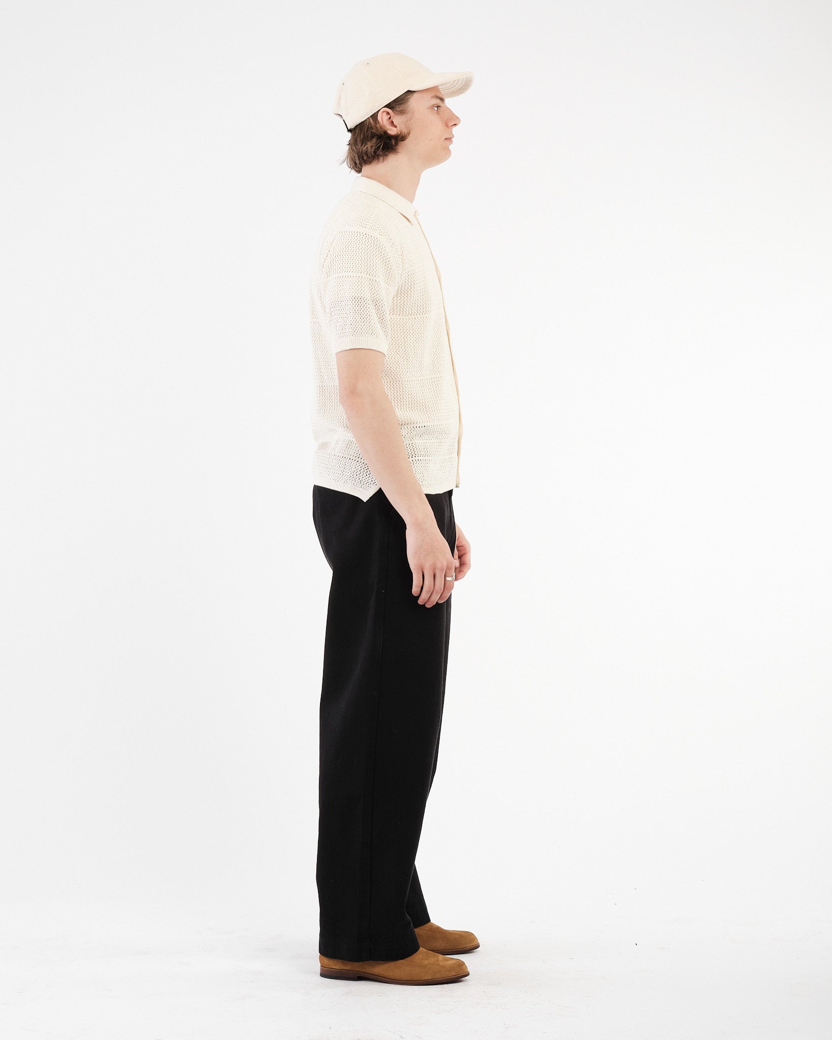 Incontra la KNITSHIRT01 — la primissima maglia a uncinetto di Merz b. Schwanen, ed è una bellezza. Realizzata in 100% cotone biologico, questo pezzo porta con sé uno stile estivo senza sforzo con una vestibilità rilassata, maniche corte e quella firma della texture a uncinetto che respira come una brezza. Sì, è un po' trasparente — ma è tutto parte del fascino.