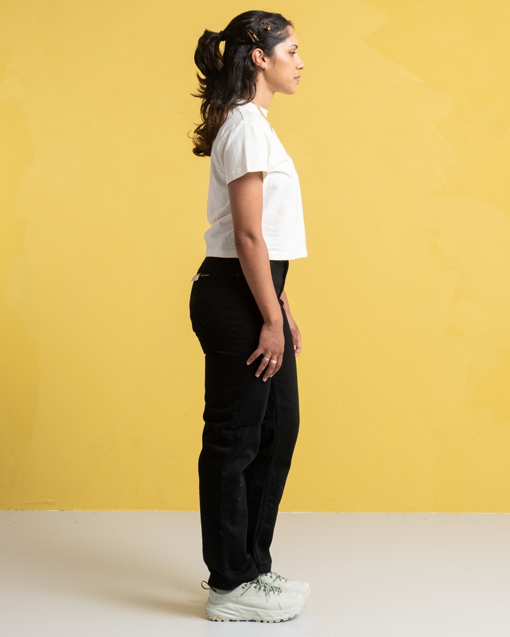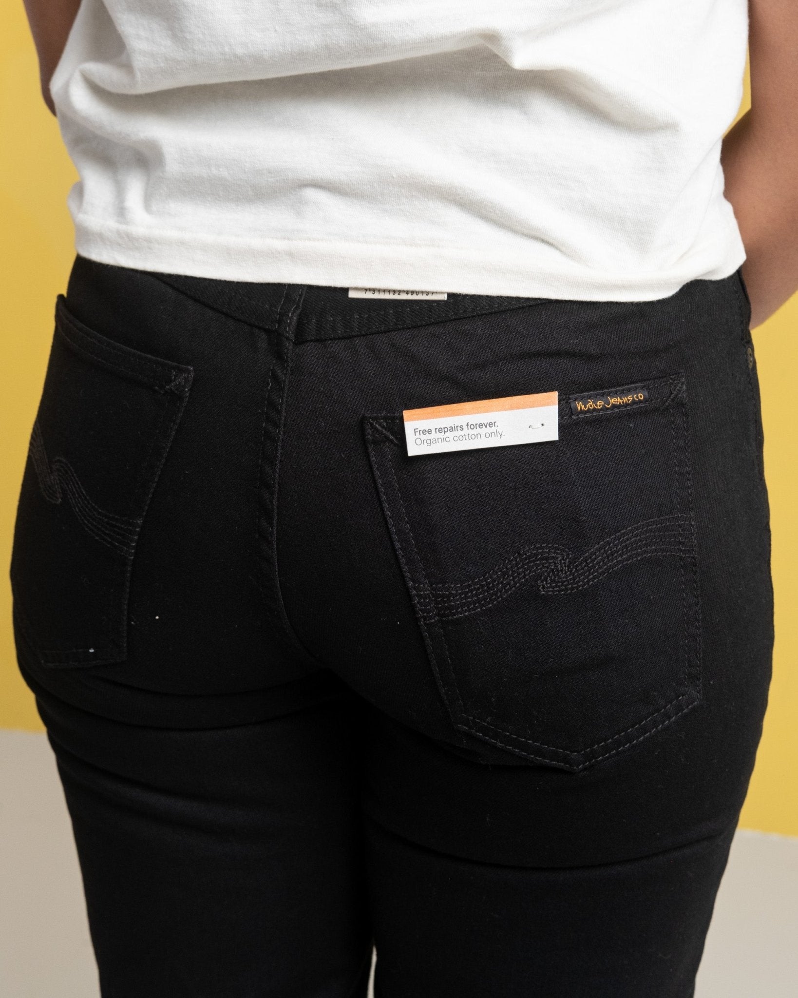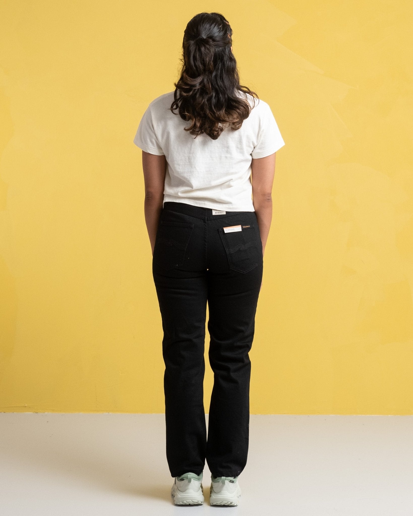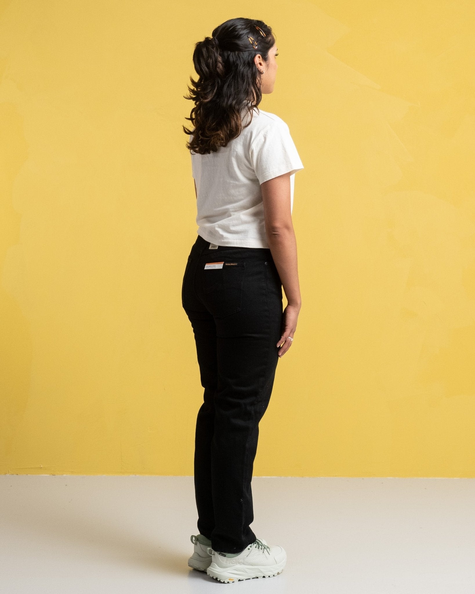 Lofty Lo Black Soul di Nudie Jeans Co. Jeans da donna dal taglio rilassato con vita alta e gambe dritte. Qui in un bel lavaggio nero con un sottile aspetto consumato. Realizzati in 80% cotone biologico e 20% cotone riciclato. Prodotto in Tunisia.