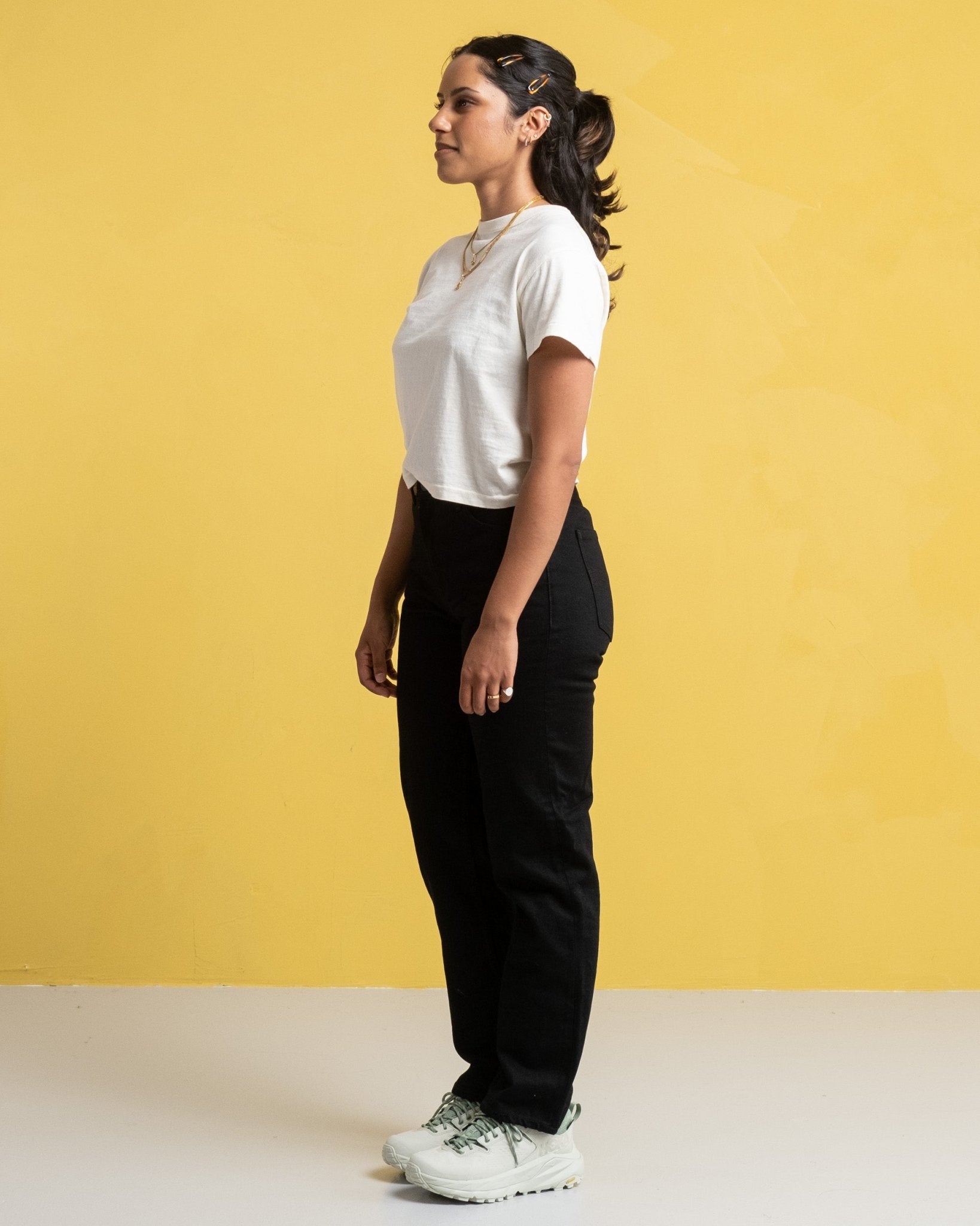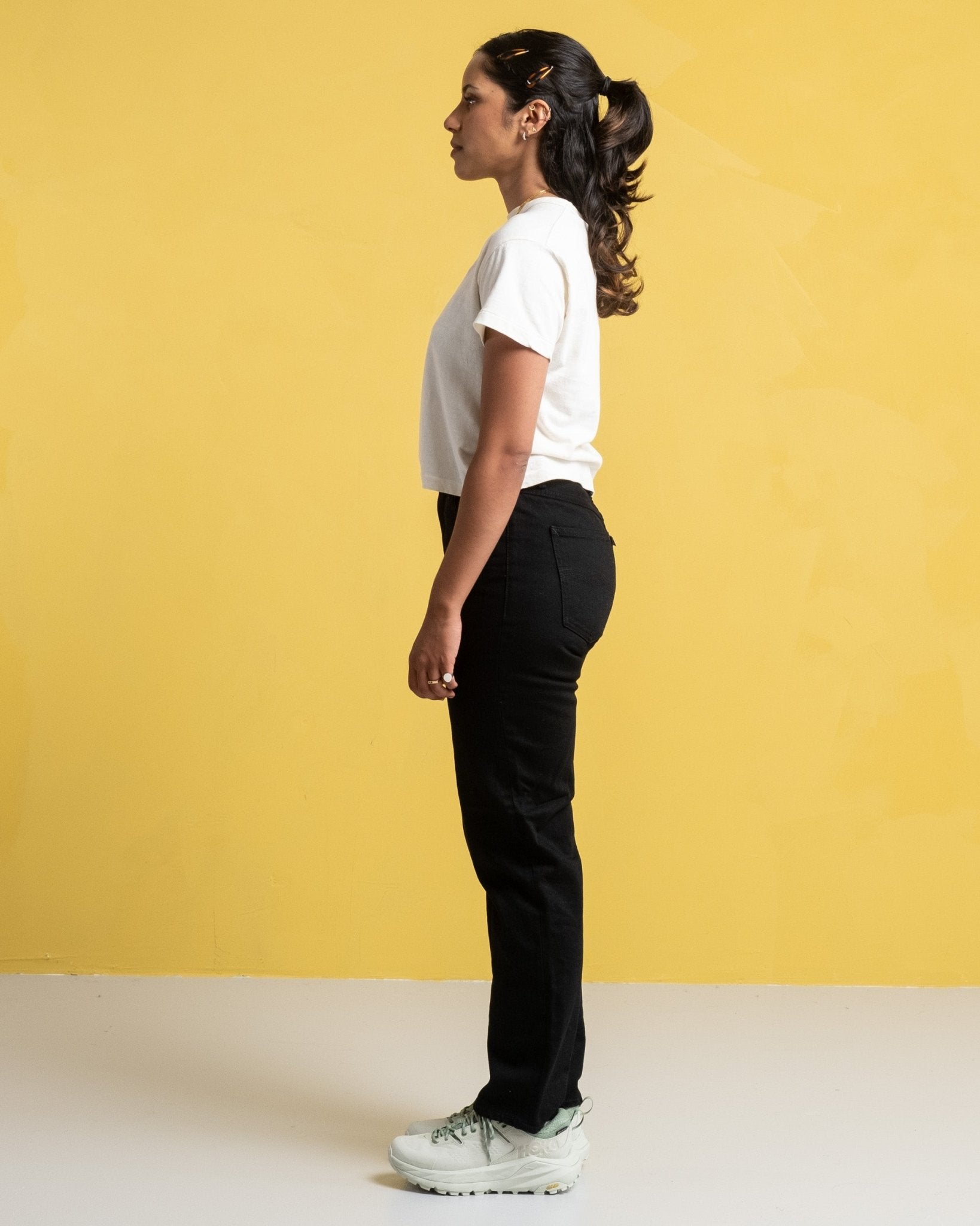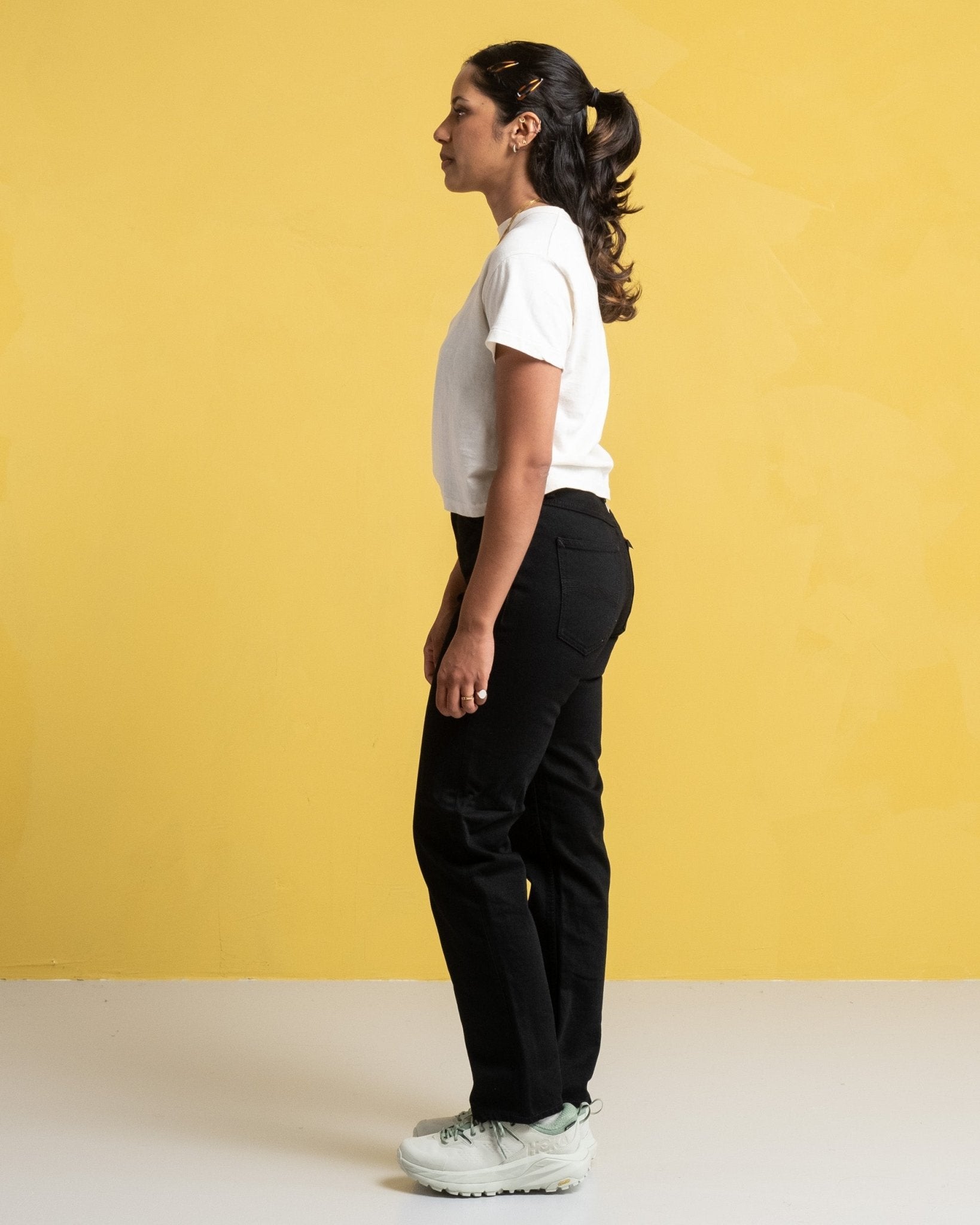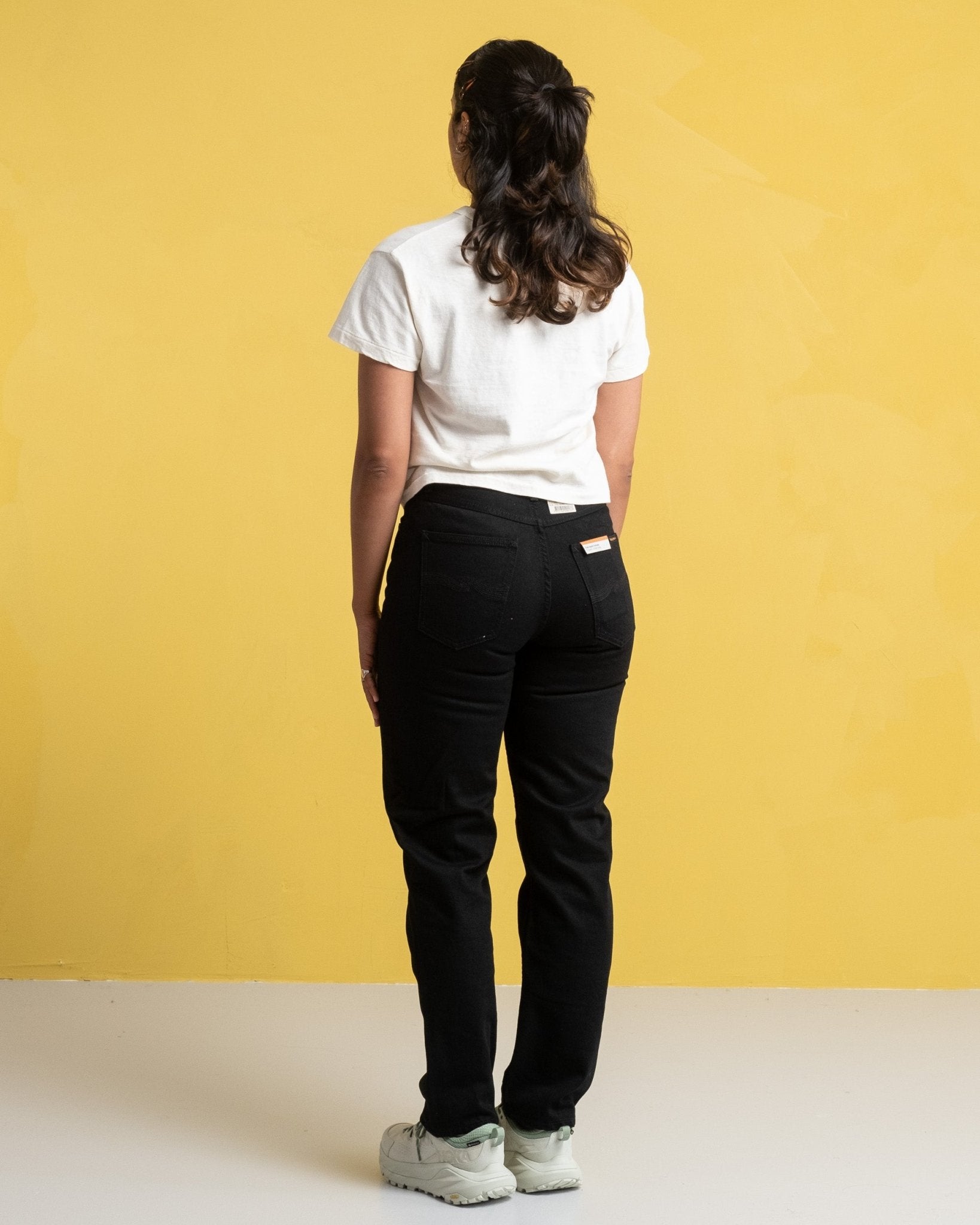 Lofty Lo Black Soul di Nudie Jeans Co. Jeans da donna dal taglio rilassato con vita alta e gambe dritte. Qui in un bel lavaggio nero con un sottile aspetto consumato. Realizzati in 80% cotone biologico e 20% cotone riciclato. Prodotto in Tunisia.