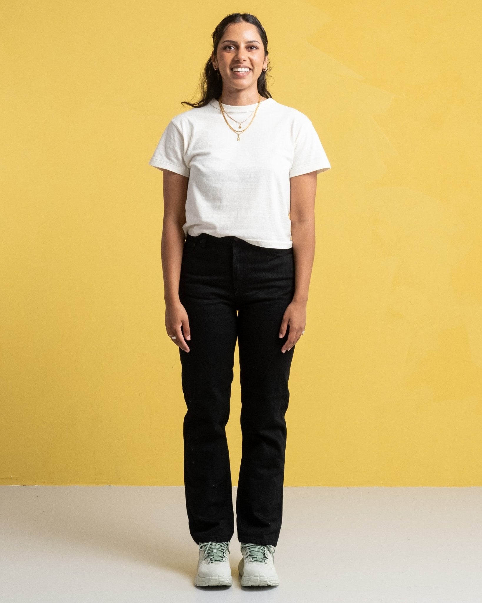 Celeste è alta 170 cm, di corporatura regolare e indossa una 28/30.