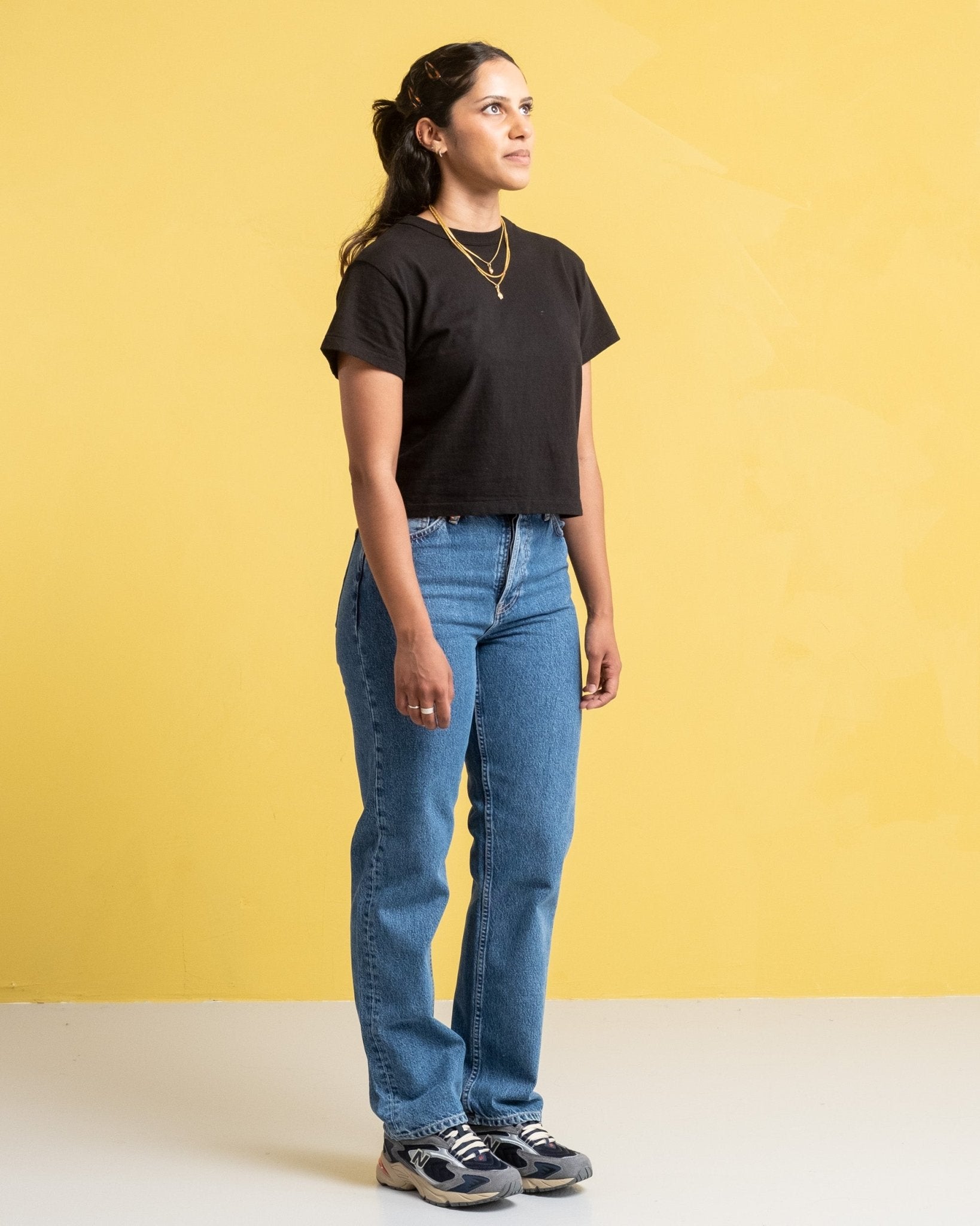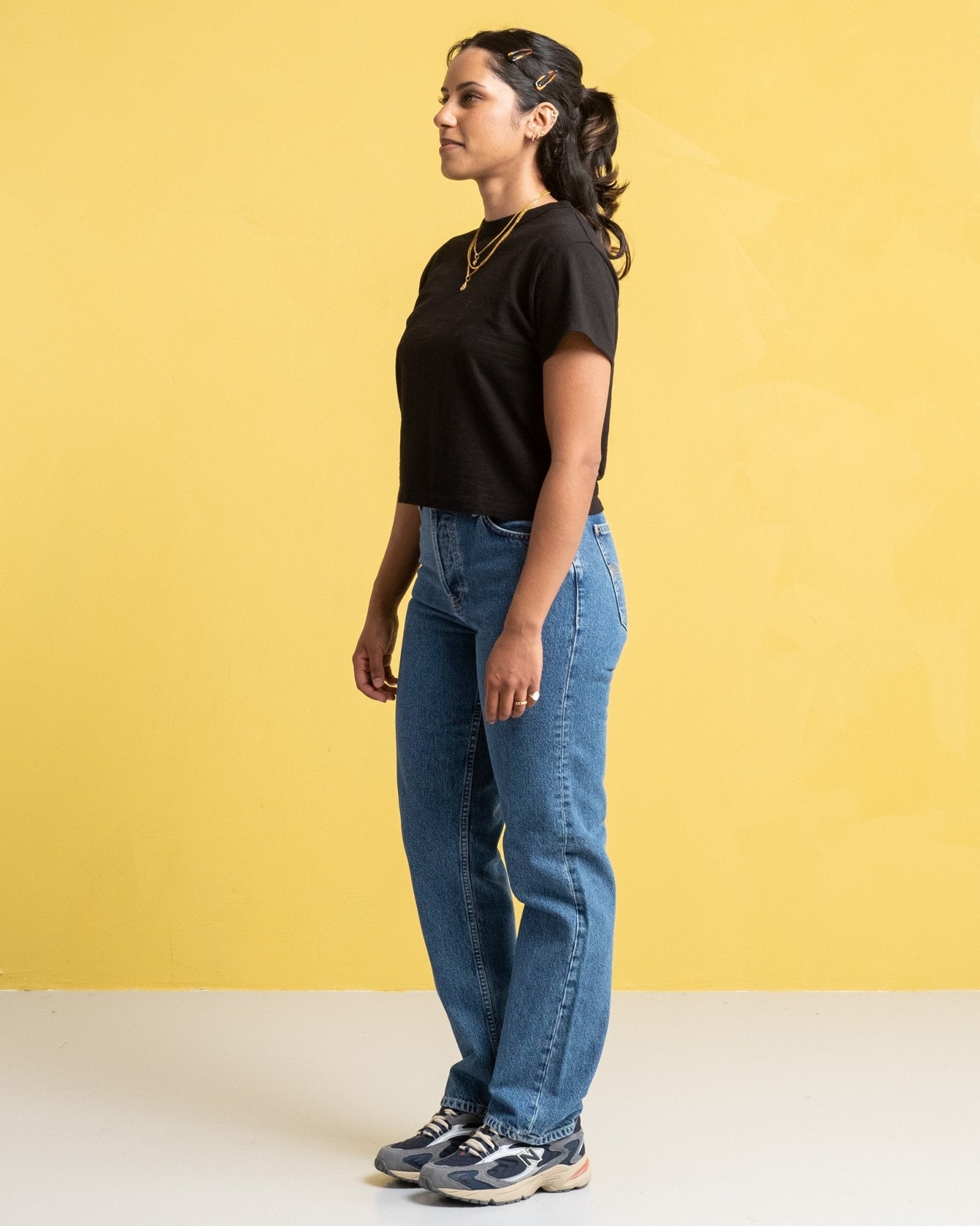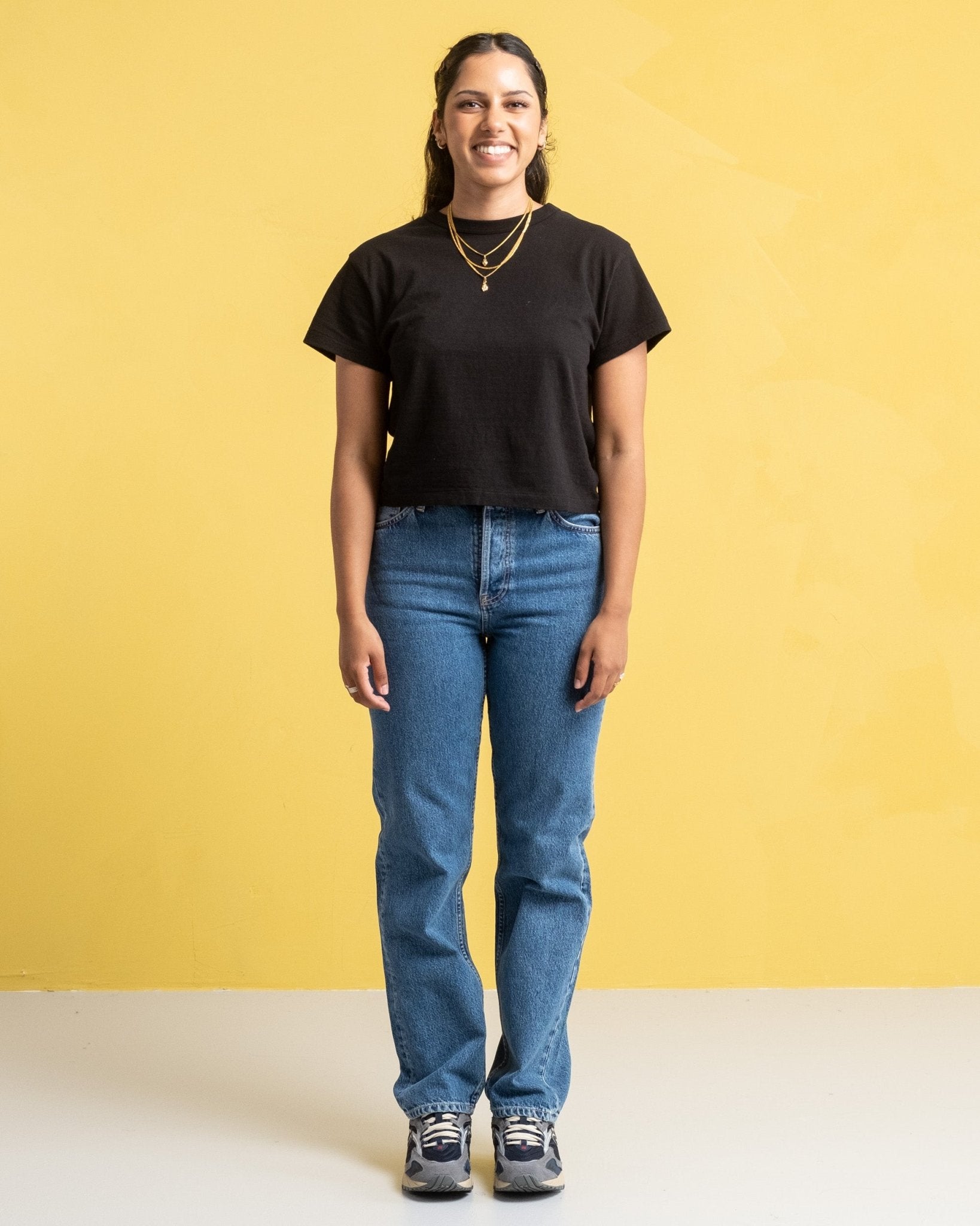 Celeste è alta 170 cm, di corporatura regolare e indossa una 28/30.